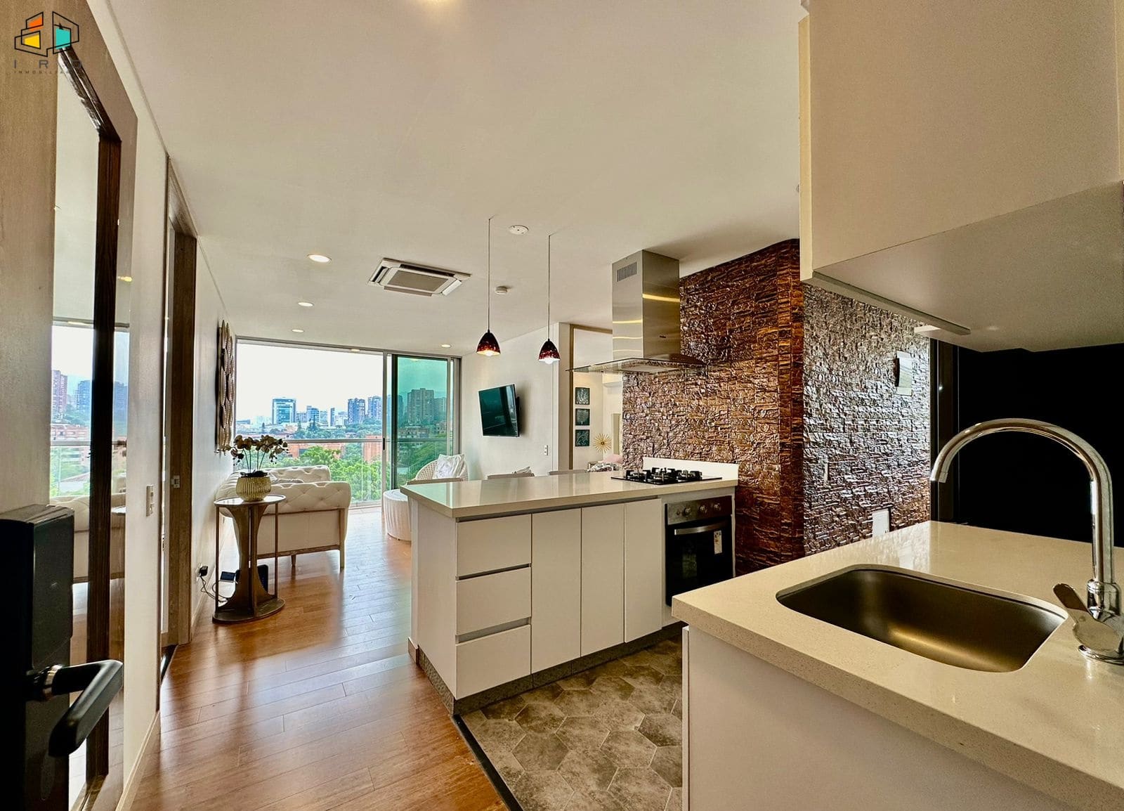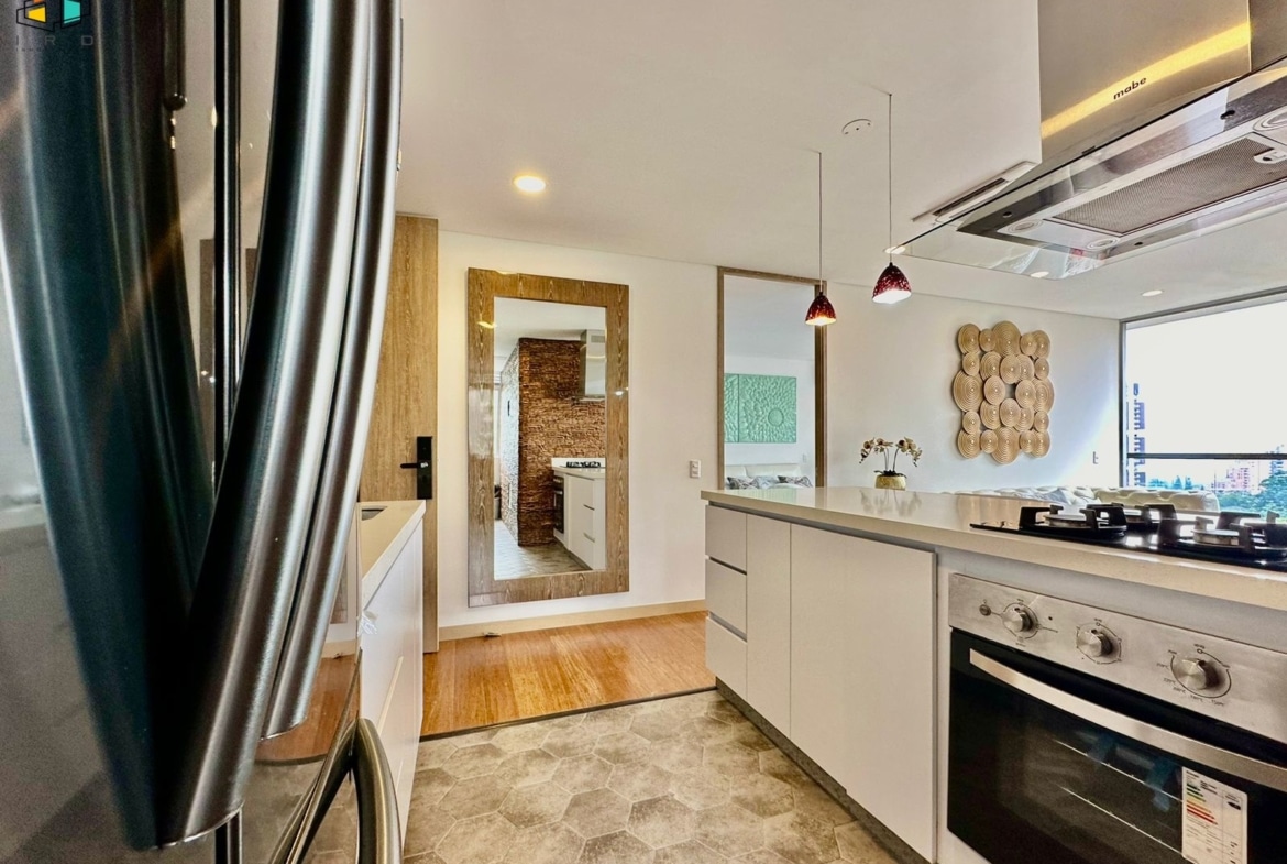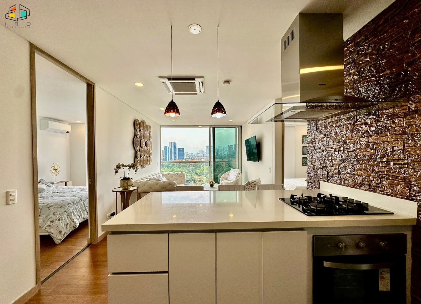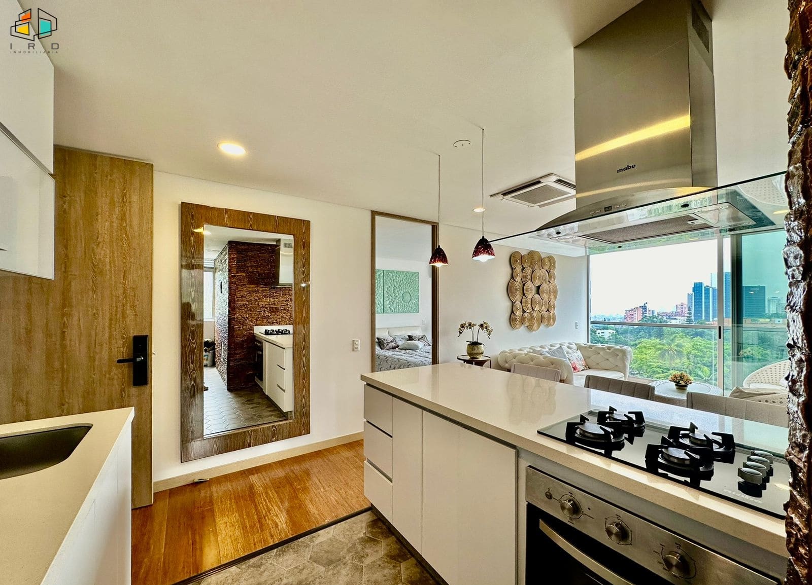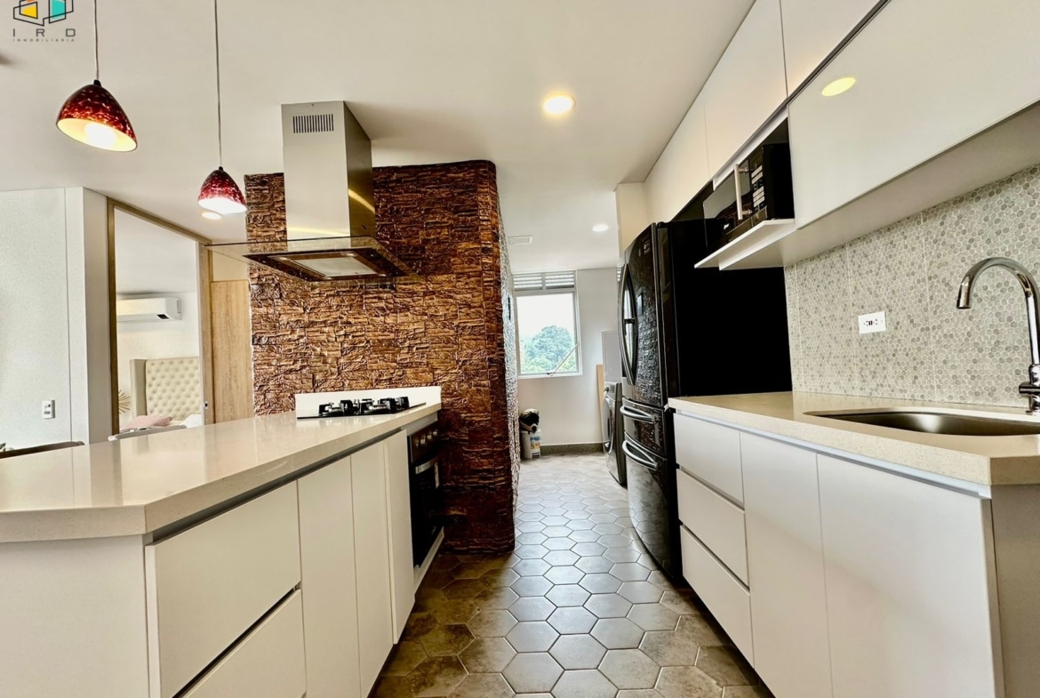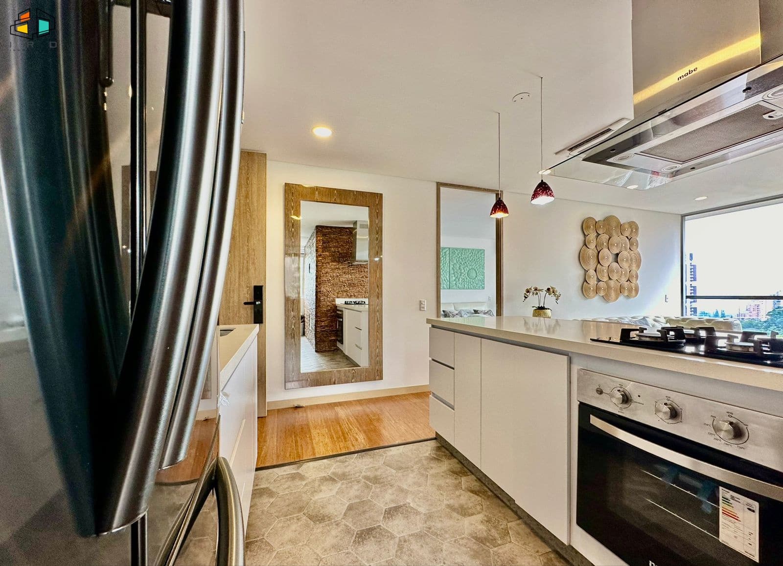 La cocina es integral, de concepto abierto, con acabados modernos. Incluye dos mesones, horno, campana extractora tipo americana y se conecta de manera práctica con el área social. Cuenta además con zona de ropas equipada con calentador de agua. Los acabados incluyen pisos en madera y cerámica en la cocina. Incluido en el alquiler: