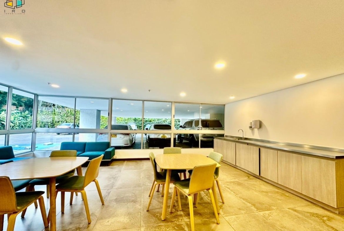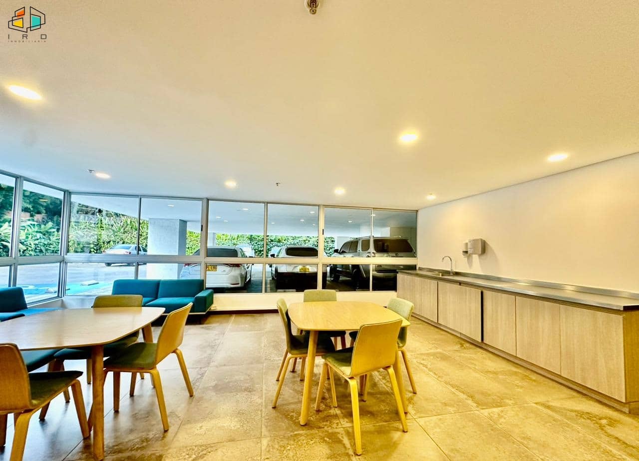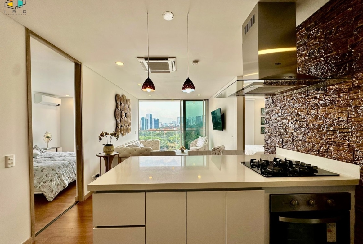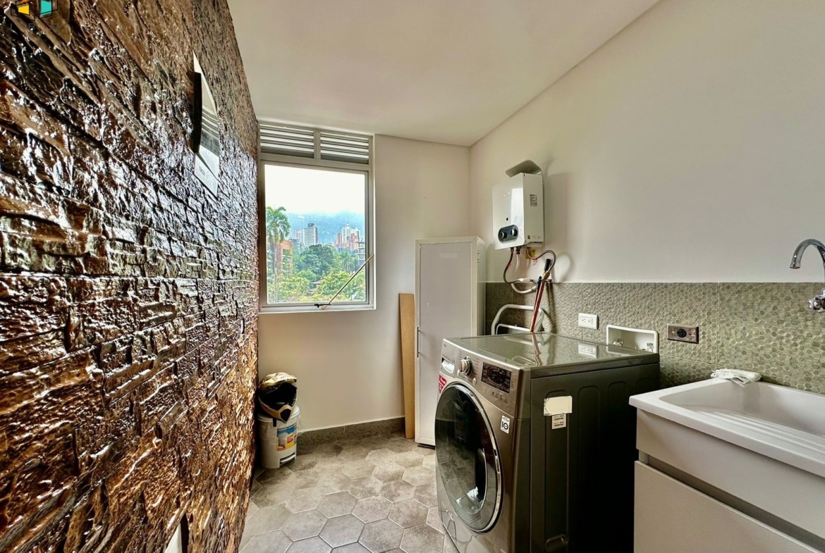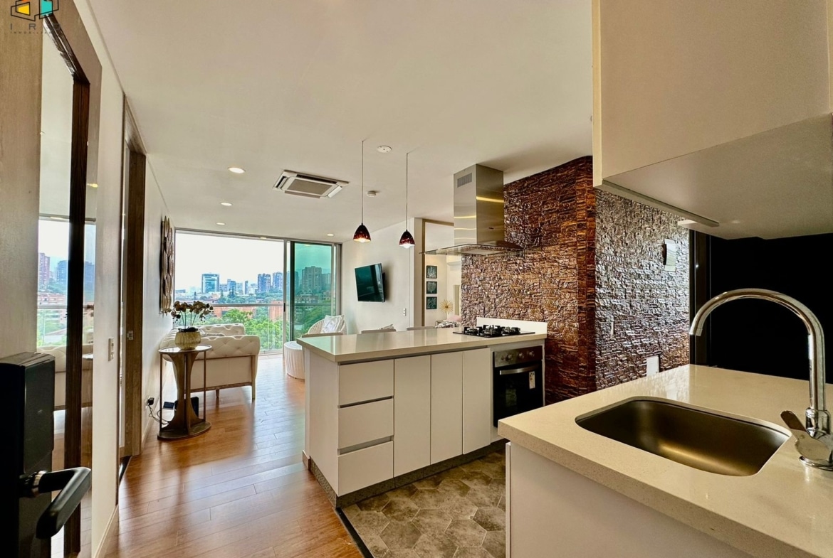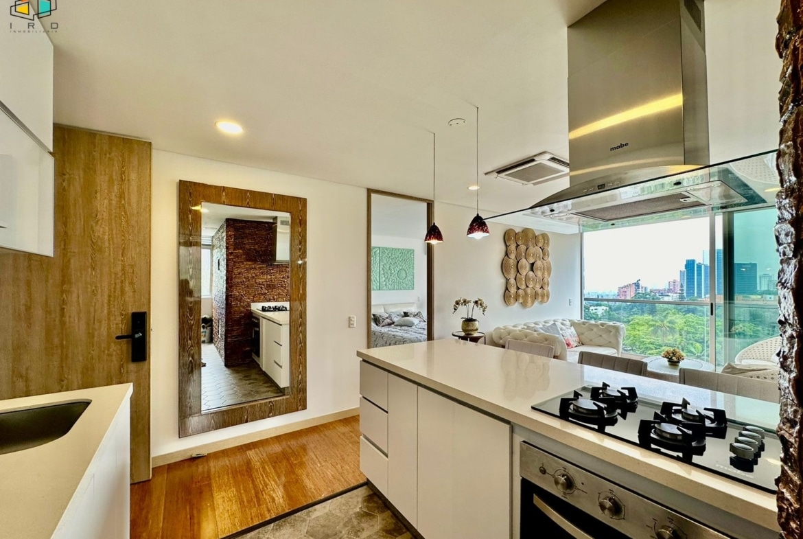 La cocina es integral, de concepto abierto, con acabados modernos. Incluye dos mesones, horno, campana extractora tipo americana y se conecta de manera práctica con el área social. Cuenta además con zona de ropas equipada con calentador de agua. Los acabados incluyen pisos en madera y cerámica en la cocina. Incluido en el alquiler: