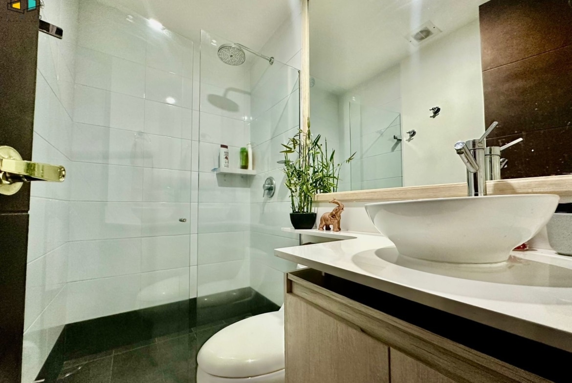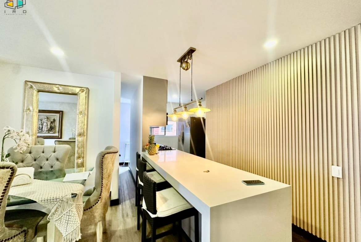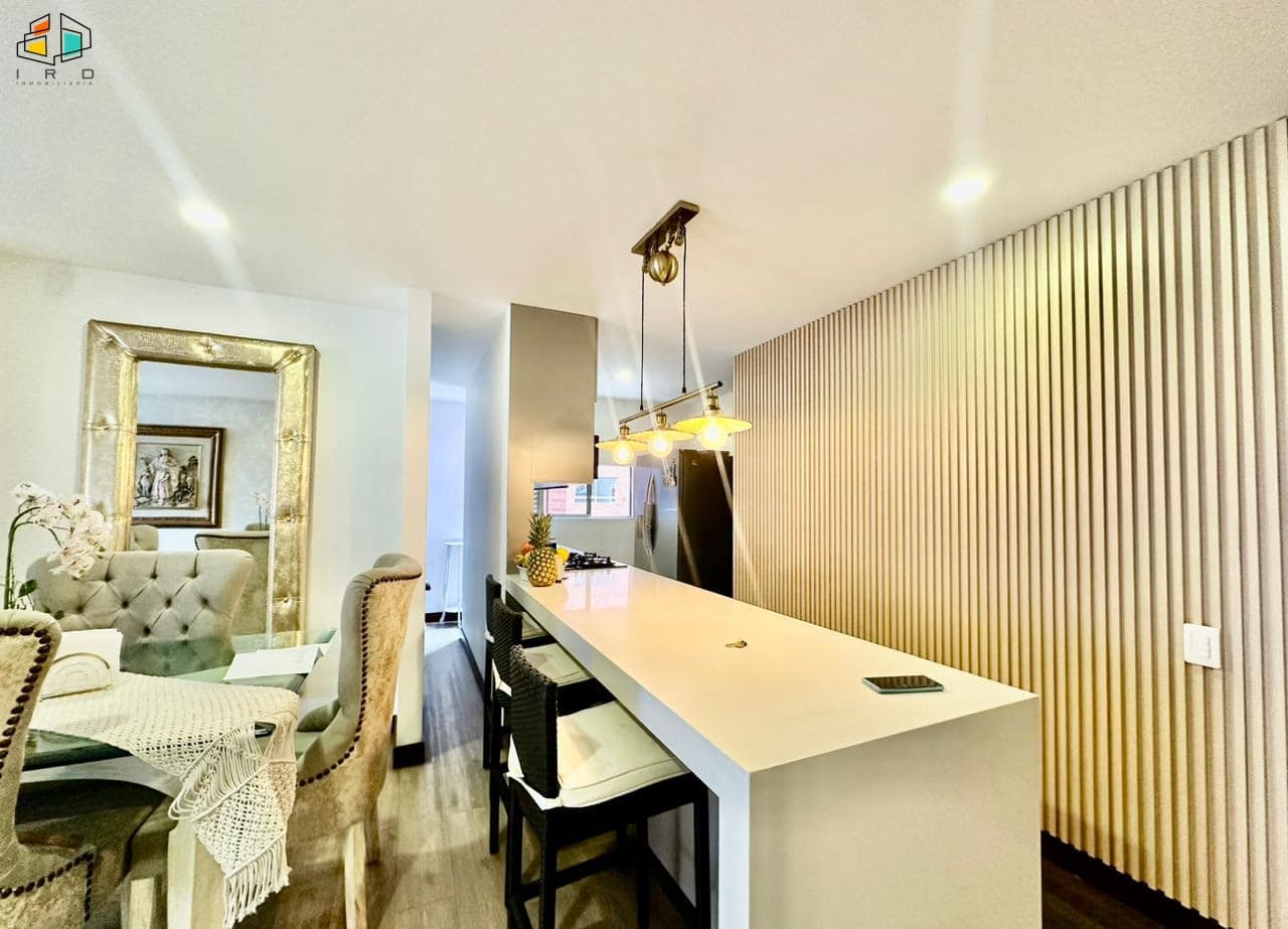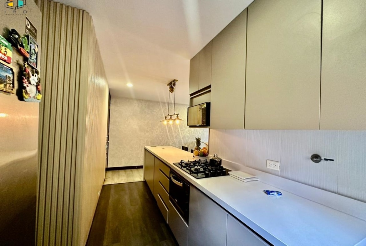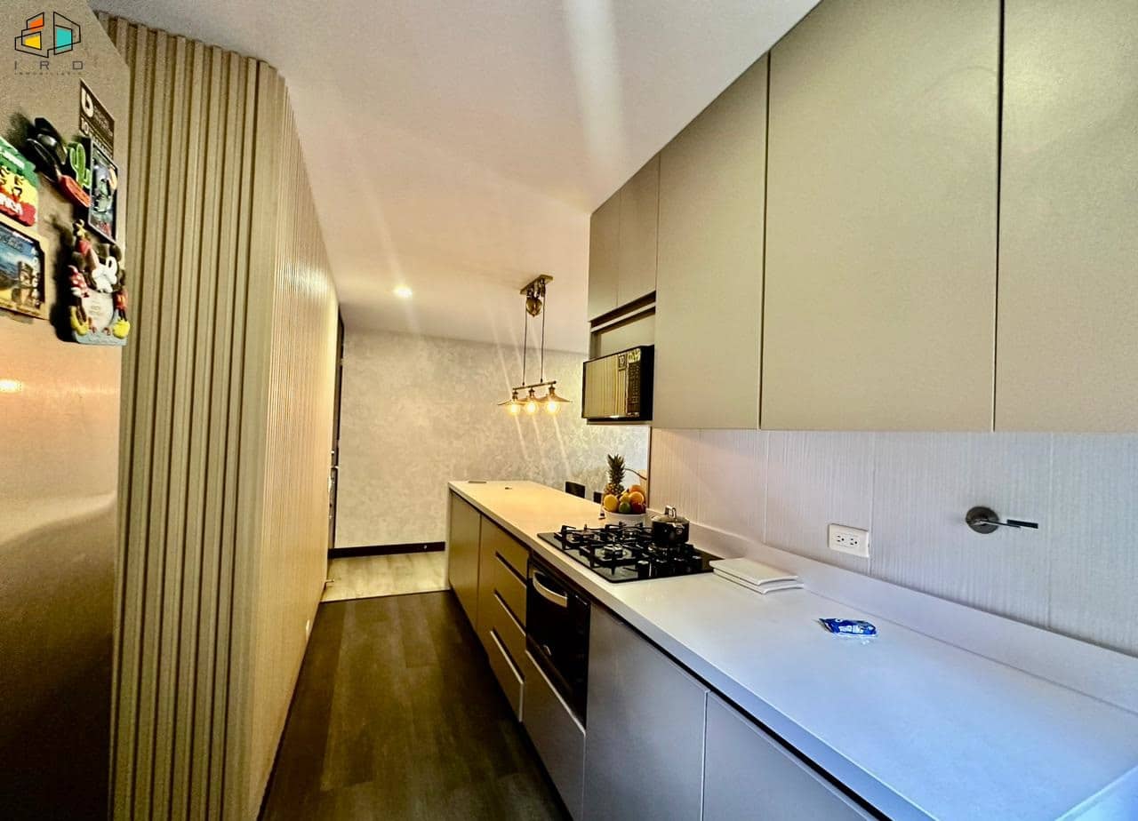 Dispone de cuatro habitaciones, incluida una habitación de servicio; todas equipadas con baño privado, garantizando privacidad y comodidad. A ello se suma un closet de lino para almacenamiento adicional y dos closets adicionales ubicados en las habitaciones auxiliares. Además, encontrarás un baño social, para un total de cinco baños perfectamente diseñados. La sala-comedor se destaca por su amplitud y luminosidad, resaltada por grandes ventanales que van de piso a techo, los cuales no solo inundan el espacio con luz natural, sino que también ofrecen acceso directo al balcón. El amplio balcón es un verdadero punto fuerte del apartamento, ya que brinda una encantadora vista panorámica hacia la ciudad. La cocina se presenta bajo un moderno concepto abierto e integra una barra estilo americana ideal para compartir momentos culinarios. Adicionalmente, el inmueble cuenta con una amplia sala versátil que puede ser utilizada como sala de estudio, espacio para TV o biblioteca, adaptándose a las necesidades de quienes lo habiten. Los pisos están revestidos en madera laminada, lo que añade un toque acogedor y elegante a cada ambiente. El área de ropas está perfectamente delimitada para garantizar independencia y funcionalidad. En cuanto a estacionamiento, el apartamento incluye un parqueadero doble en línea, ofreciendo suficiente capacidad para dos vehículos.