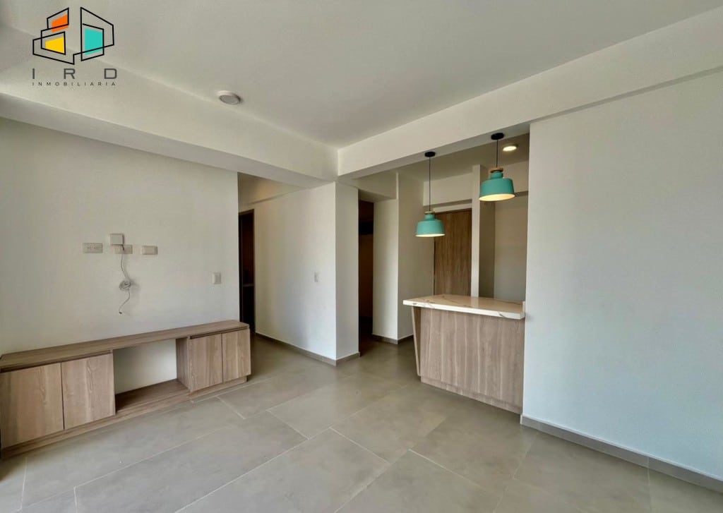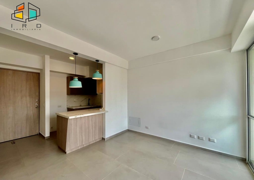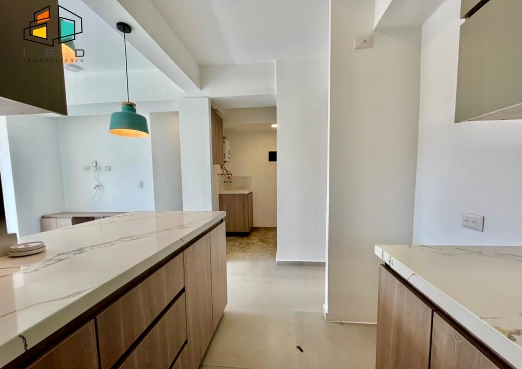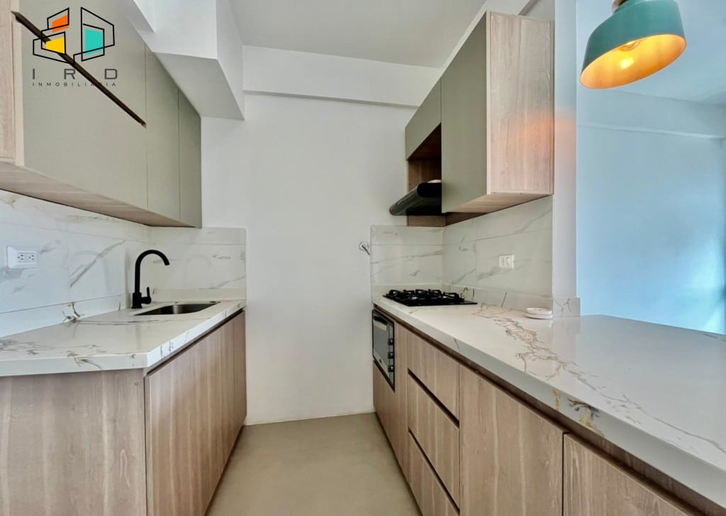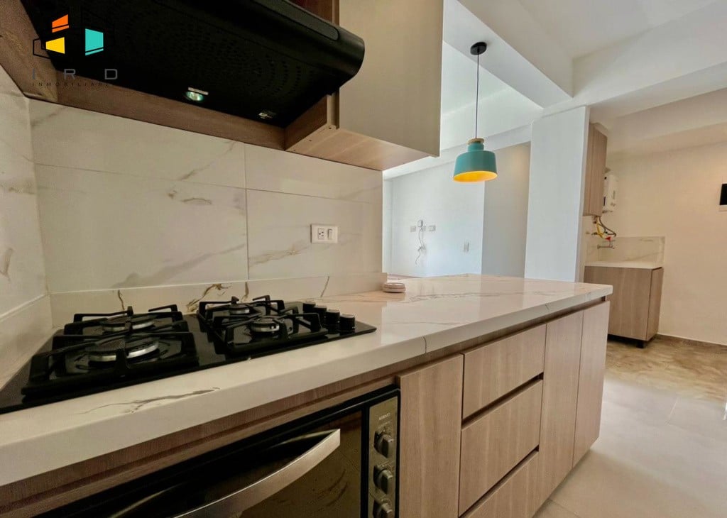 * La cocina es de concepto abierto y está completamente equipada; incluye gabinetes tanto superiores como inferiores, horno, campana extractora y una cubierta de 4 puestos a gas. Además, cuenta con una barra americana que se conecta con el área social.