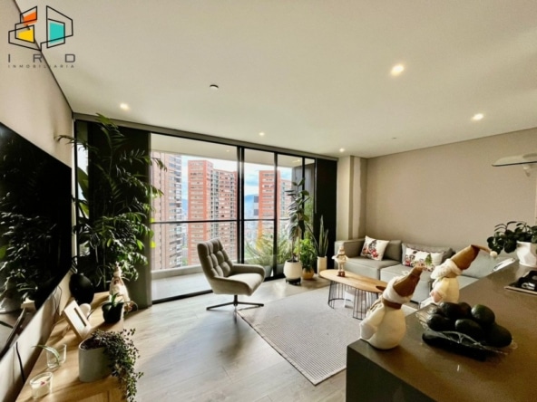 Sala, comedor, amplia cómoda e iluminada. Con iluminación Led y acabados modernos. Balcón con encantadora vista a la ciudad de Medellín. Cuenta con ventanales piso techo que permiten que la iluminación natural se apodere de sus espacios. Cocina integral con acabados en madera, barra americana que conecta al área social del inmueble, Cuenta con Horno y campana extractora.