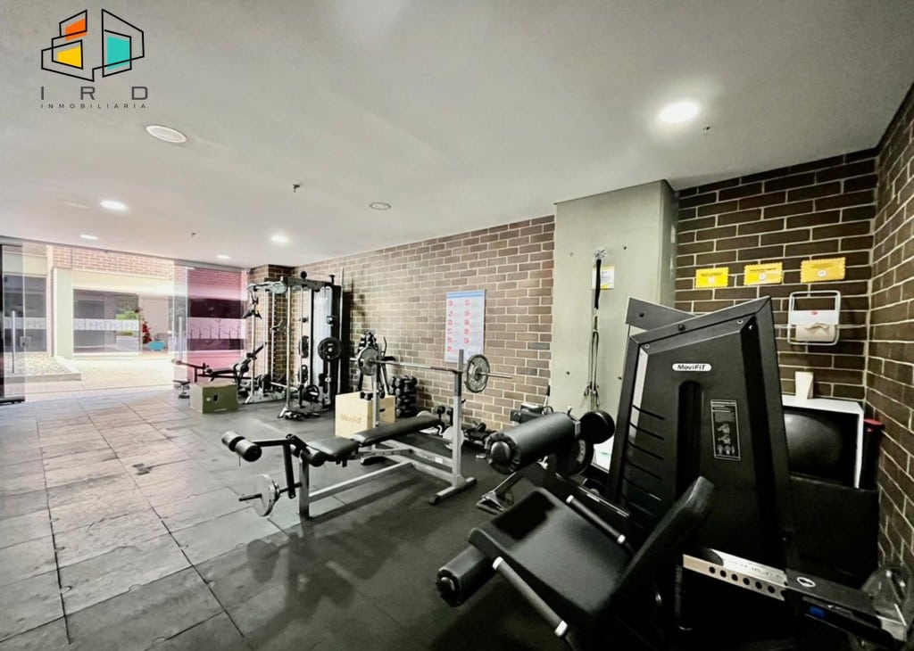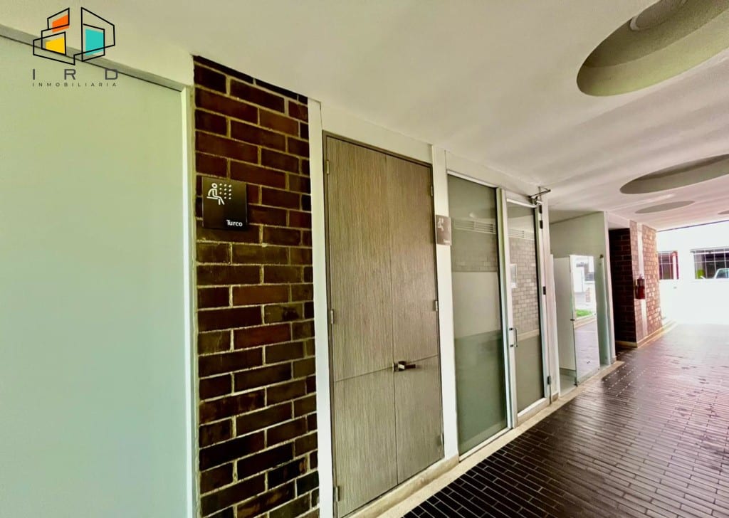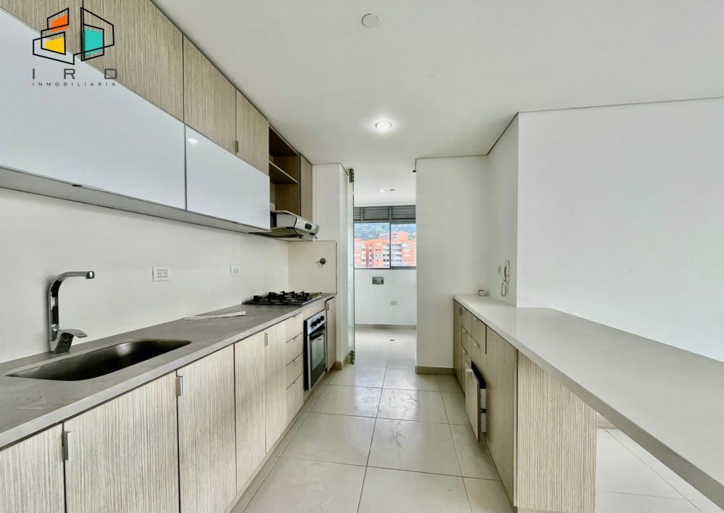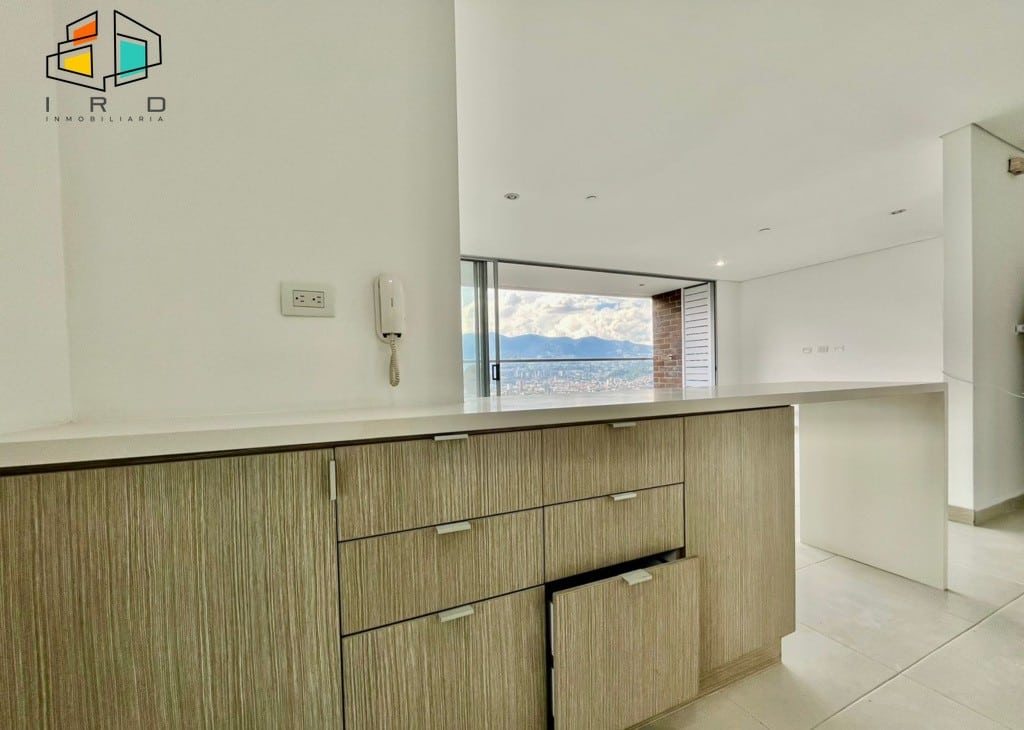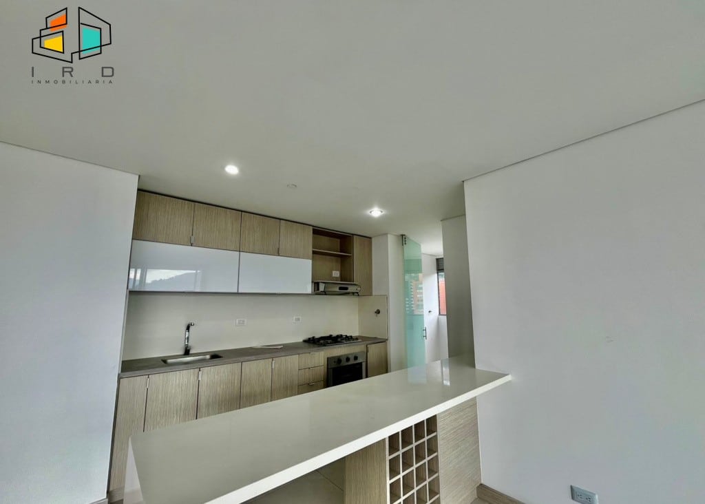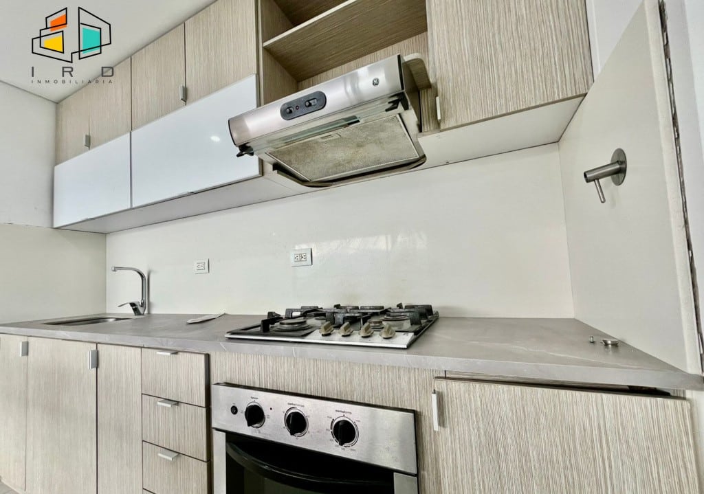 La cocina integral de concepto abierto, con acabados en madera, gabinetes superiores e inferiores, horno, campana extractora y cubierta de cuatro puestos a gas, se complementa con una barra americana que invita a la interacción social. La zona de ropas es independiente, con puerta y calentador de agua.