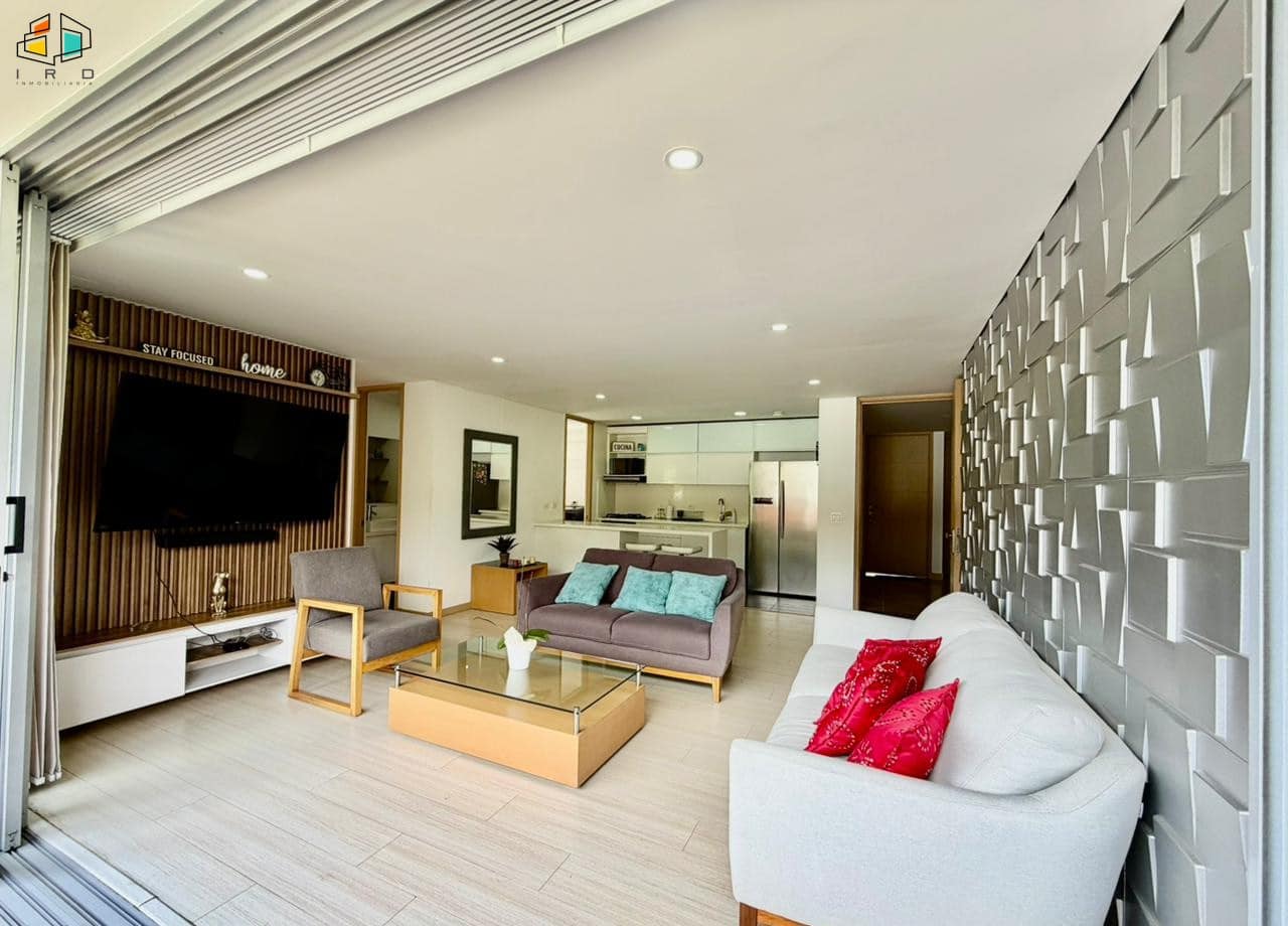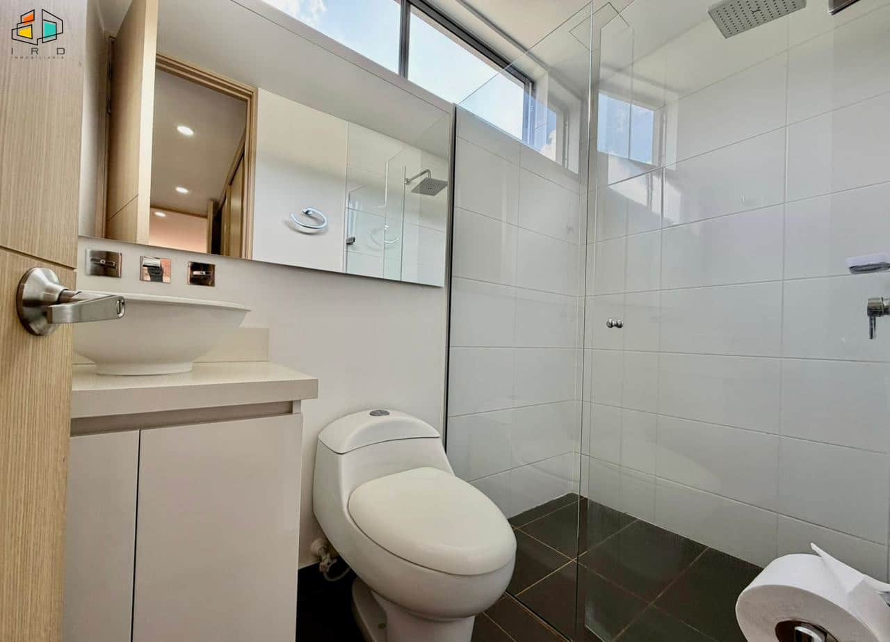 El apartamento cuenta con dos habitaciones elegantemente diseñadas; la principal es un santuario privado con baño en suite y vestier, mientras que la habitación auxiliar dispone de un amplio clóset. Dispone de dos baños completos, incluyendo el social, con acabados de alta calidad. La sala comedor, con sus modernos pisos en madera laminada, se beneficia de una abundante iluminación LED y natural, creando un ambiente cálido y acogedor. El balcón, con ventanales de piso a techo, ofrece vistas panorámicas a la ciudad y a la naturaleza circundante, ideal para relajarse.