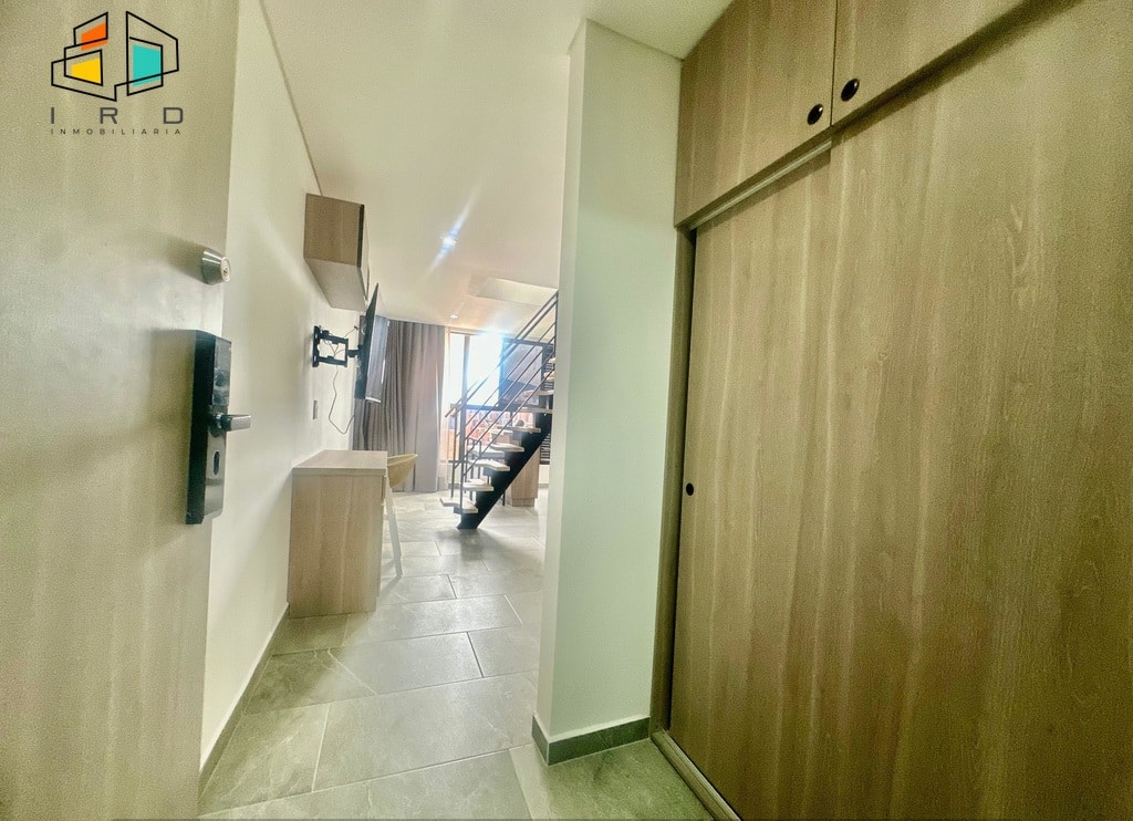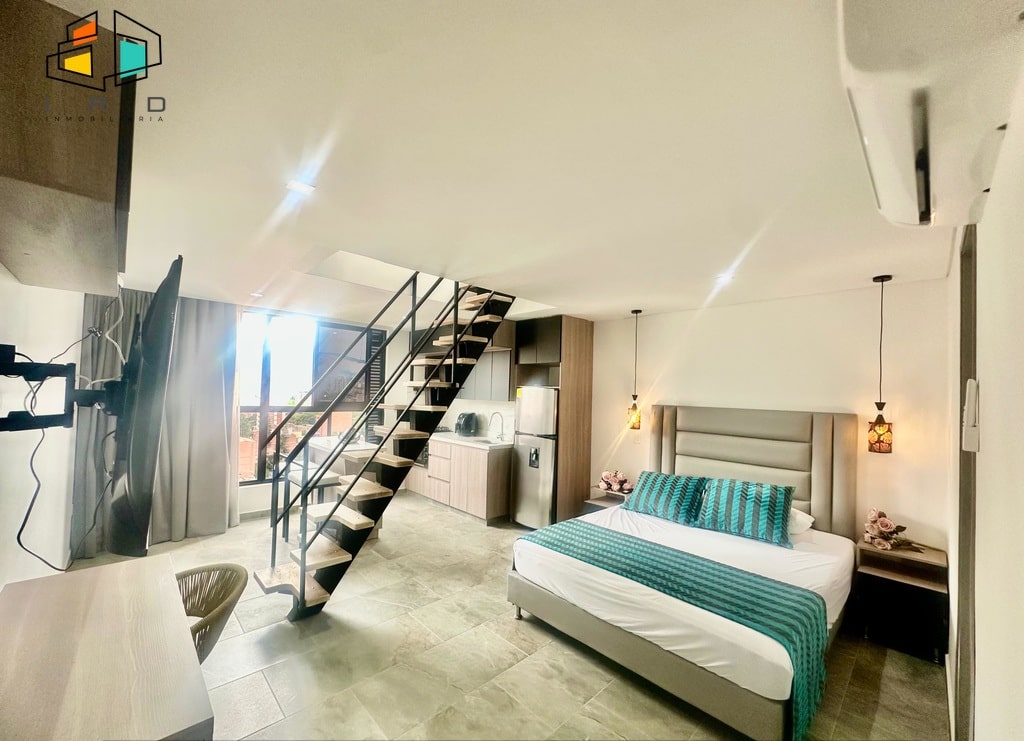 El primer nivel de este moderno apartamento le recibe con una confortable cama doble, Smart TV y aire acondicionado para su máximo confort. Cuenta con un elegante clóset en madera, un baño completo y una funcional zona de trabajo u oficina equipada con escritorio y silla corrediza. La cocina integral, con acabados en madera, barra americana, horno, campana extractora, nevera, microondas y utensilios básicos, está completamente equipada para sus necesidades culinarias.