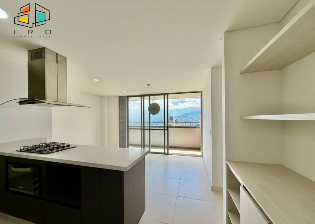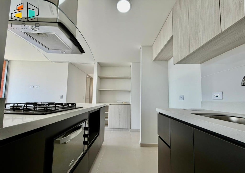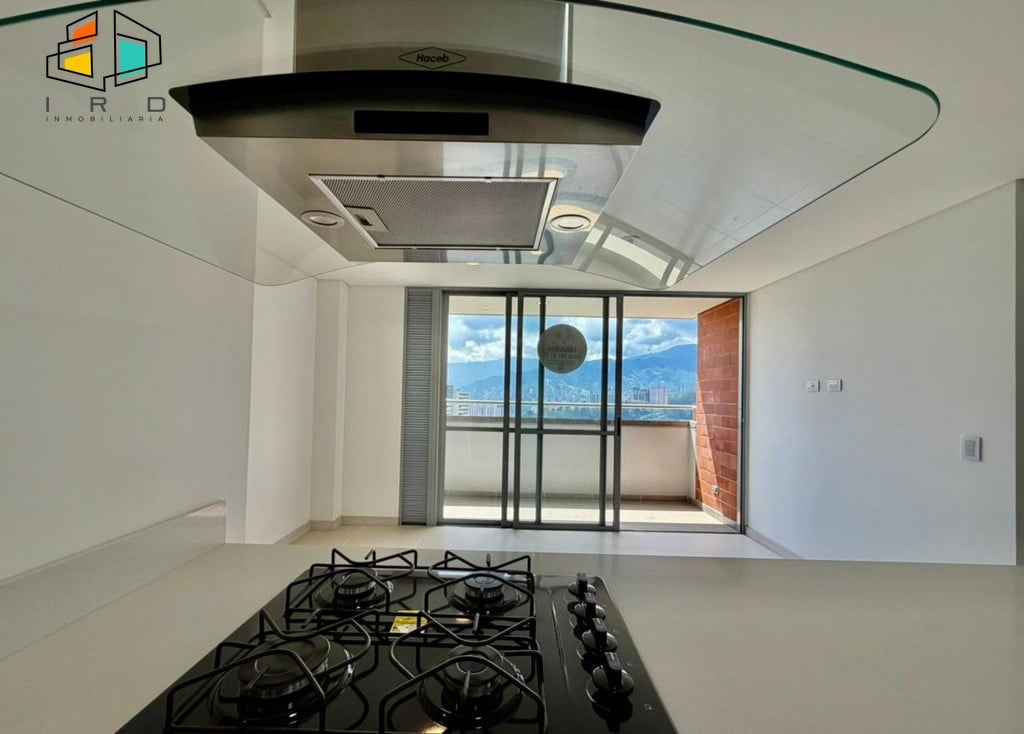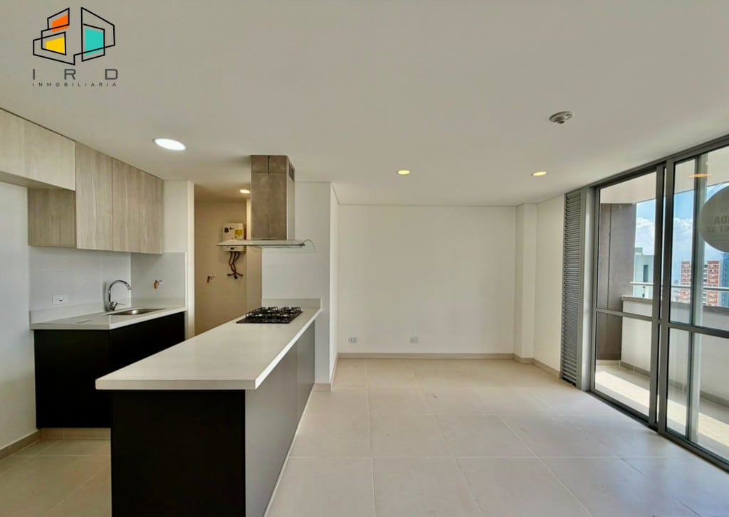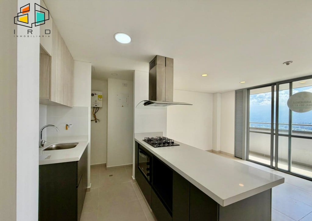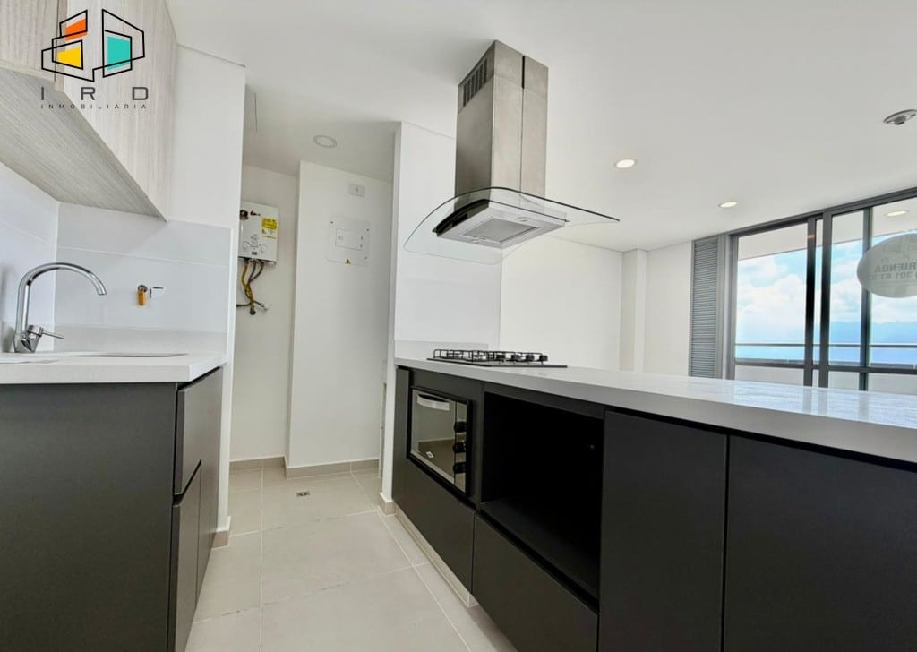 Disfrute de un balcón con vistas agradables y ventanales corredizos en vidrio templado que maximizan la entrada de luz natural, integrando el exterior con los espacios interiores. La cocina integral de concepto abierto, con acabados de alta calidad, incluye horno, campana extractora y muebles superiores e inferiores modernos, complementada por una barra americana que conecta armoniosamente con el área social. La zona de ropas, equipada con calentador de agua, añade practicidad al día a día.