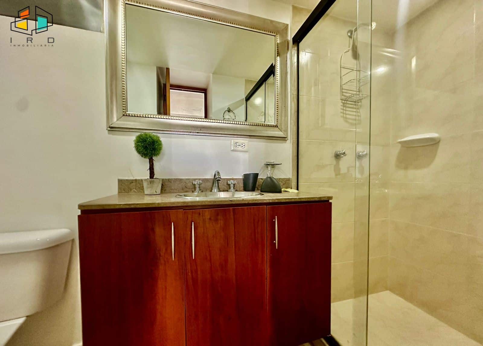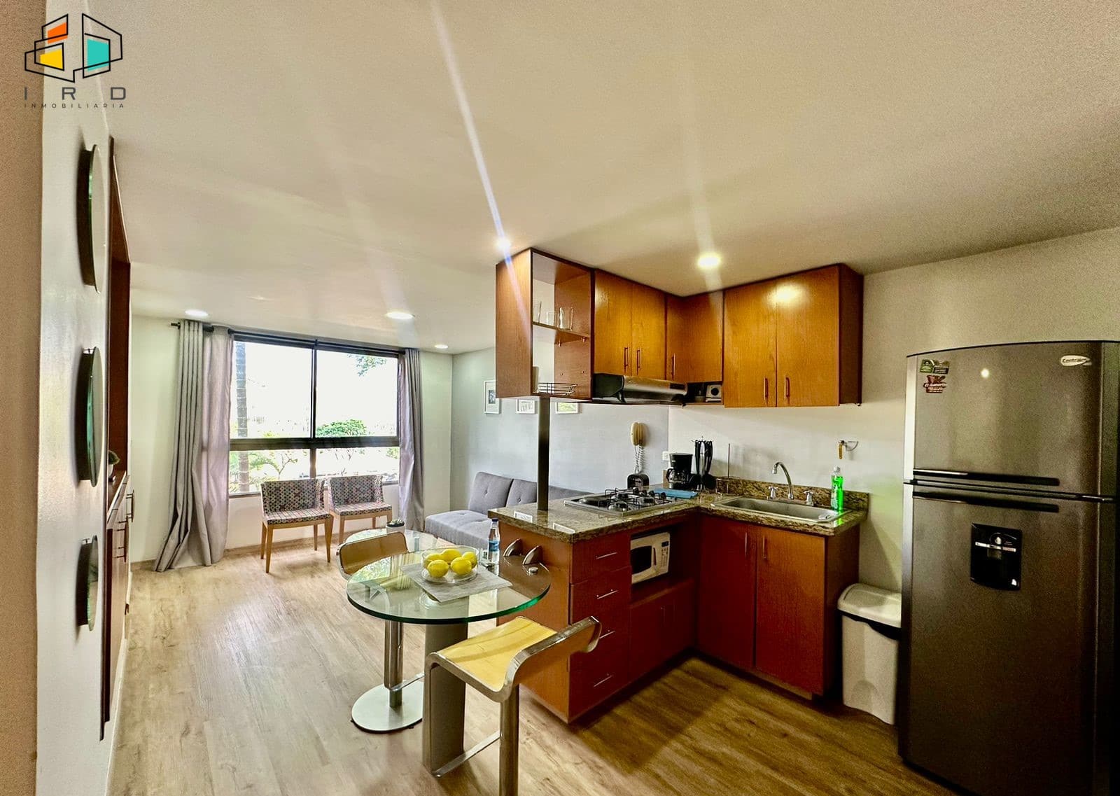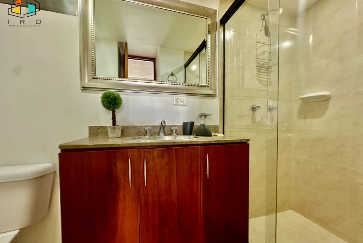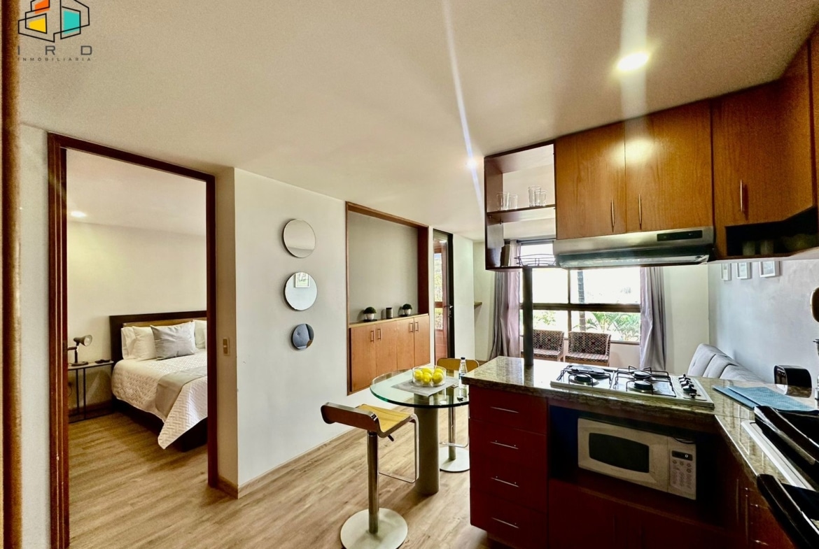 La zona social es un verdadero deleite, con una sala-comedor de amplios espacios que se benefician de una excelente iluminación natural. Desde aquí, acceda a un balcón que ofrece una acogedora vista hacia la naturaleza, ideal para relajarse y desconectar. La cocina semi-integral, con sus elegantes acabados en madera y una práctica barra americana, se integra armoniosamente con la zona social, perfecta para el entretenimiento. Además, la propiedad incluye una zona de ropas independiente equipada con calentador de agua, y un parqueadero privado para su comodidad.