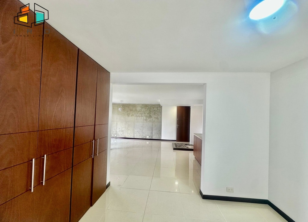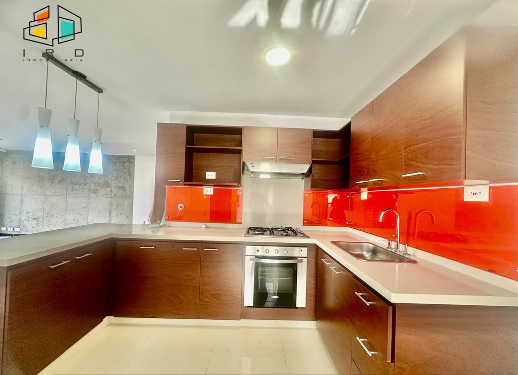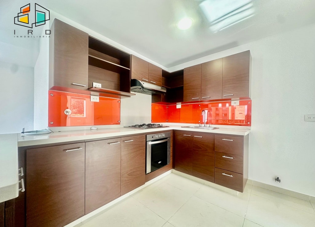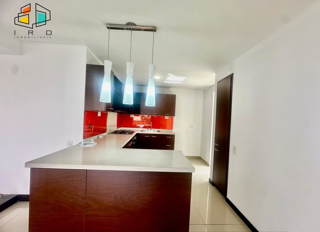 La cocina integral de concepto abierto, con acabados en madera, está completamente equipada con horno, campana extractora, alacena, cubierta de cuatro puestos a gas y un mesón en forma de U con barra americana que conecta armoniosamente con la zona social. La zona de ropas, independiente de la cocina mediante una puerta de vidrio, incluye calentador de paso. Los pisos combinan la elegancia del porcelanato en áreas sociales y la calidez de la madera en las habitaciones.