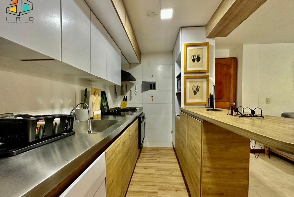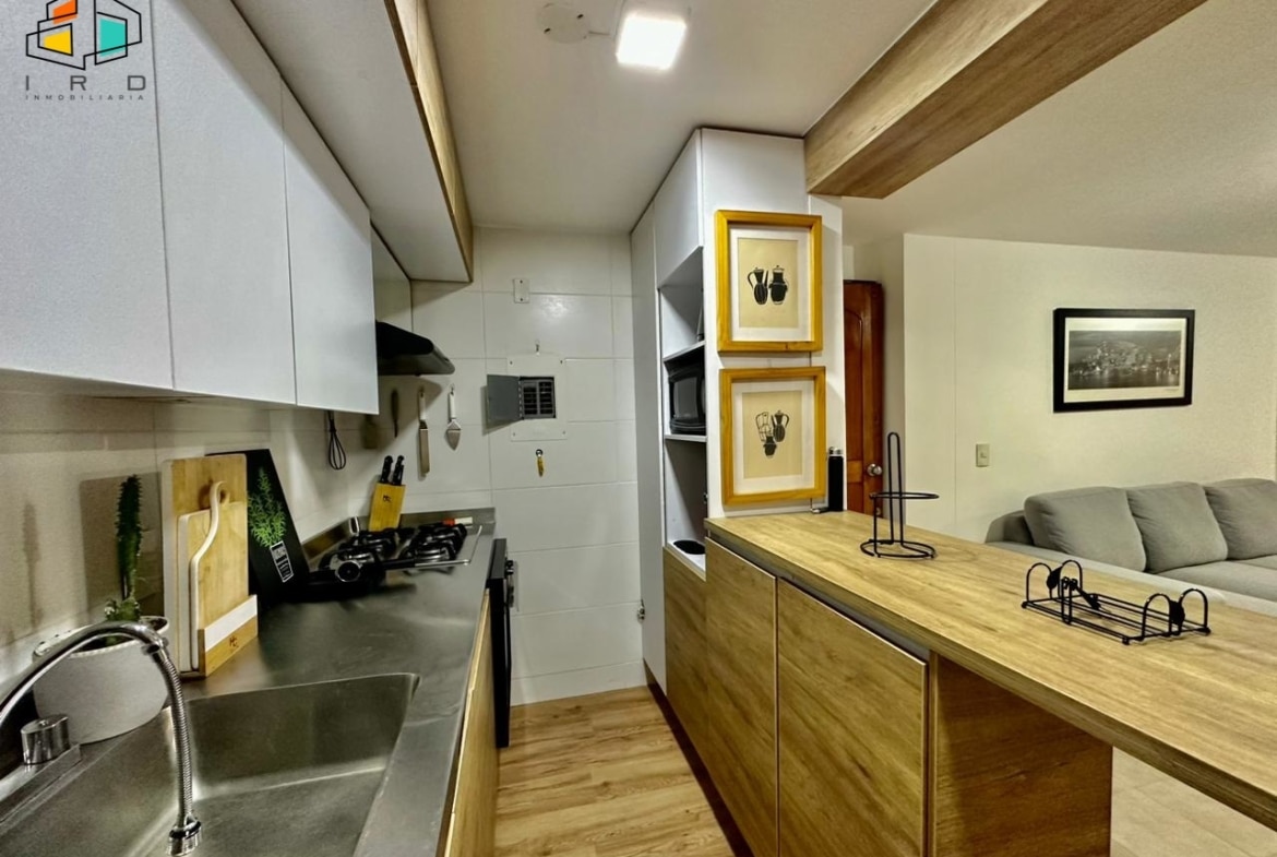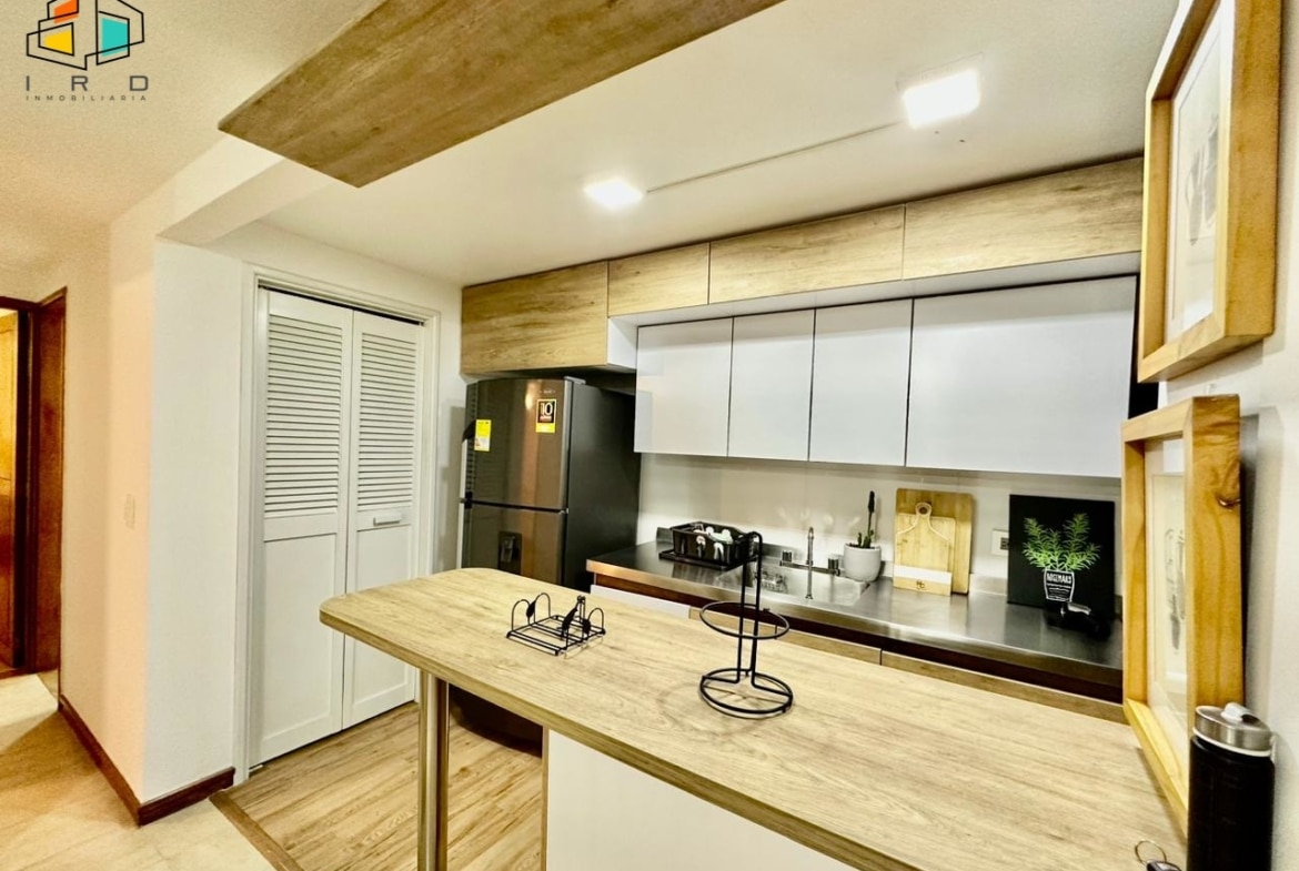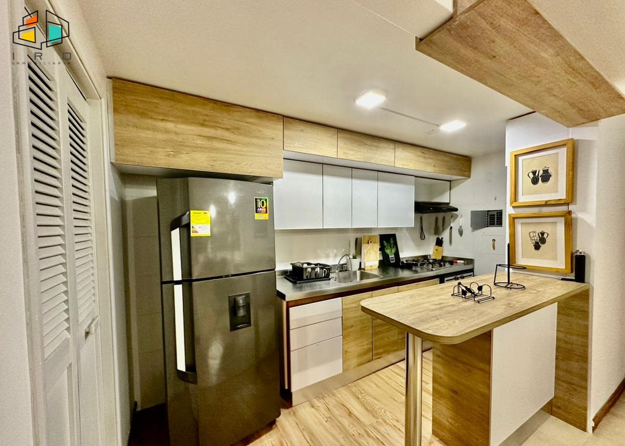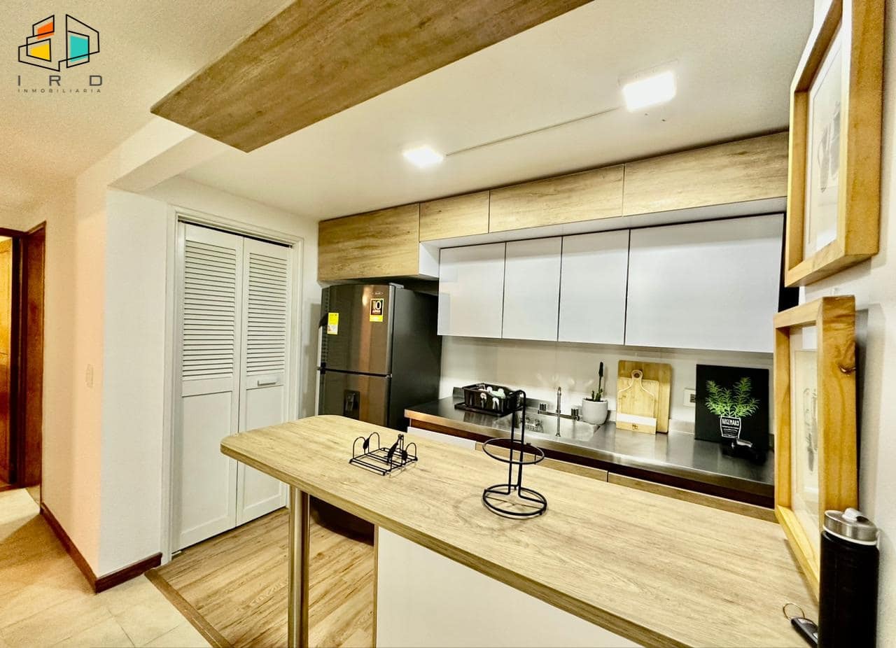 Este moderno apartamento cuenta con dos habitaciones, la principal con baño privado y vestier, y la auxiliar con closet. Dispone de dos baños completos, incluyendo un baño social. La cocina integral abierta, con acabados en madera en sus gabinetes superiores e inferiores, se integra armoniosamente al área social a través de una práctica barra americana. Está equipada con horno de 4 puestos a gas y campana extractora. Adicionalmente, cuenta con una cómoda zona de ropas.