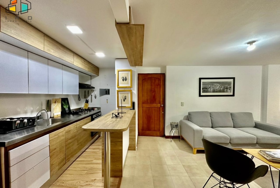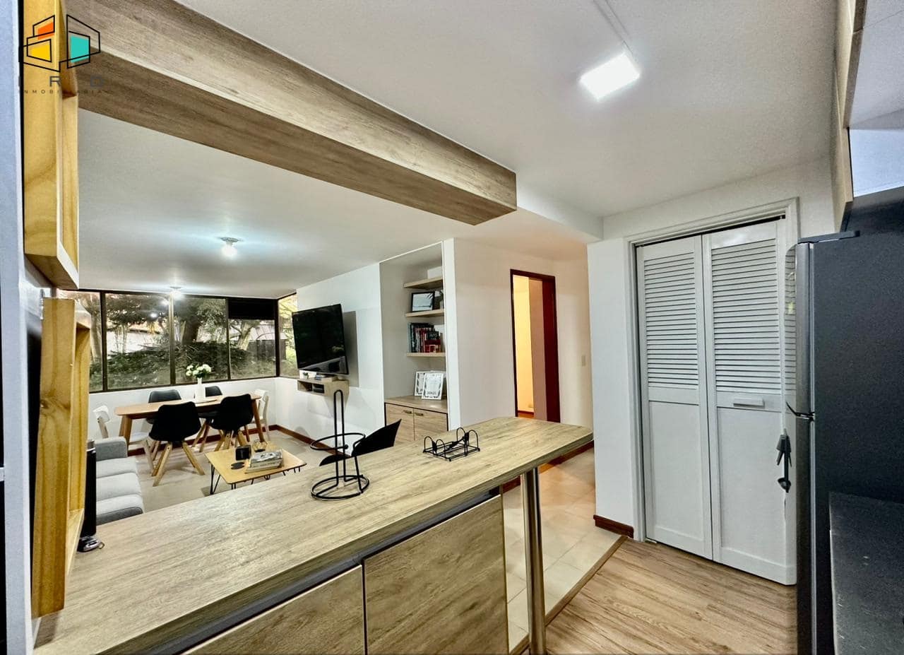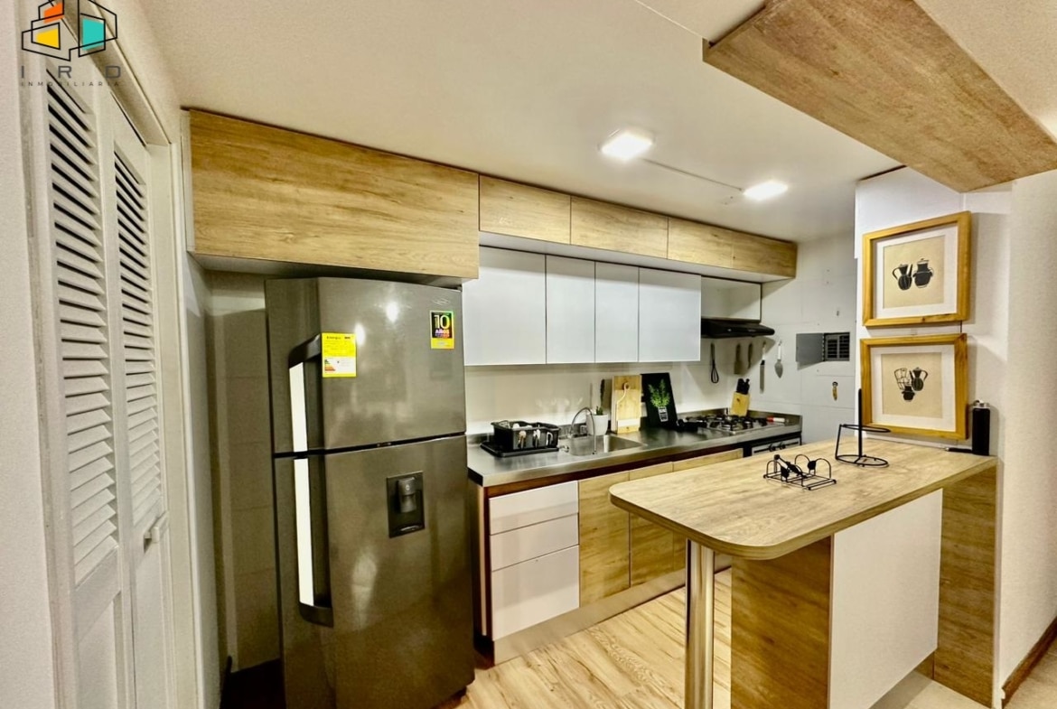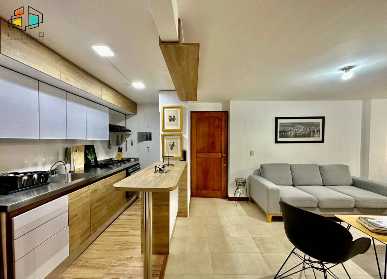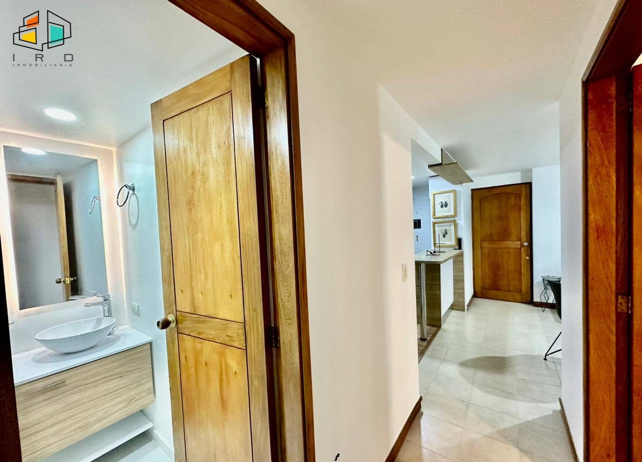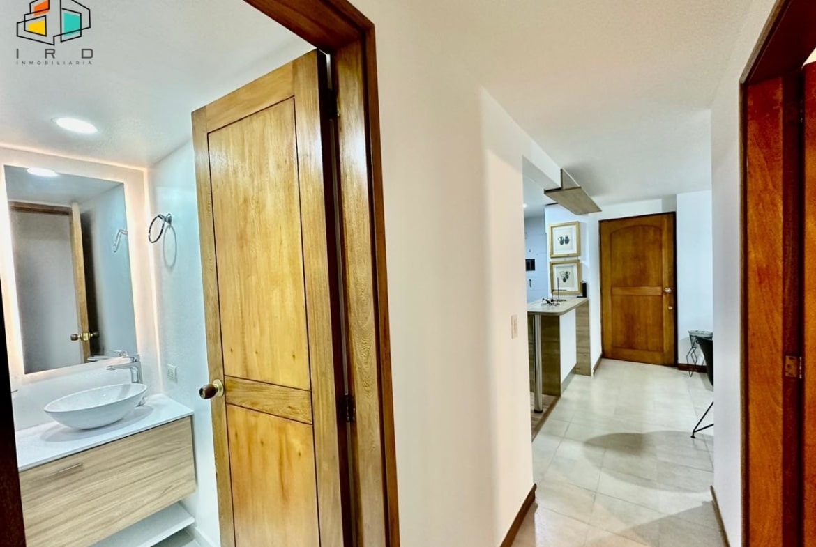 Este moderno apartamento cuenta con dos habitaciones, la principal con baño privado y vestier, y la auxiliar con closet. Dispone de dos baños completos, incluyendo un baño social. La cocina integral abierta, con acabados en madera en sus gabinetes superiores e inferiores, se integra armoniosamente al área social a través de una práctica barra americana. Está equipada con horno de 4 puestos a gas y campana extractora. Adicionalmente, cuenta con una cómoda zona de ropas.