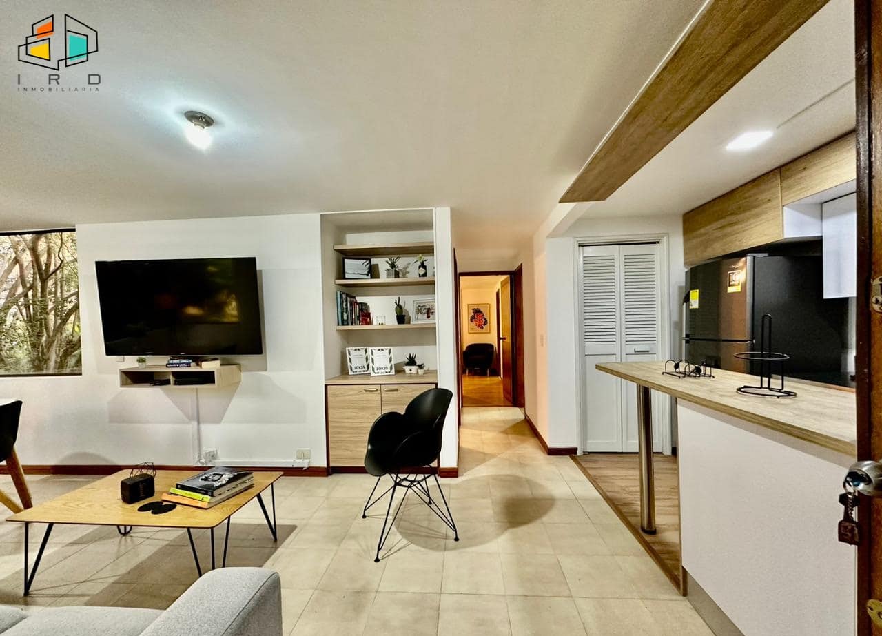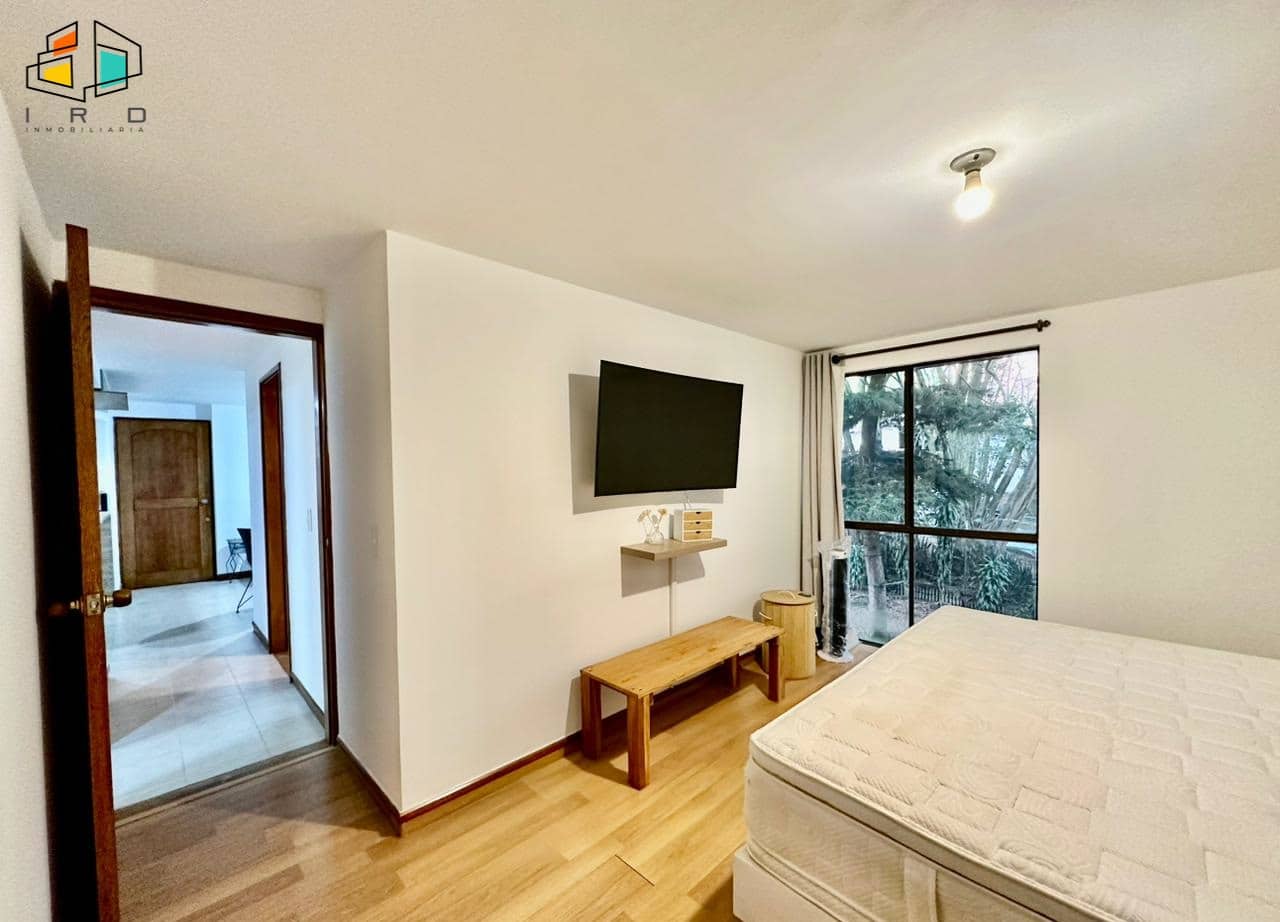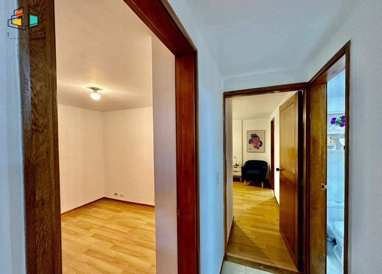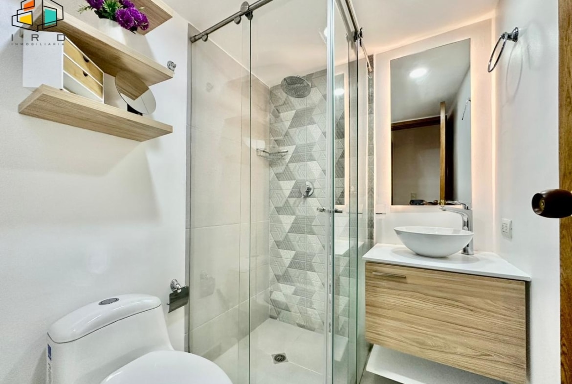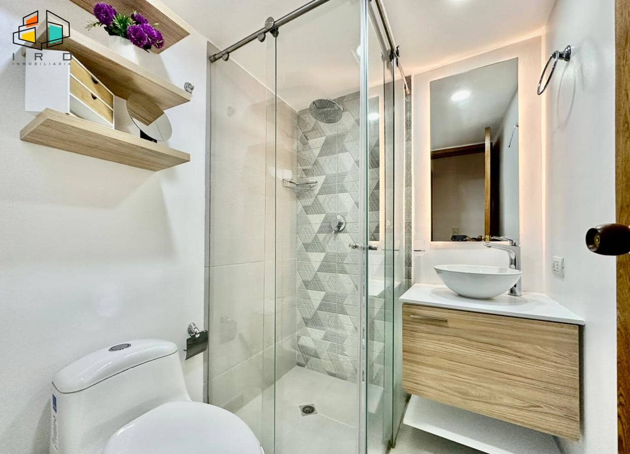 Este moderno apartamento cuenta con dos habitaciones, la principal con baño privado y vestier, y la auxiliar con closet. Dispone de dos baños completos, incluyendo un baño social. La cocina integral abierta, con acabados en madera en sus gabinetes superiores e inferiores, se integra armoniosamente al área social a través de una práctica barra americana. Está equipada con horno de 4 puestos a gas y campana extractora. Adicionalmente, cuenta con una cómoda zona de ropas.