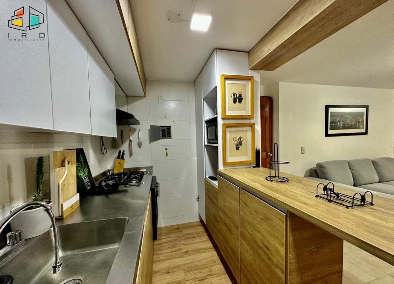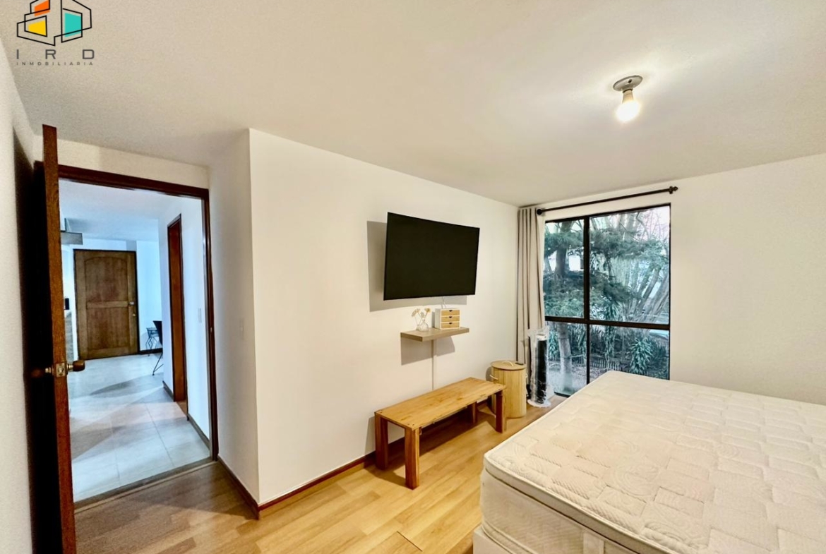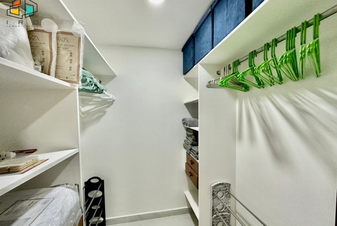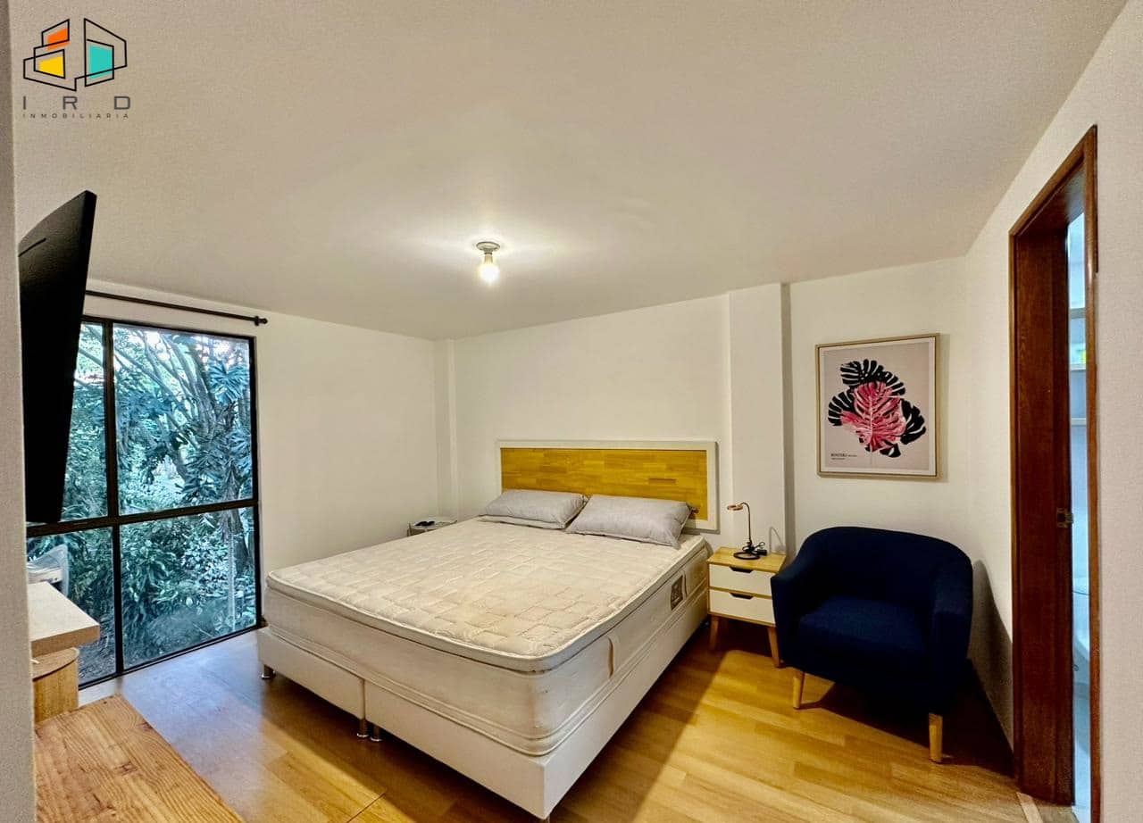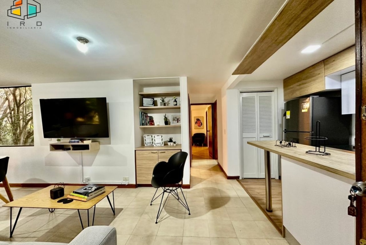 Este moderno apartamento cuenta con dos habitaciones, la principal con baño privado y vestier, y la auxiliar con closet. Dispone de dos baños completos, incluyendo un baño social. La cocina integral abierta, con acabados en madera en sus gabinetes superiores e inferiores, se integra armoniosamente al área social a través de una práctica barra americana. Está equipada con horno de 4 puestos a gas y campana extractora. Adicionalmente, cuenta con una cómoda zona de ropas.