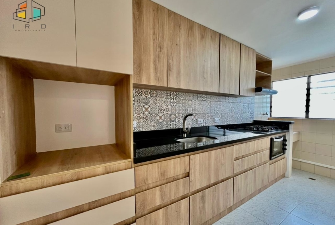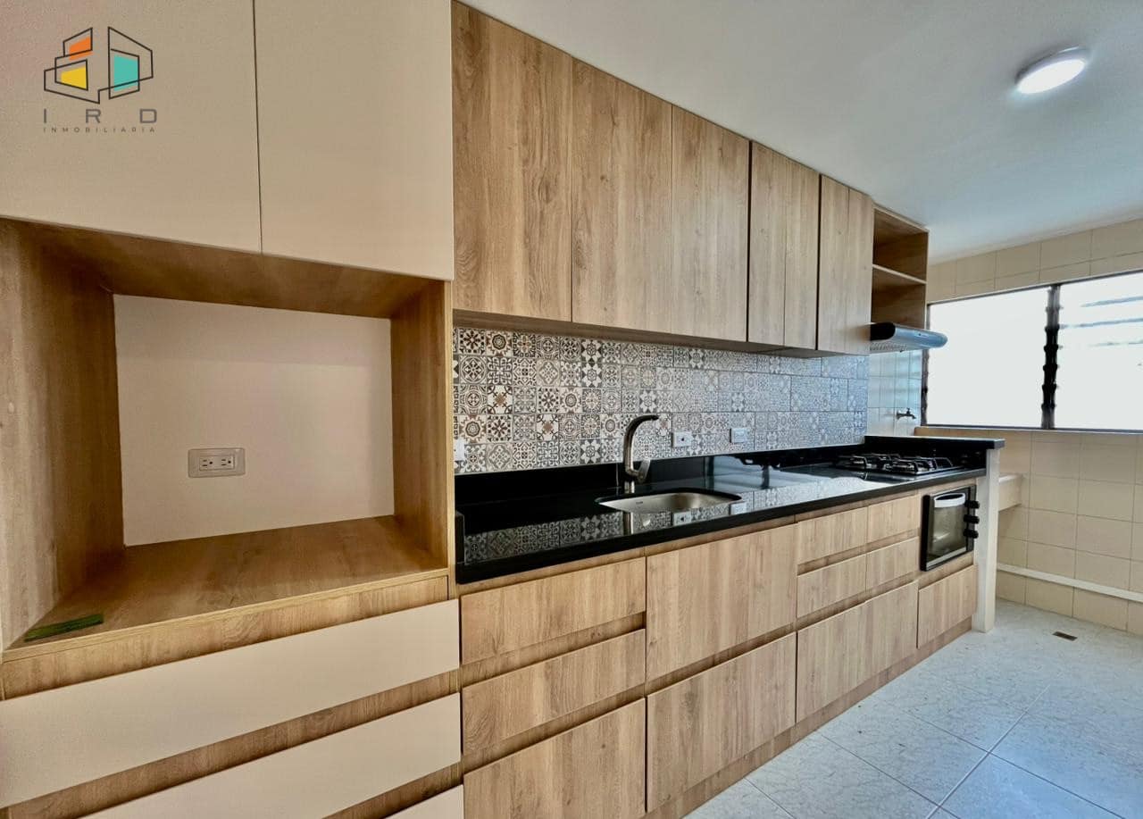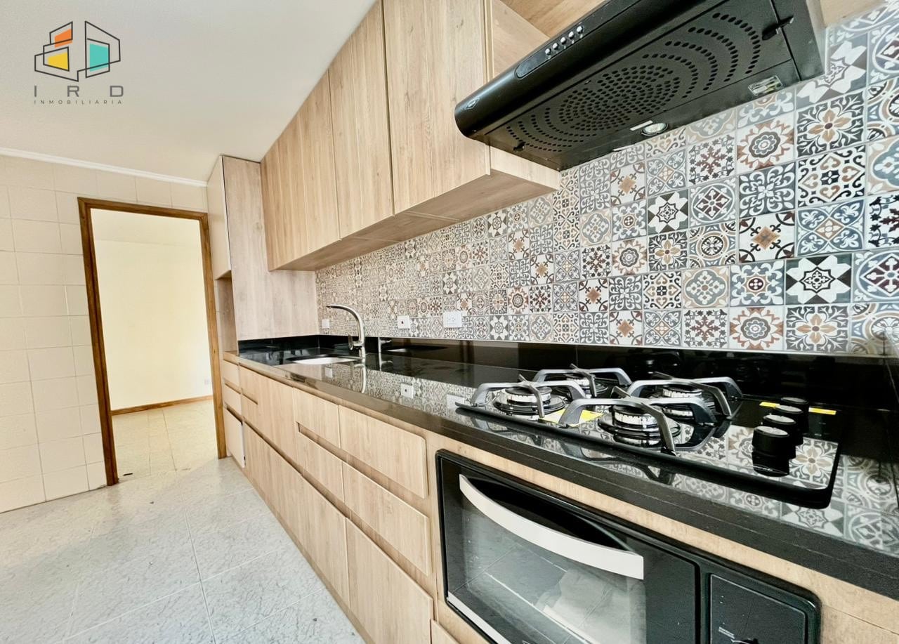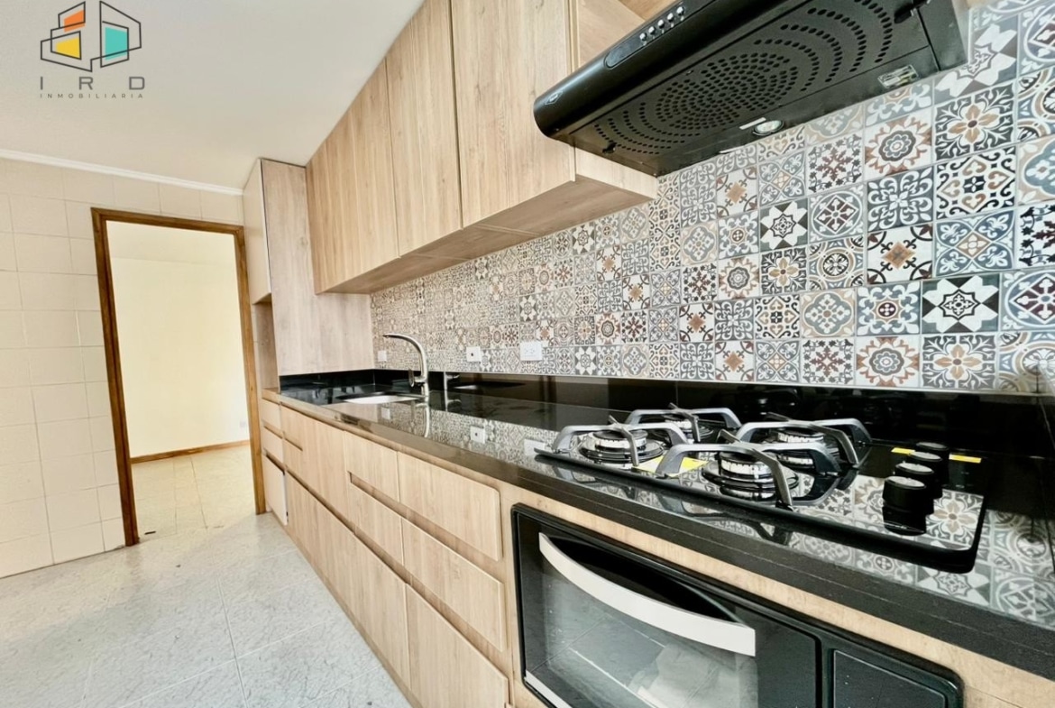 La cocina integral está completamente equipada con horno, cubierta de cuatro puestos a gas, campana extractora, gabinetes superiores e inferiores, y una práctica alacena. La zona de ropas incluye un calentador de gas.