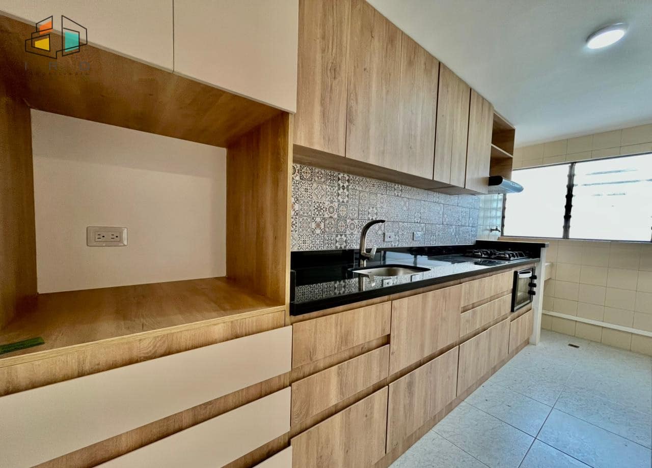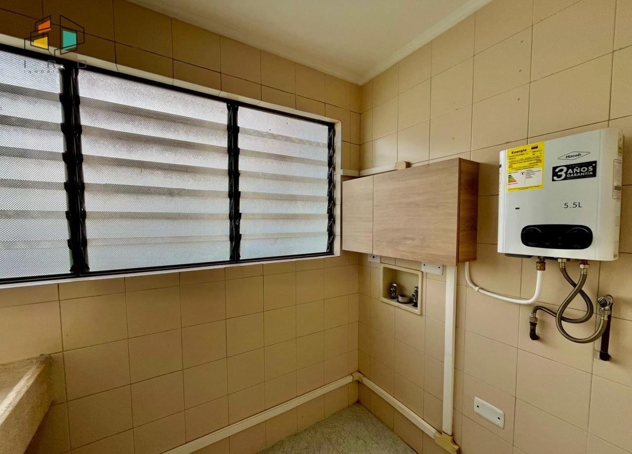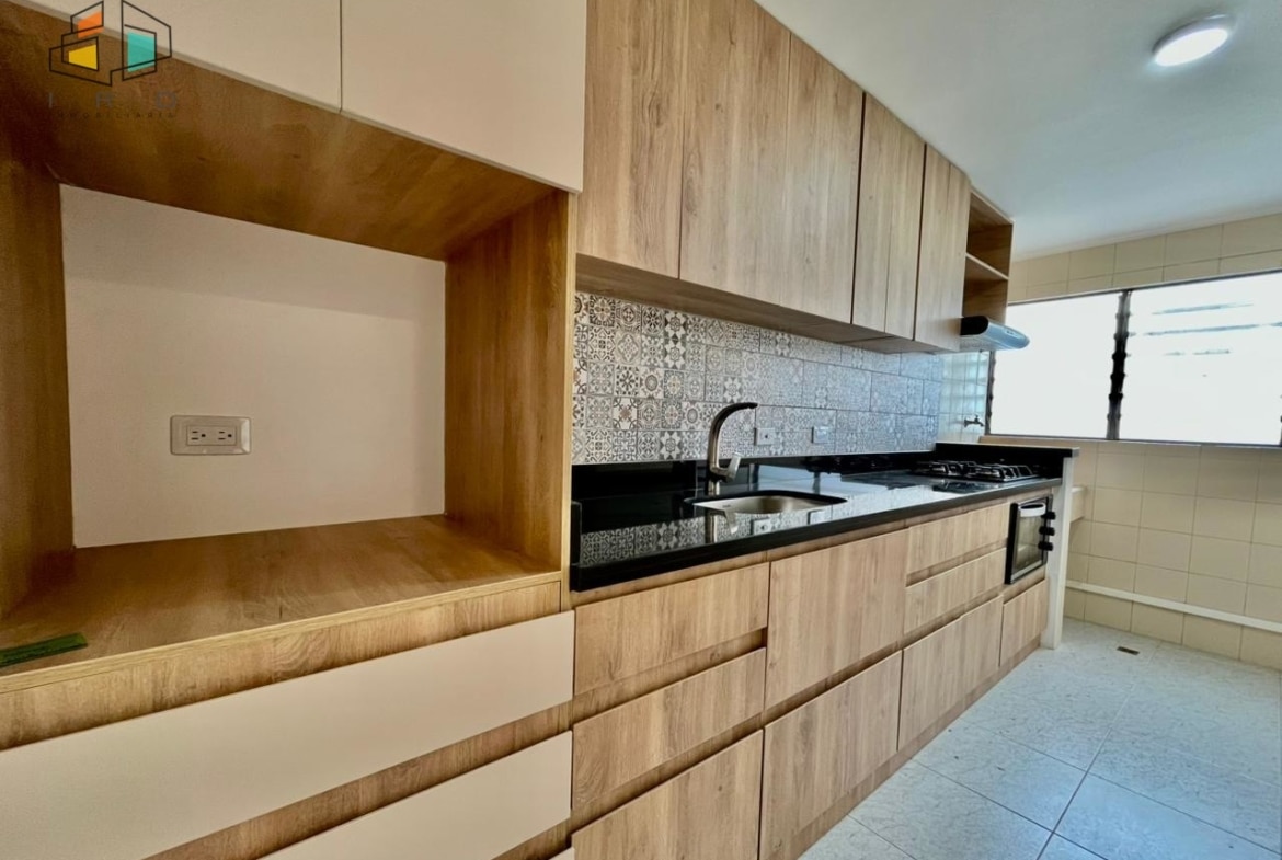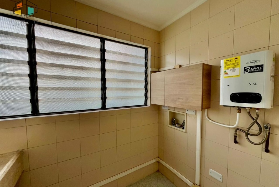 La cocina integral está completamente equipada con horno, cubierta de cuatro puestos a gas, campana extractora, gabinetes superiores e inferiores, y una práctica alacena. La zona de ropas incluye un calentador de gas.