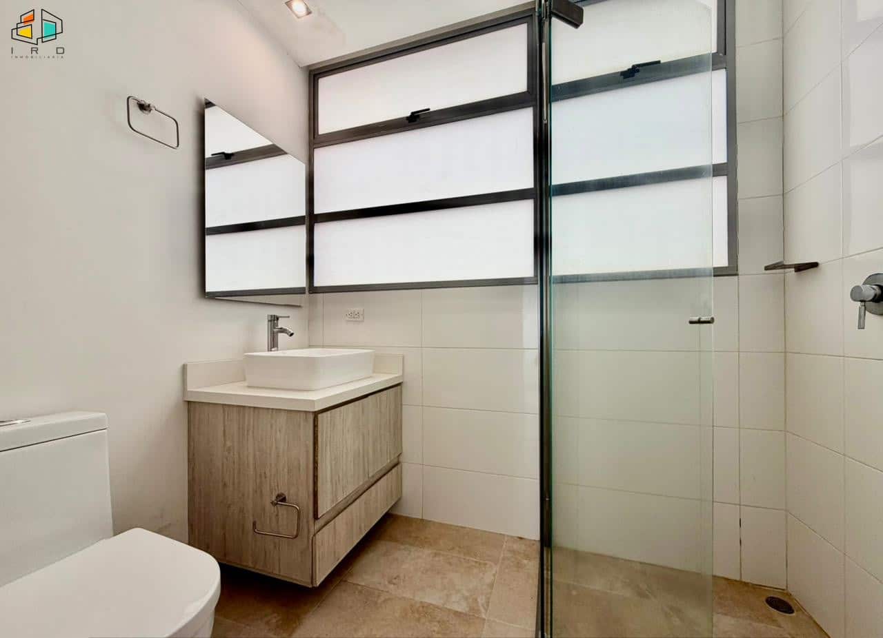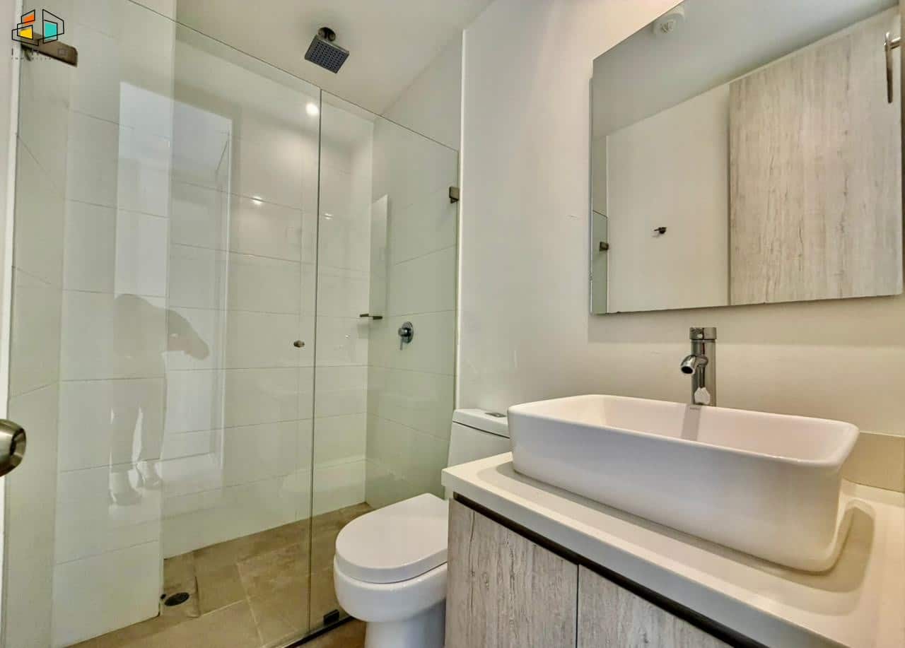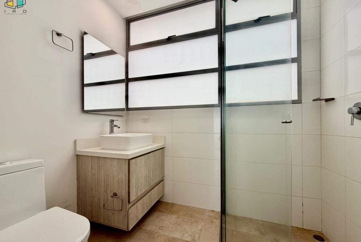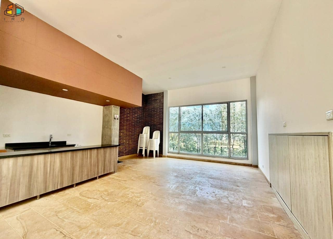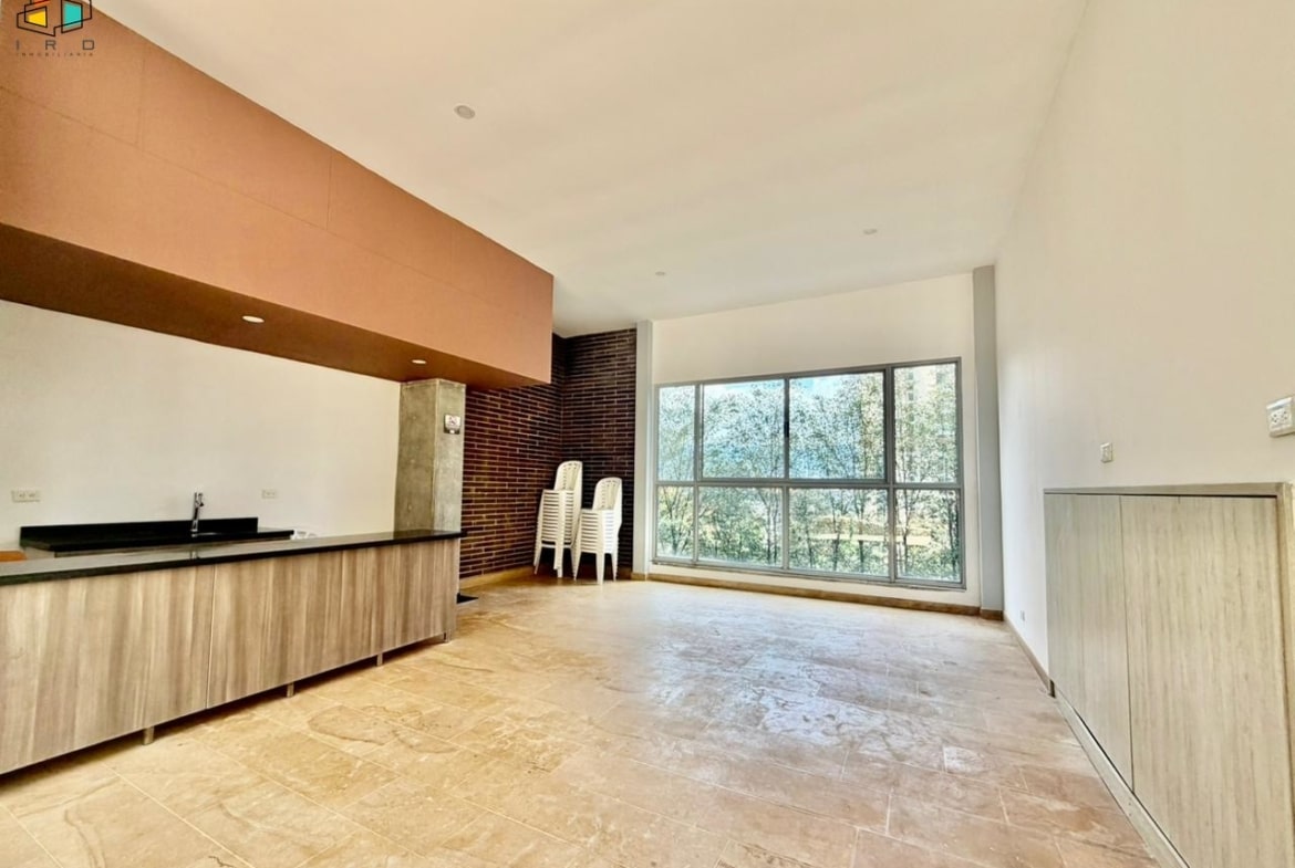 El salón comedor es un espacio generoso con pisos de retal de mármol e iluminación LED, creando un ambiente sofisticado y acogedor. El balcón, con ventanales de piso a techo que abarcan toda la pared, invita a disfrutar de vistas despejadas. La cocina integral de concepto abierto, con acabados modernos y totalmente terminada, está equipada con horno, campana extractora y cubierta de cuatro puestos a gas. Su mesón y barra americana se integran perfectamente con el área social, ideal para el entretenimiento. La zona de ropas incluye un calentador de agua para su comodidad. Los pisos combinan la elegancia del mármol en las áreas sociales y la calidez de la madera en las habitaciones.