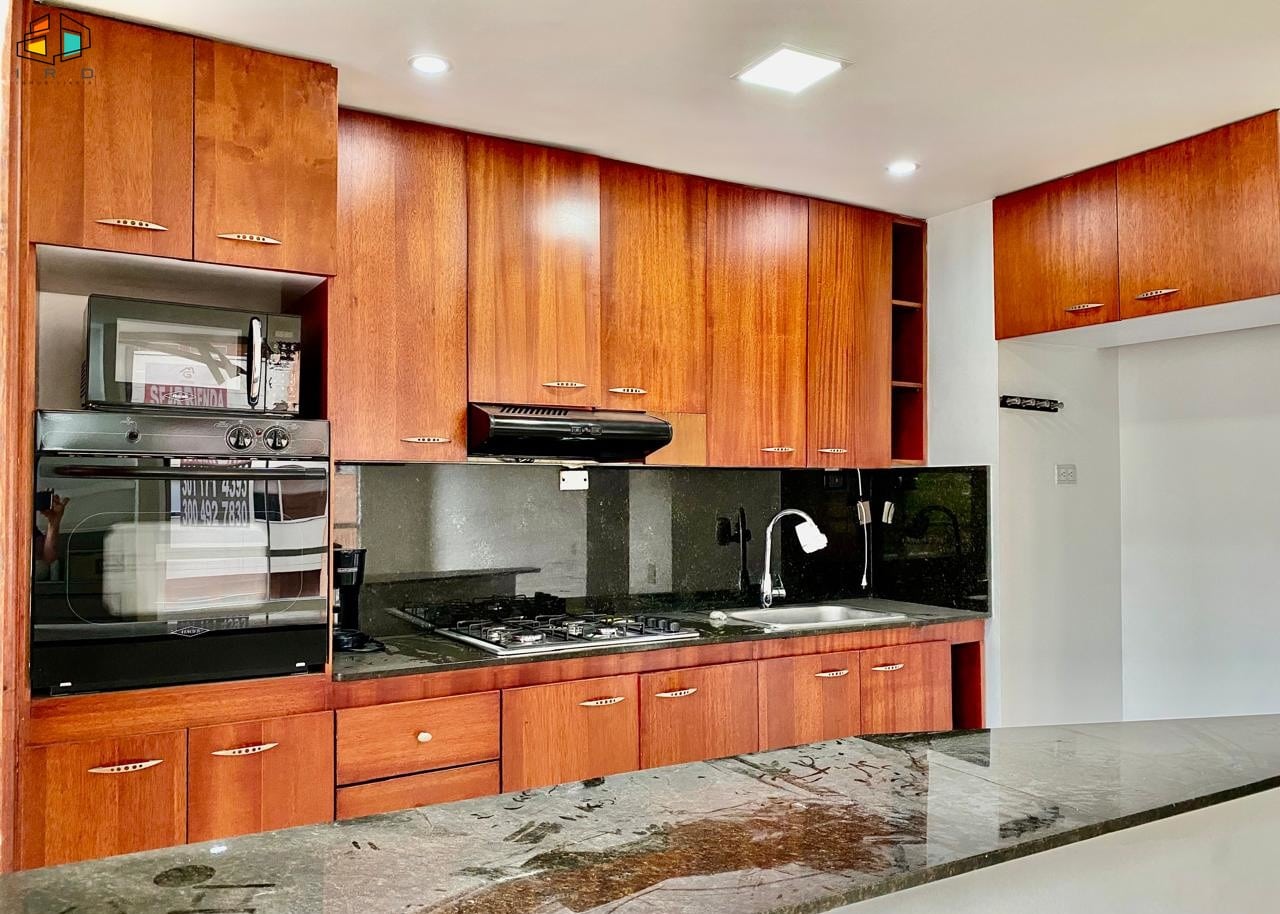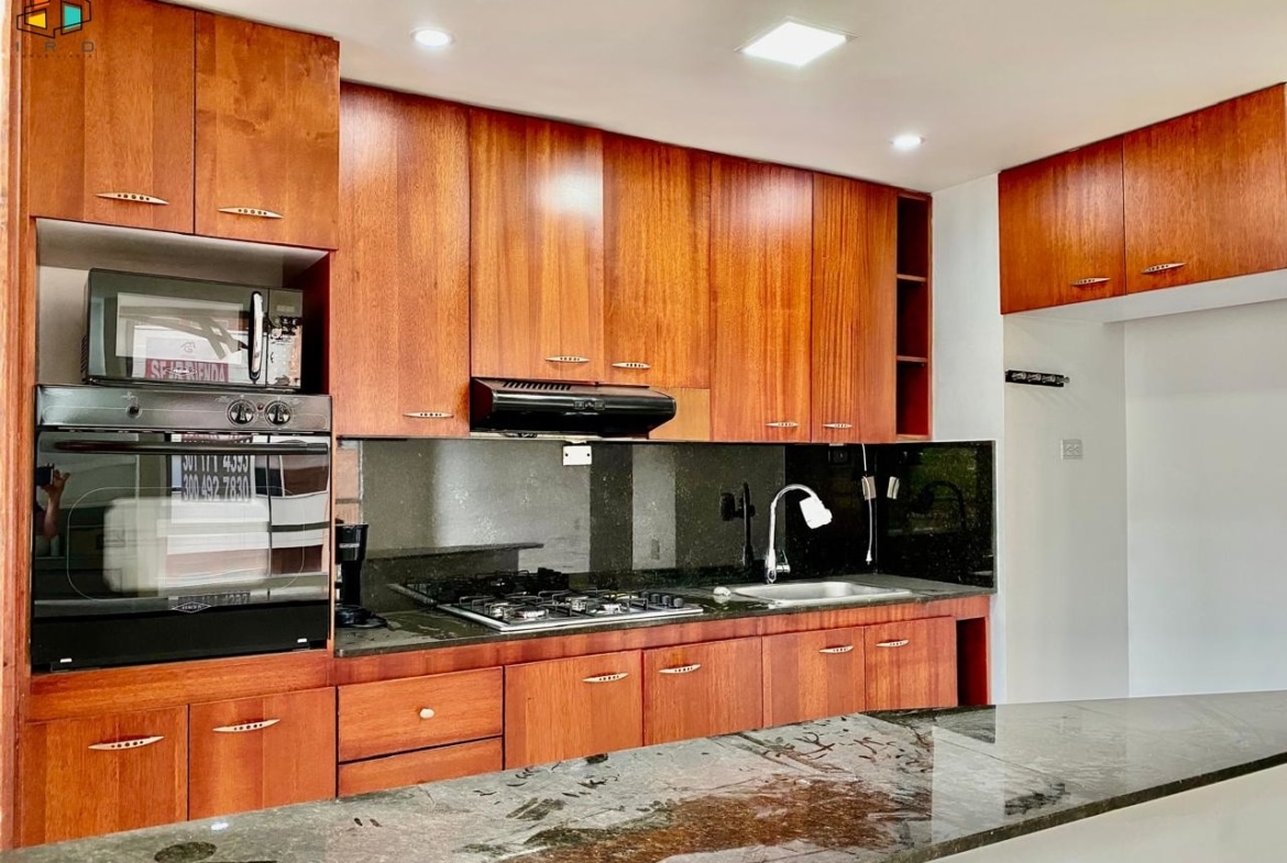 La cocina integral de concepto abierto es un deleite para los amantes de la gastronomía, equipada con horno, campana extractora, muebles superiores e inferiores en madera con acabados modernos y una práctica barra americana que se integra armoniosamente con la zona social. La zona de ropas incluye un calentador de agua para mayor comodidad.
