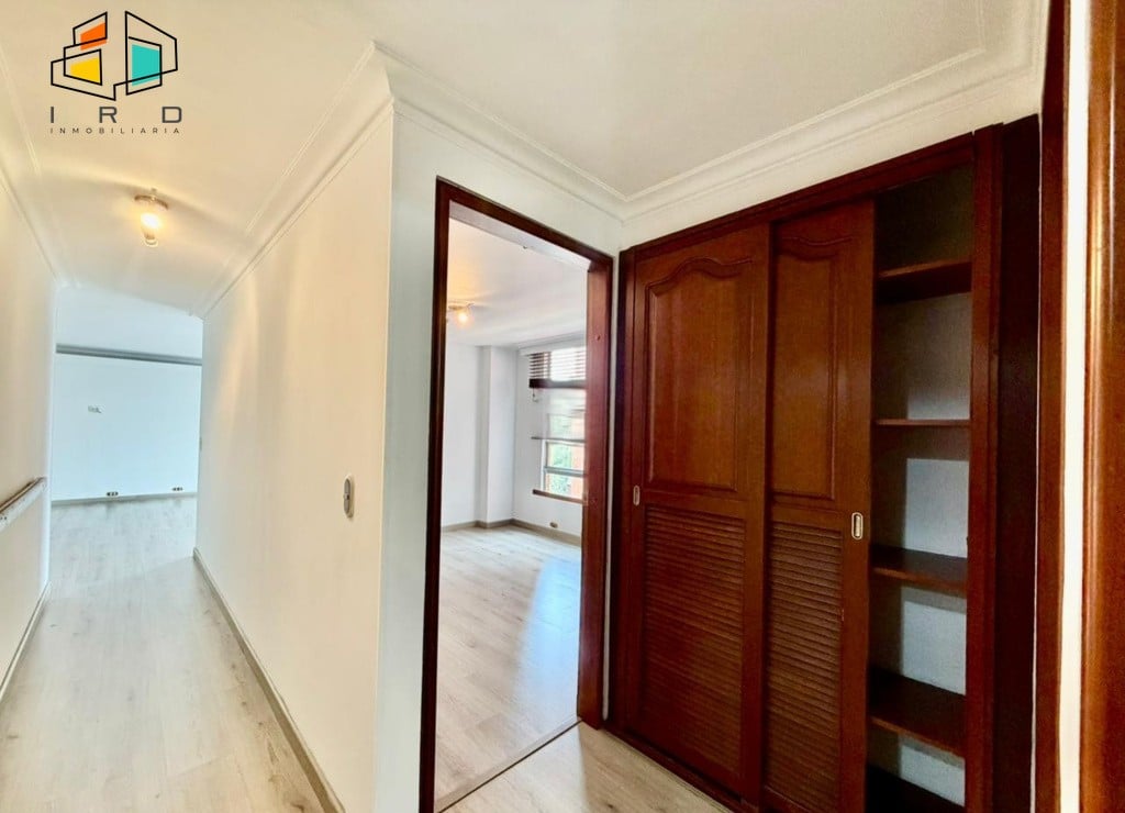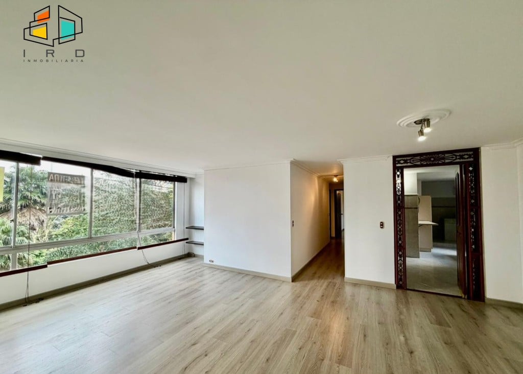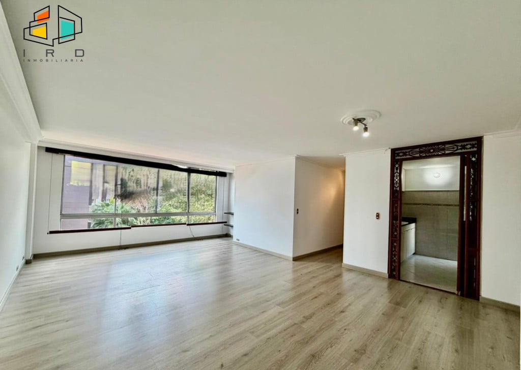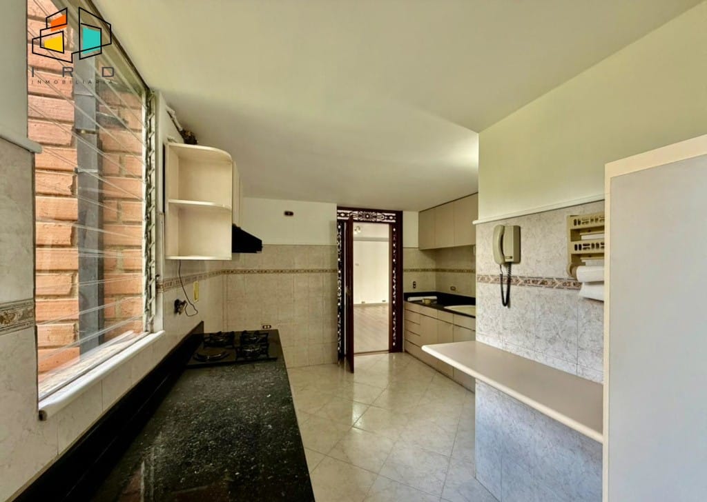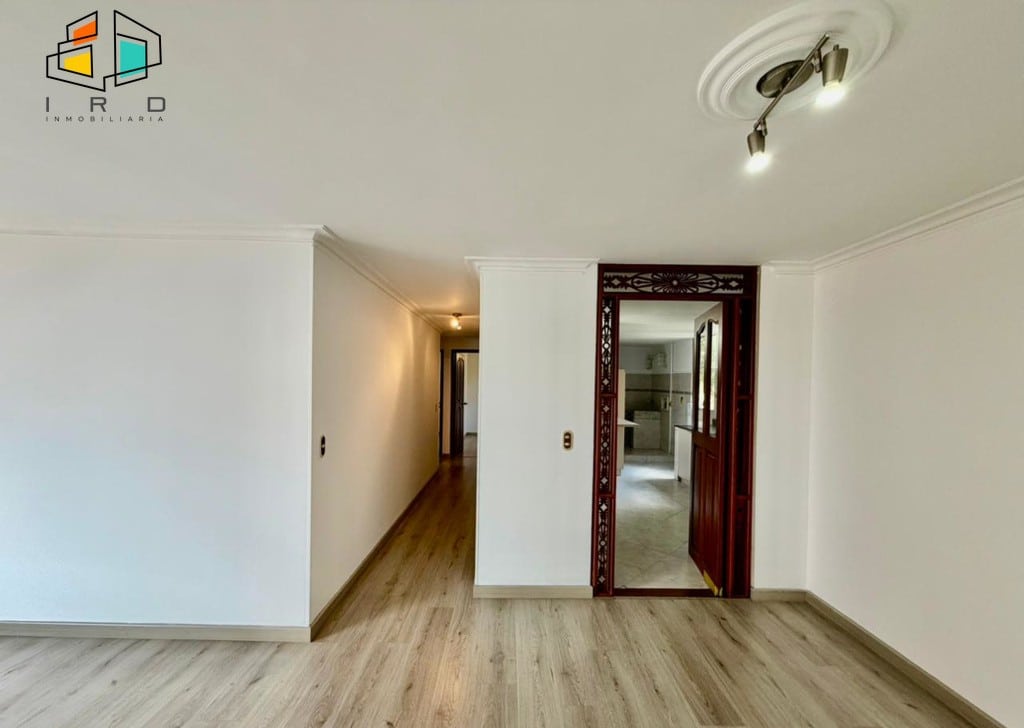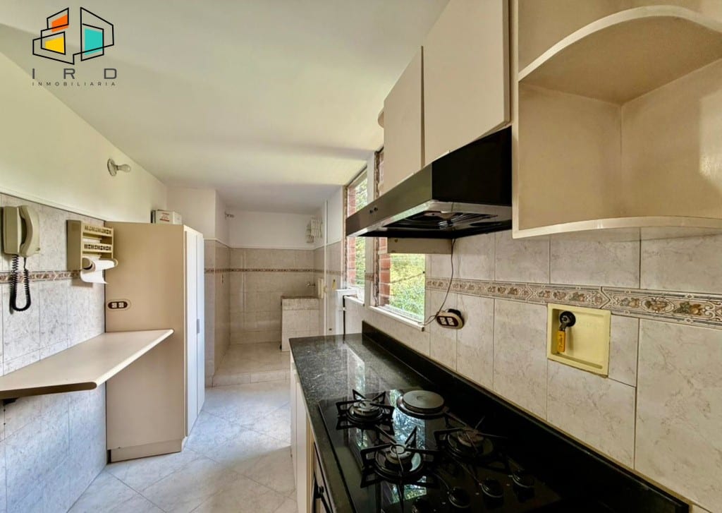 3 clósets en total. 2 baños completos. Sala-comedor espaciosa y bien iluminada, con pisos en madera laminada y luz LED. Un amplio ventanal garantiza una excelente entrada de luz natural. Hall de alcobas. Cocina integral independiente, equipada con horno, campana extractora, muebles superiores e inferiores de madera y acabados modernos. Zona de ropas dotada con calentador de agua.