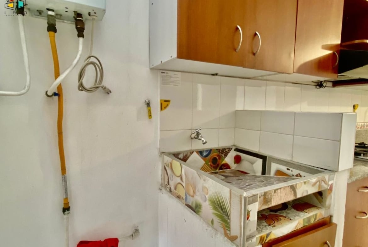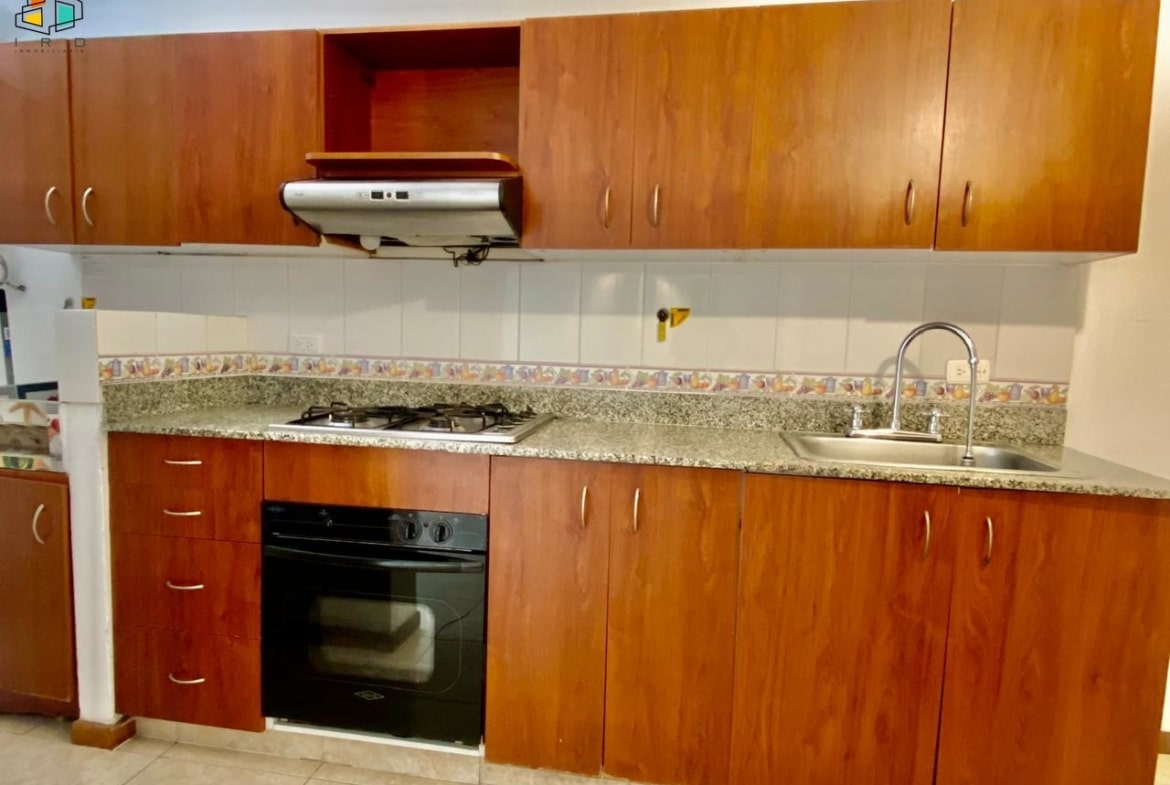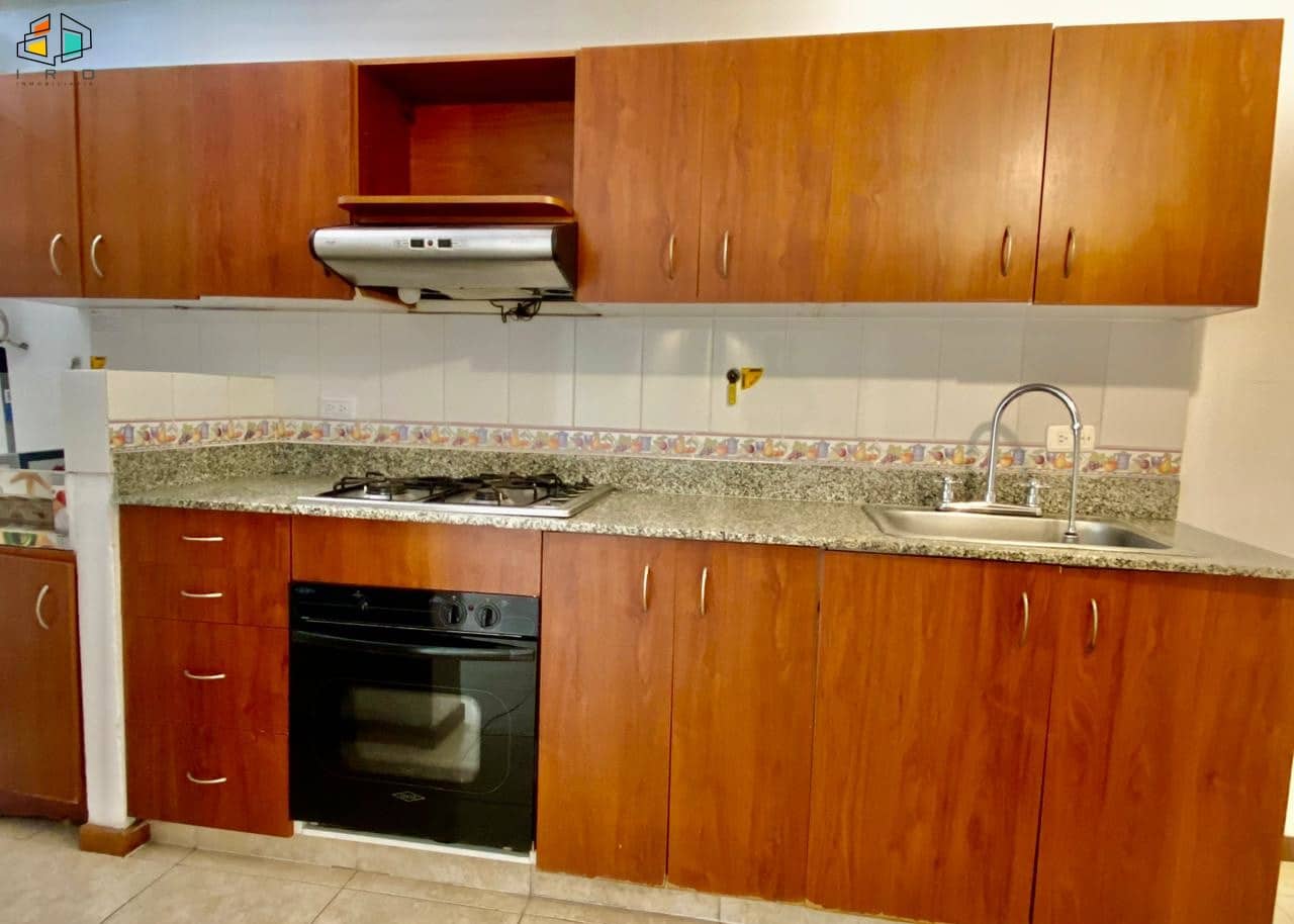 La cocina integral tiene concepto independiente e incluye horno, campana extractora y muebles superiores e inferiores de madera con acabados modernos. También cuenta con una zona de ropas equipada con calentador de agua.