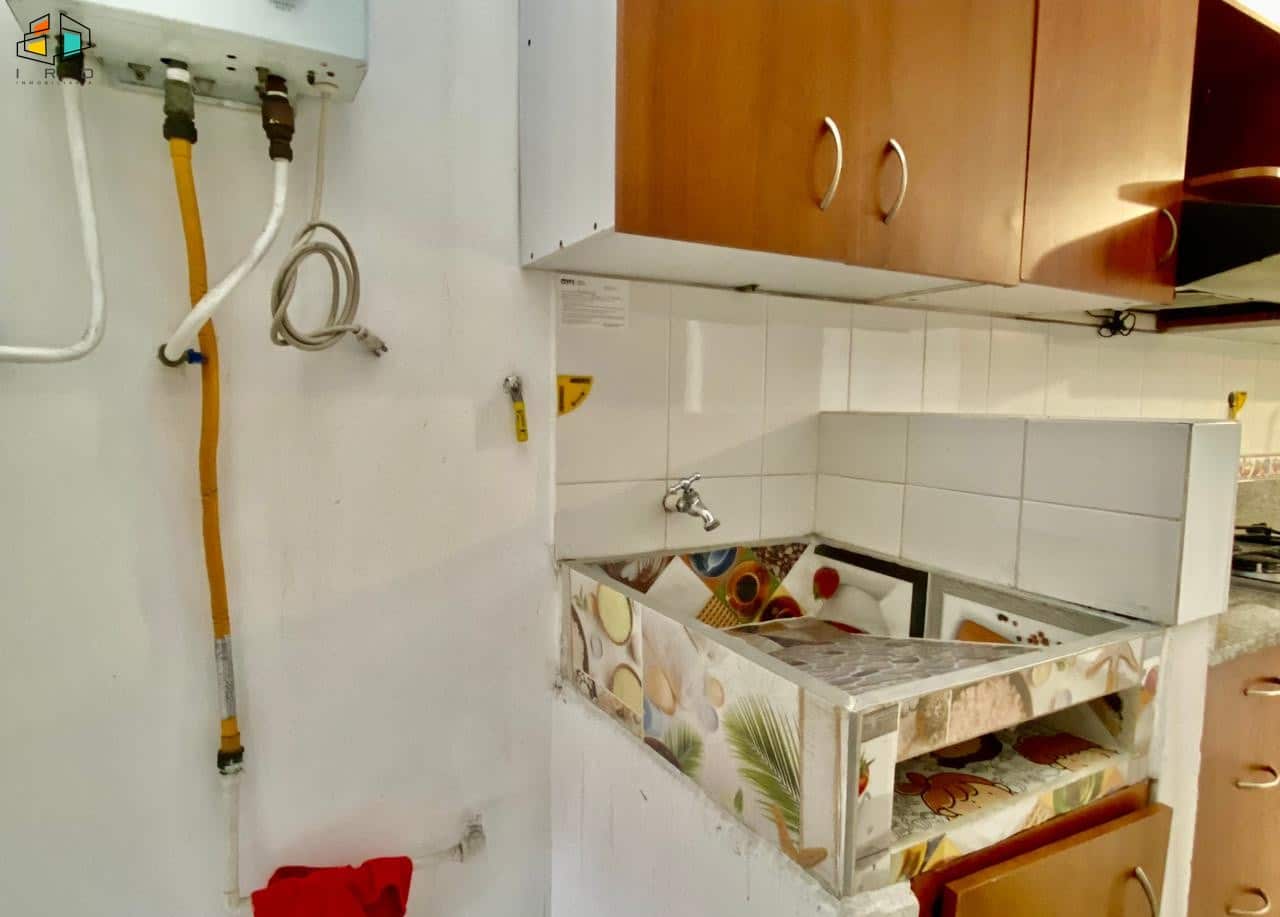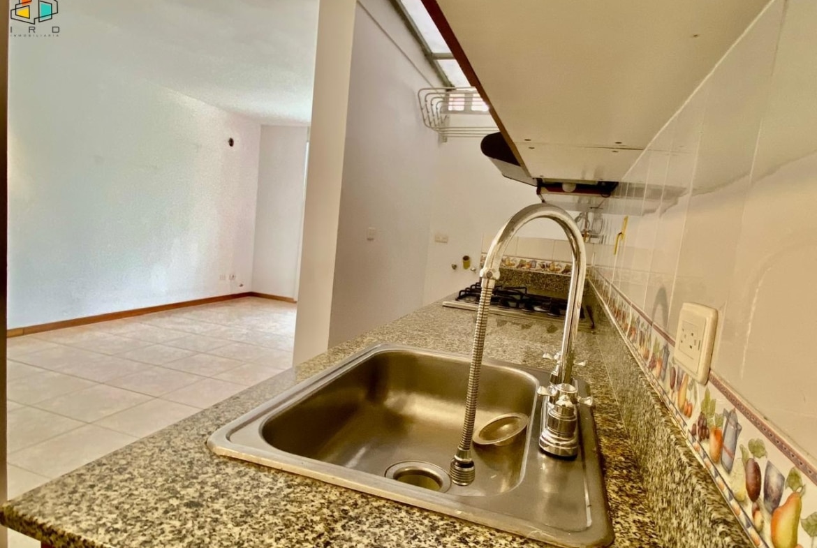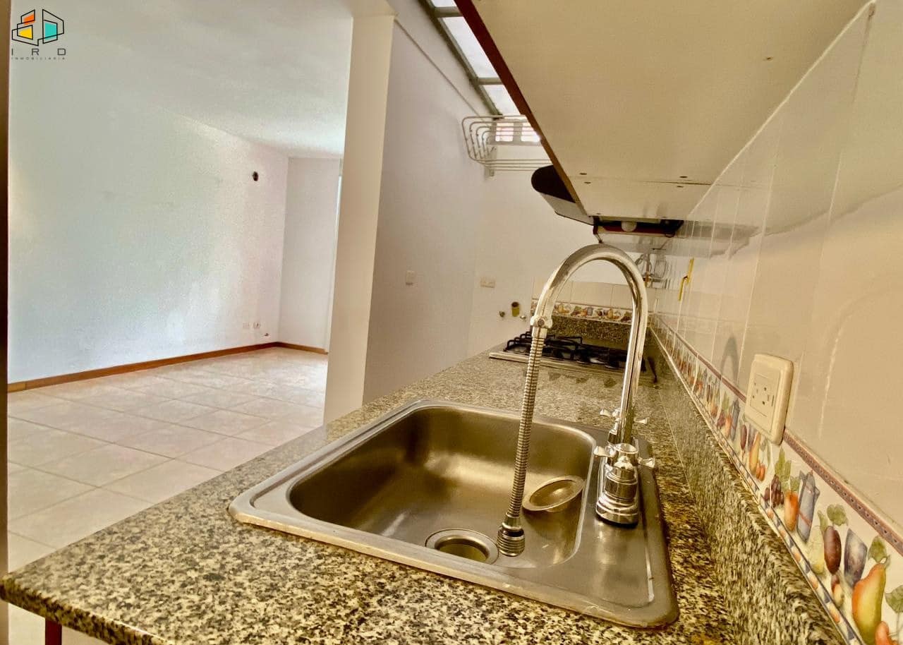 La cocina integral tiene concepto independiente e incluye horno, campana extractora y muebles superiores e inferiores de madera con acabados modernos. También cuenta con una zona de ropas equipada con calentador de agua.