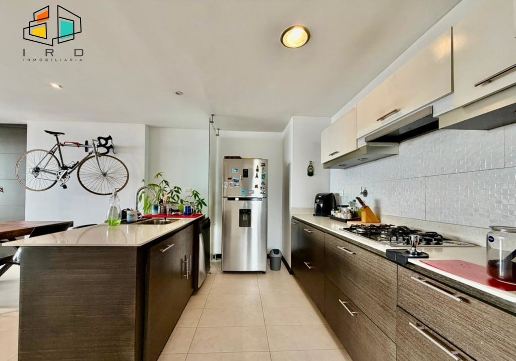 La cocina integral de concepto abierto es una obra maestra de diseño y funcionalidad, con muebles superiores e inferiores de finos acabados en madera, torre de hornos, lavaplatos eléctrico y una barra americana que se integra armoniosamente con el área social, ideal para el entretenimiento. La zona de ropas incluye un calentador de agua para su comodidad. Los pisos combinan la elegancia del porcelanato en las áreas sociales con la calidez de la madera en las habitaciones.