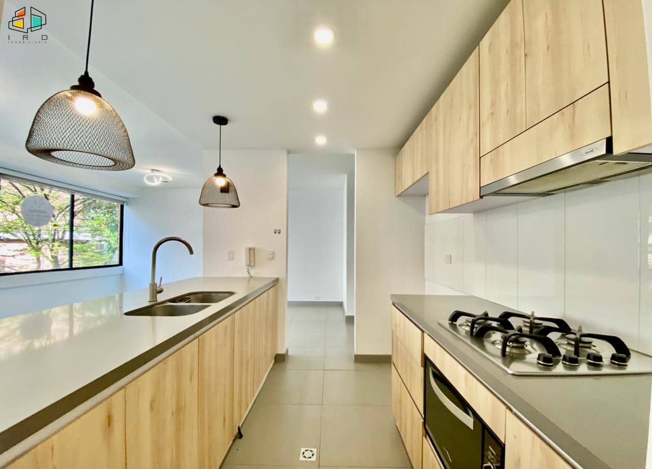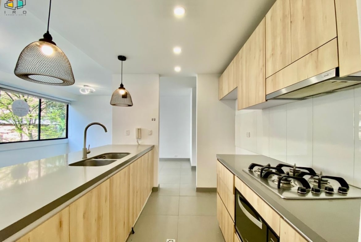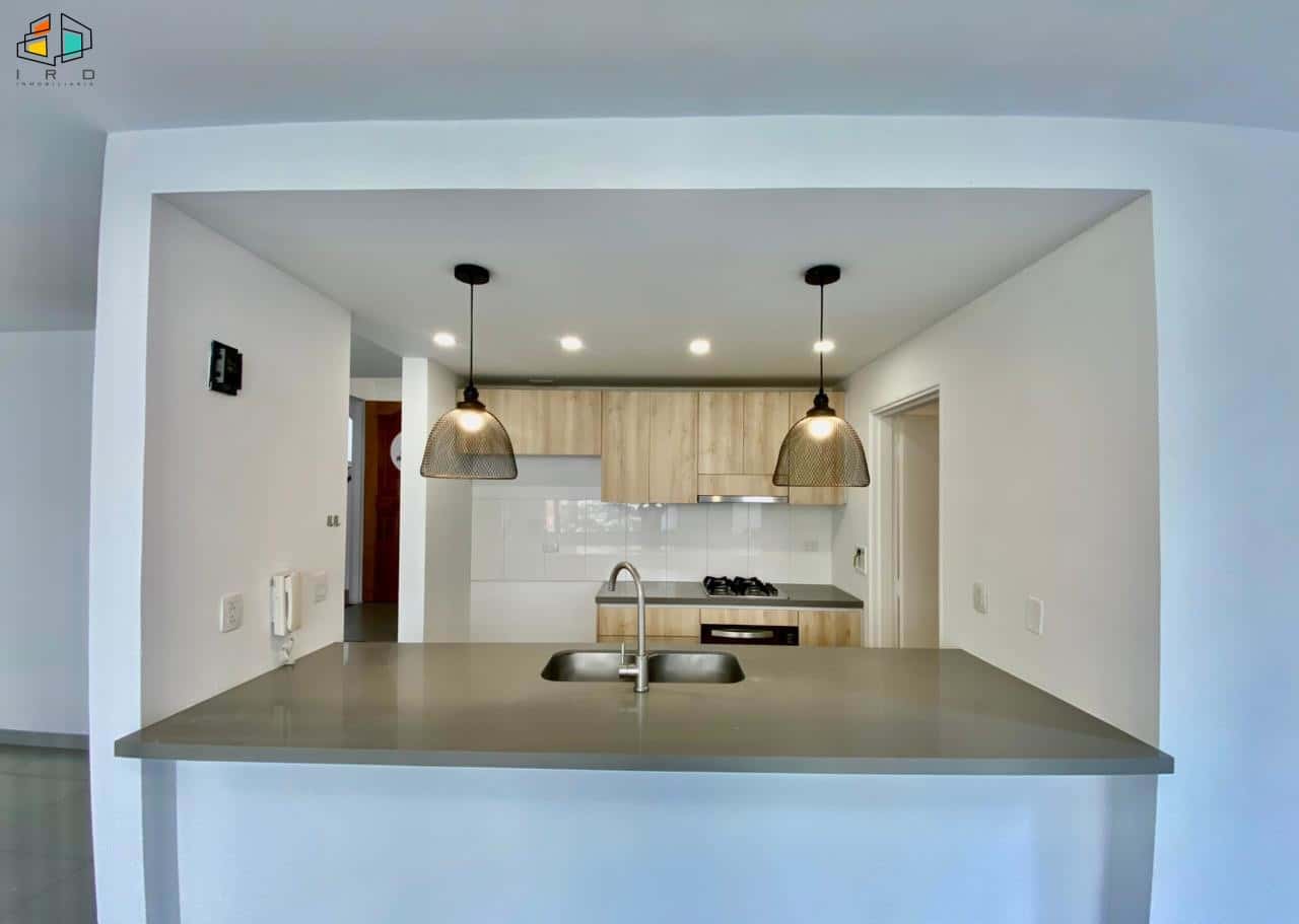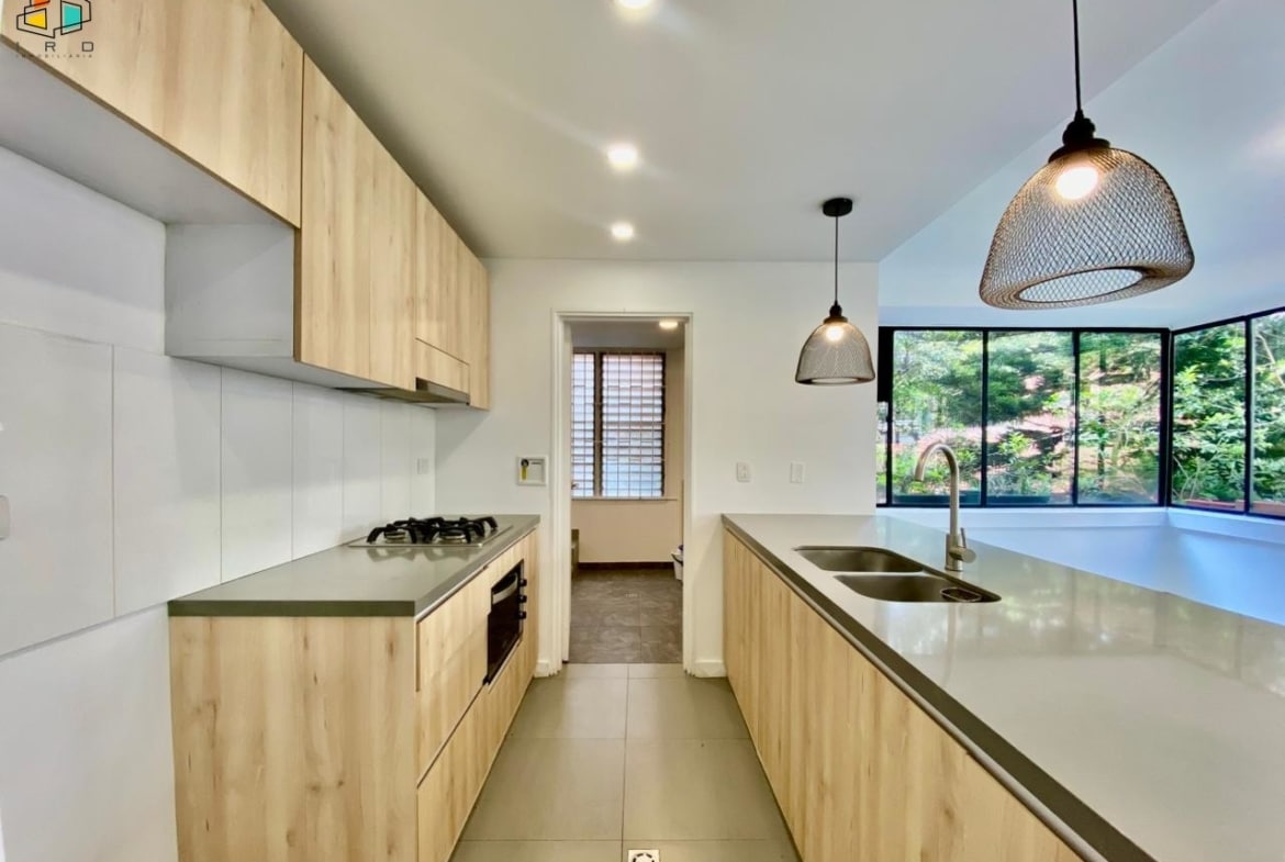La cocina integral independiente, recién remodelada, es una joya de diseño y funcionalidad. Equipada con una moderna barra americana, acabados en madera, gabinetes superiores e inferiores, horno, campana extractora y mesón de granito pulido, es el escenario perfecto para sus creaciones culinarias. La zona de ropas, con calentador de agua, añade practicidad al día a día.