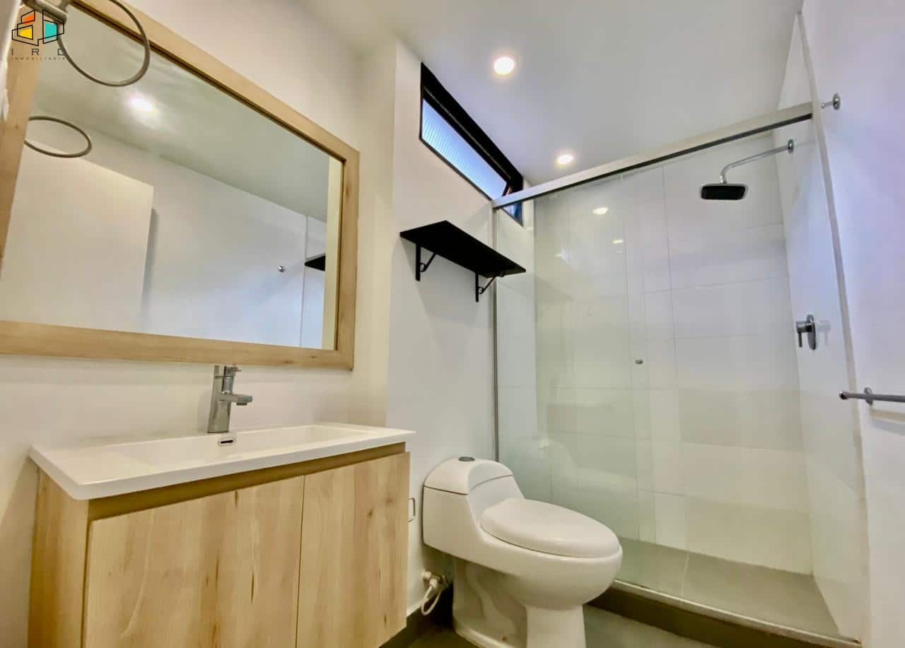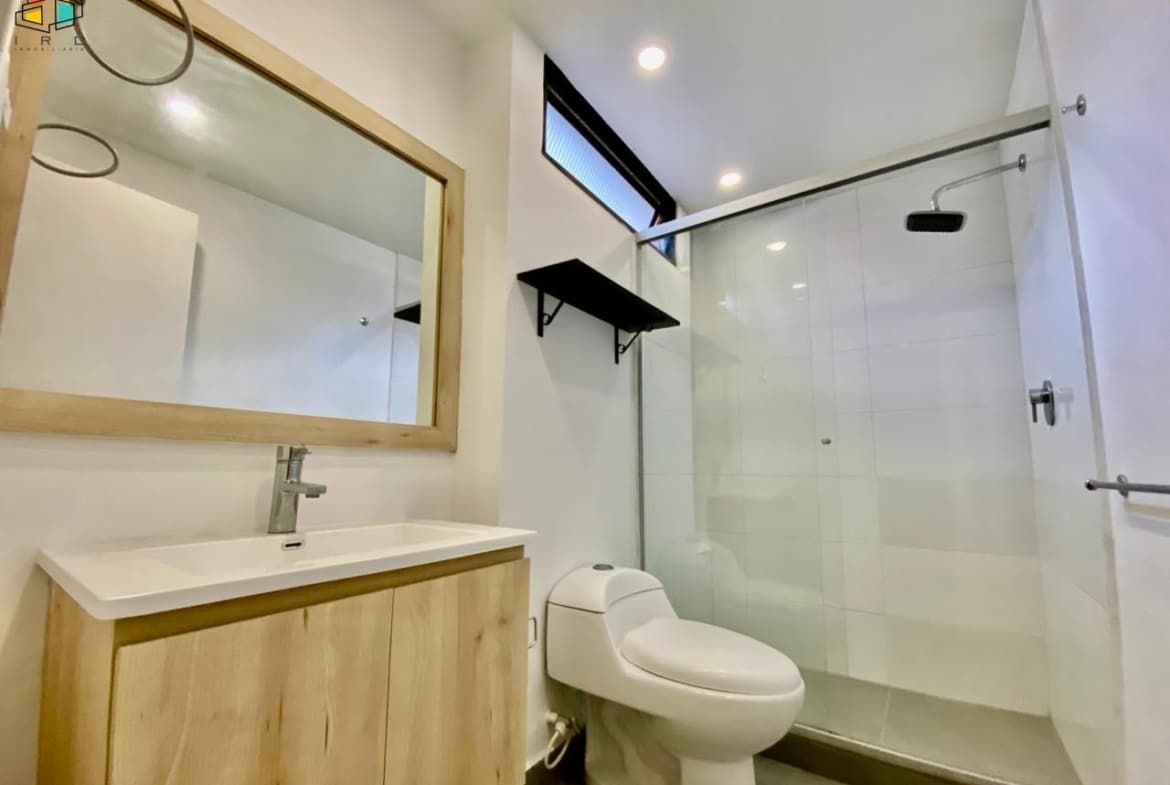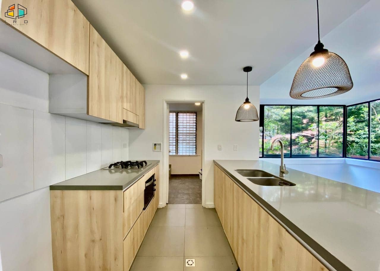 La cocina integral independiente, recién remodelada, es una joya de diseño y funcionalidad. Equipada con una moderna barra americana, acabados en madera, gabinetes superiores e inferiores, horno, campana extractora y mesón de granito pulido, es el escenario perfecto para sus creaciones culinarias. La zona de ropas, con calentador de agua, añade practicidad al día a día.