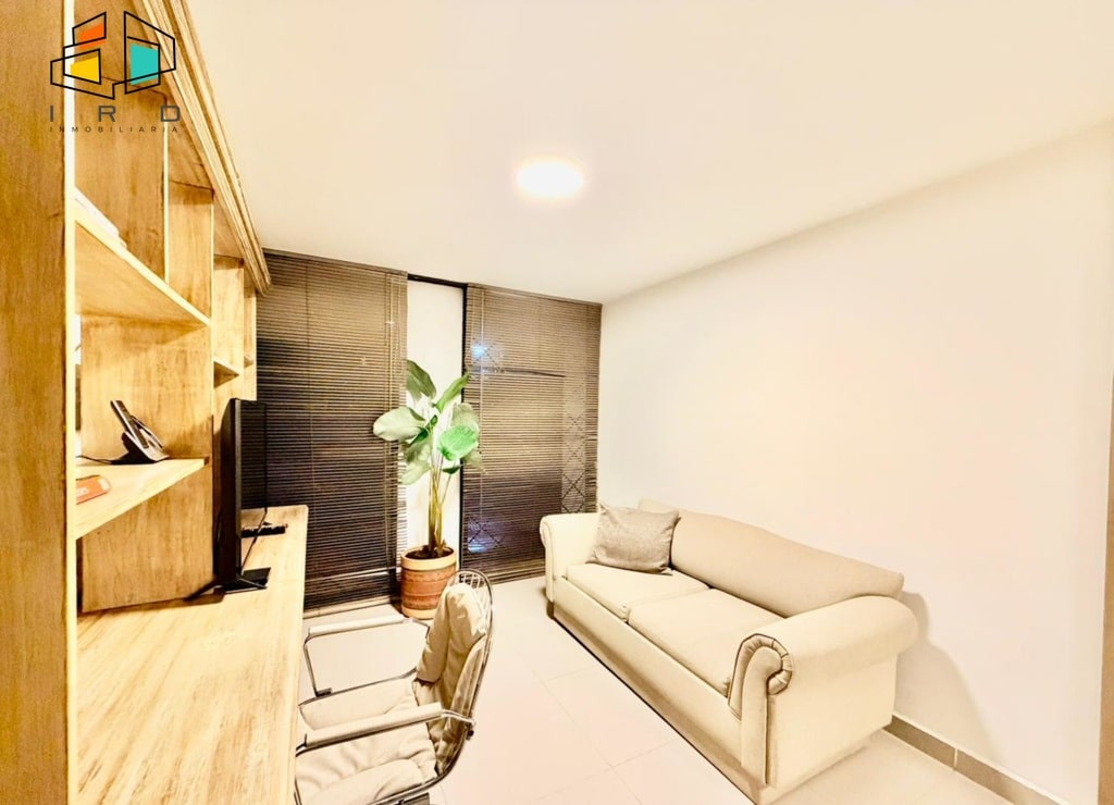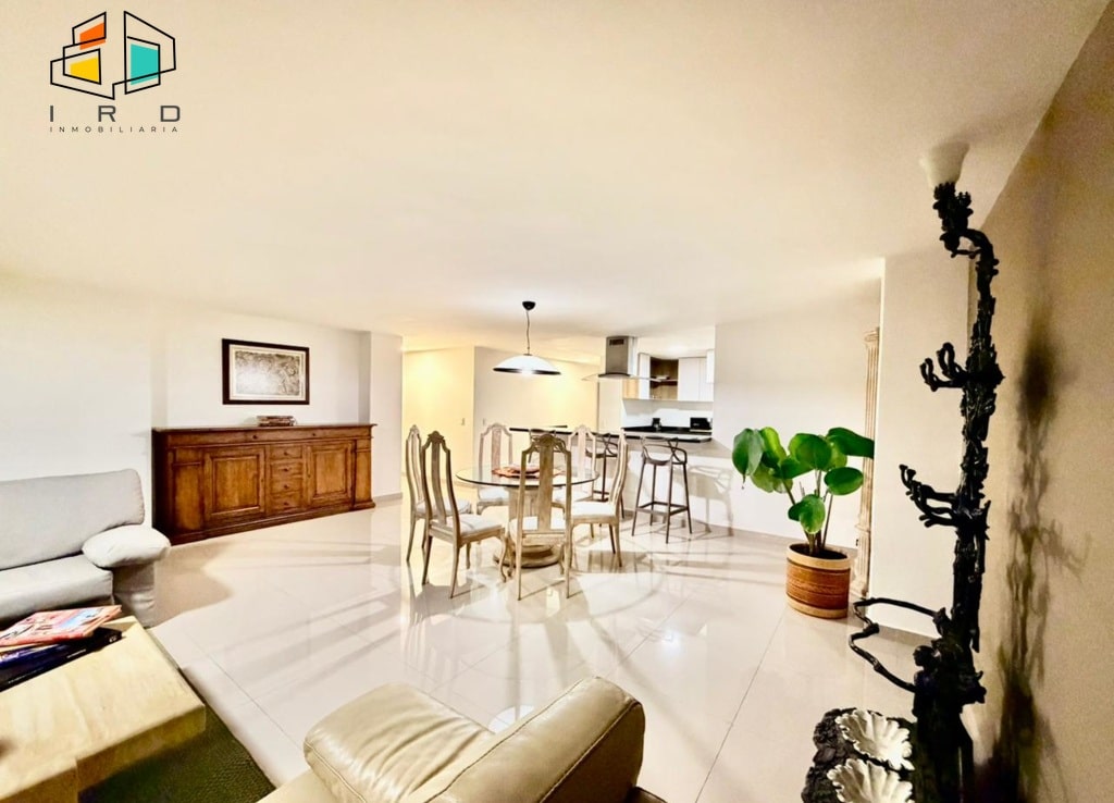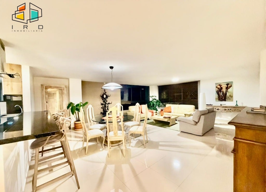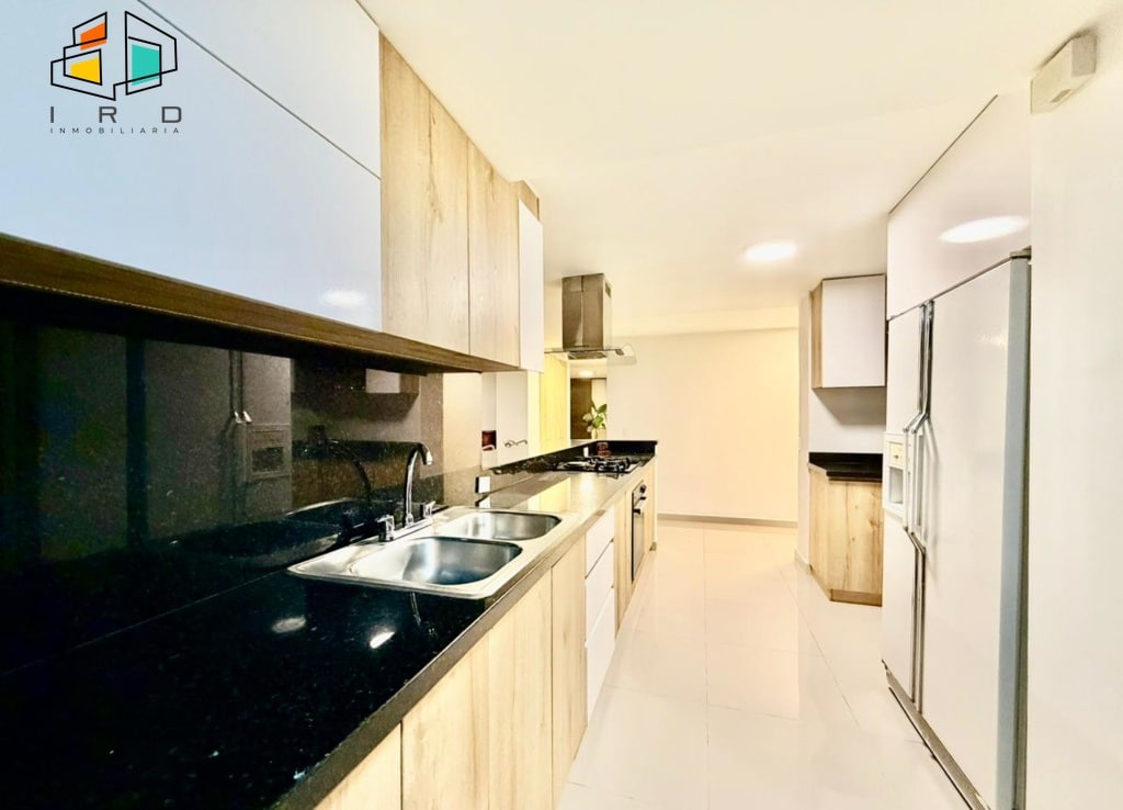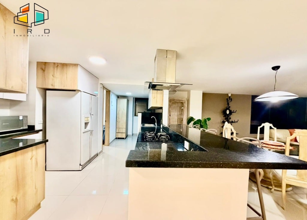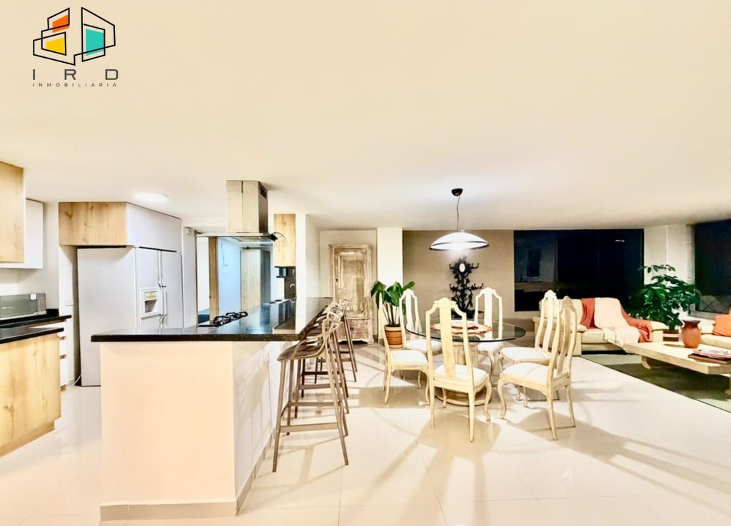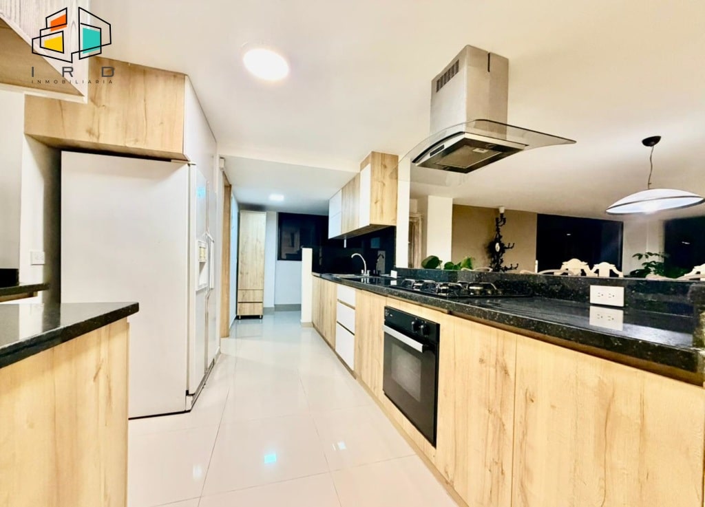 El salón comedor es un espacio amplio y luminoso, con pisos de cerámica e iluminación LED que realza su mobiliario moderno y confortable. Sus amplios ventanales garantizan una excelente iluminación natural, creando una atmósfera cálida y acogedora. La cocina integral de concepto abierto es un deleite para los amantes de la gastronomía; amplia e iluminada, cuenta con muebles superiores e inferiores en madera, horno, campana extractora y una barra americana que conecta fluidamente con la zona social. Está completamente dotada con los utensilios básicos de cocina para su conveniencia.