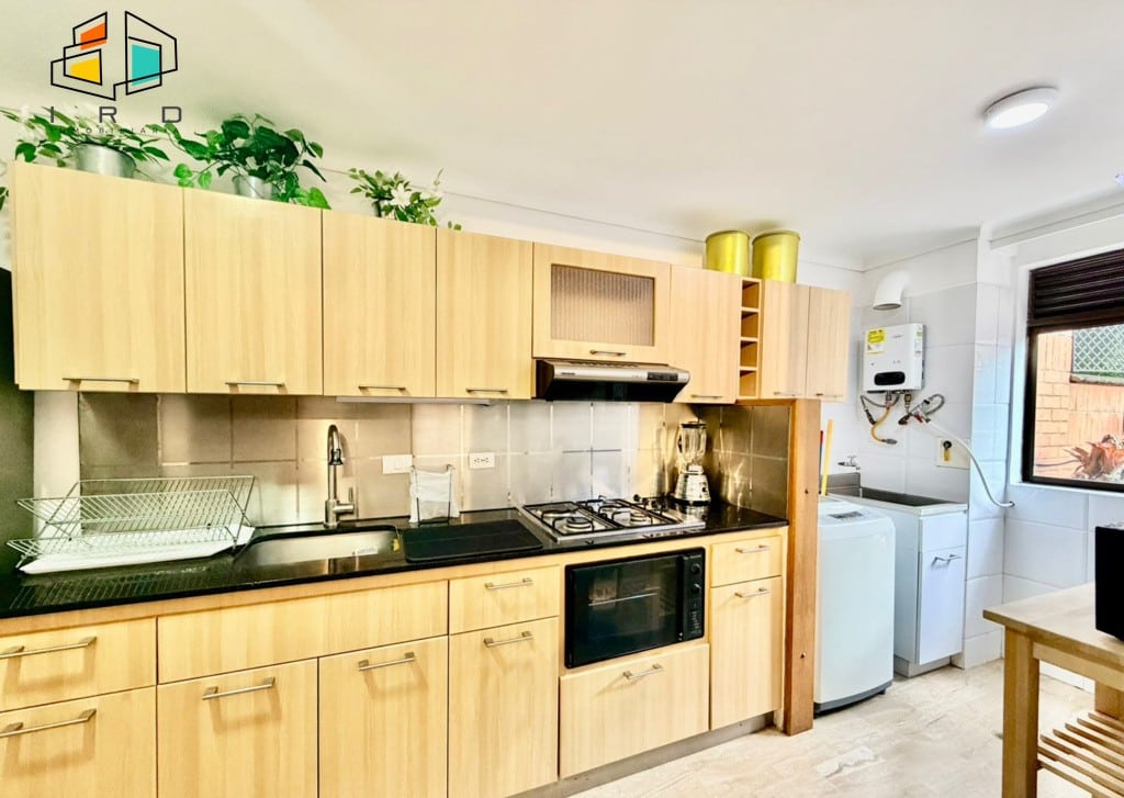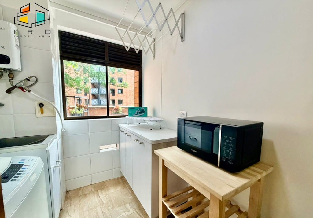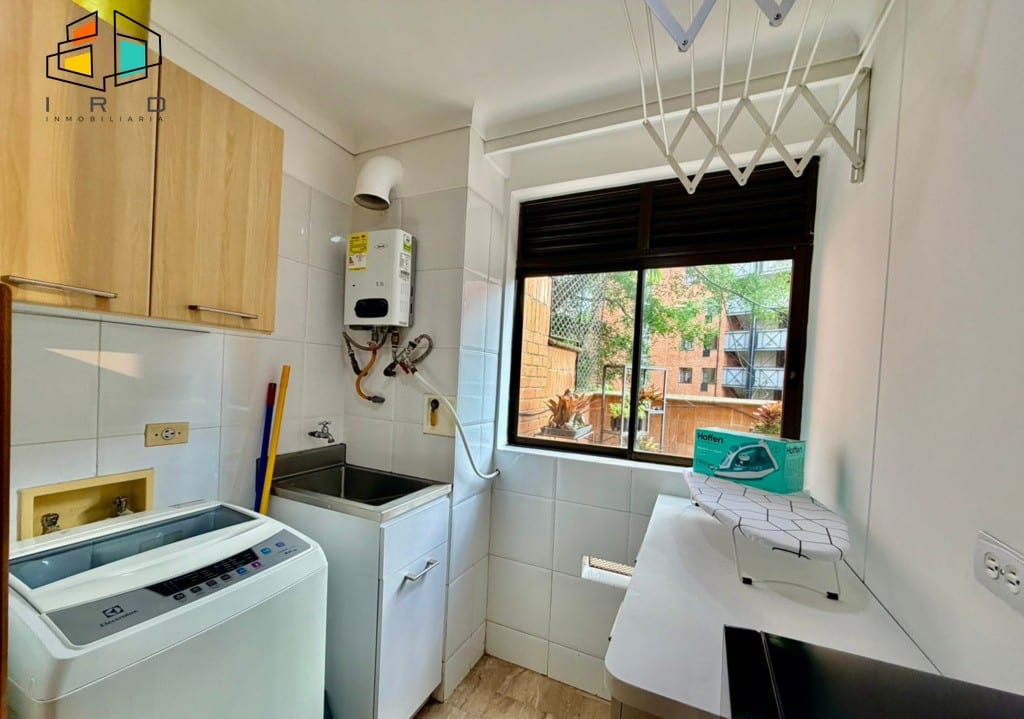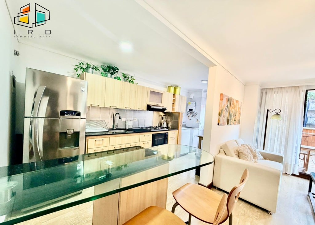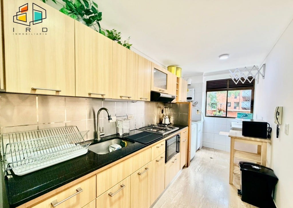 La cocina integral de concepto abierto, con gabinetes superiores e inferiores en acabados de madera, está equipada con horno, campana extractora, cubierta de cuatro puestos a gas y una barra americana que conecta con el área social. Incluye utensilios básicos de cocina para su comodidad. La zona de ropas cuenta con lavadora y calentador de agua. Los pisos de madera laminada y los acabados modernos se complementan con una excelente iluminación natural y vistas privilegiadas.