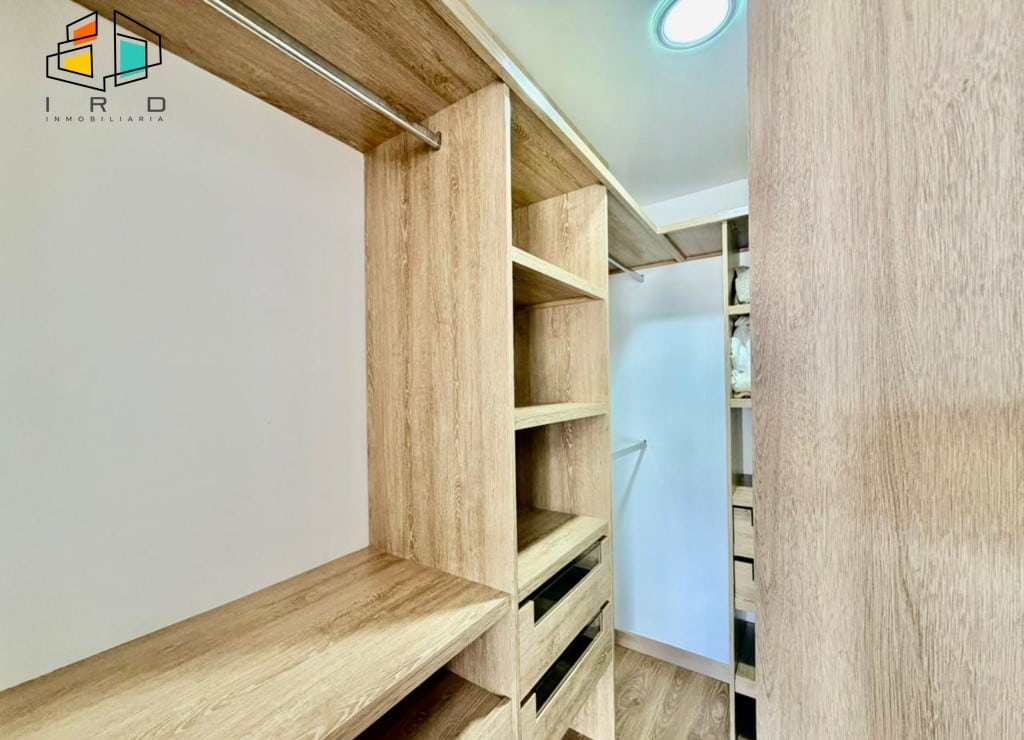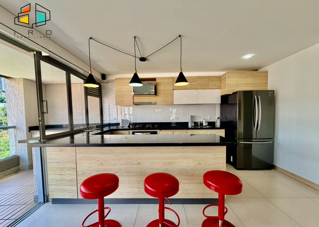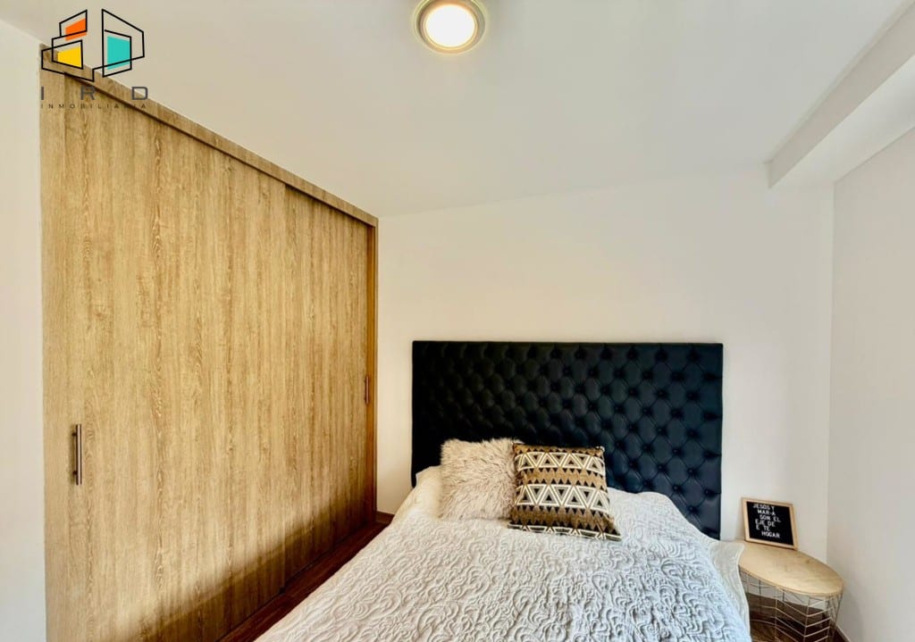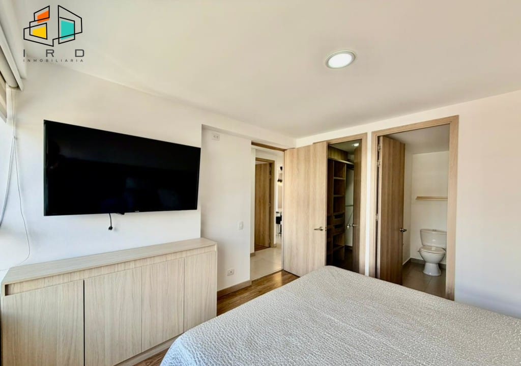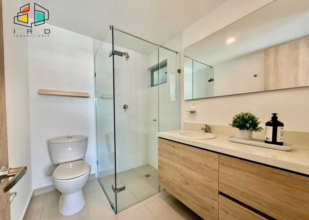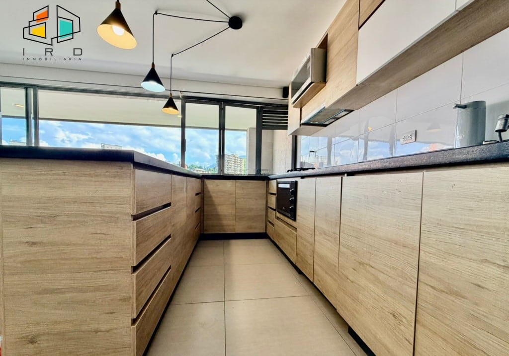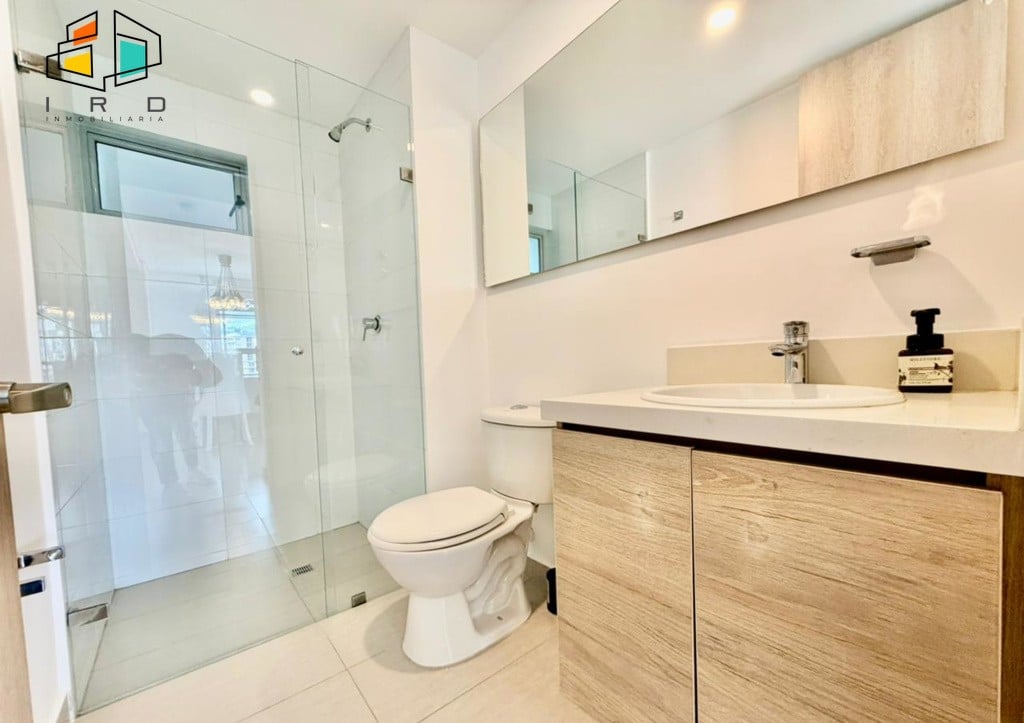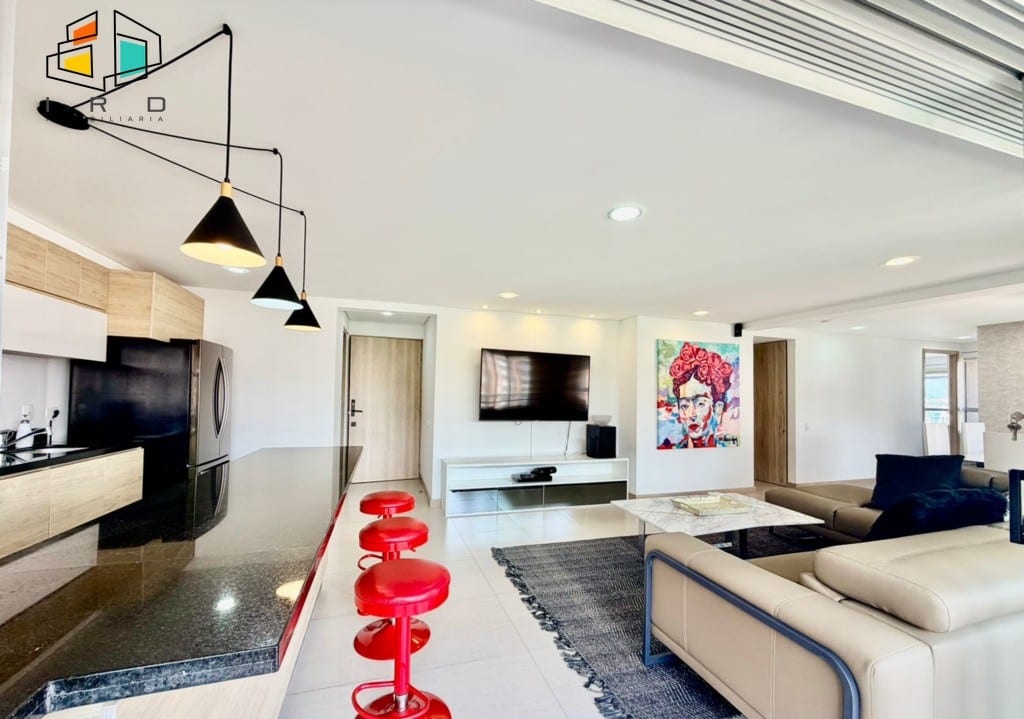 El salón comedor, amplio e iluminado, se presenta con mobiliario moderno y confortable, además de un Smart TV, creando el ambiente perfecto para el entretenimiento y la relajación. La cocina integral de concepto abierto, con acabados en madera, horno, campana extractora y completamente dotada con utensilios básicos y un Nevecon, se integra armoniosamente con el área social y el balcón a través de una elegante barra americana. La zona de ropas incluye calentador de agua y lavadora para su comodidad.