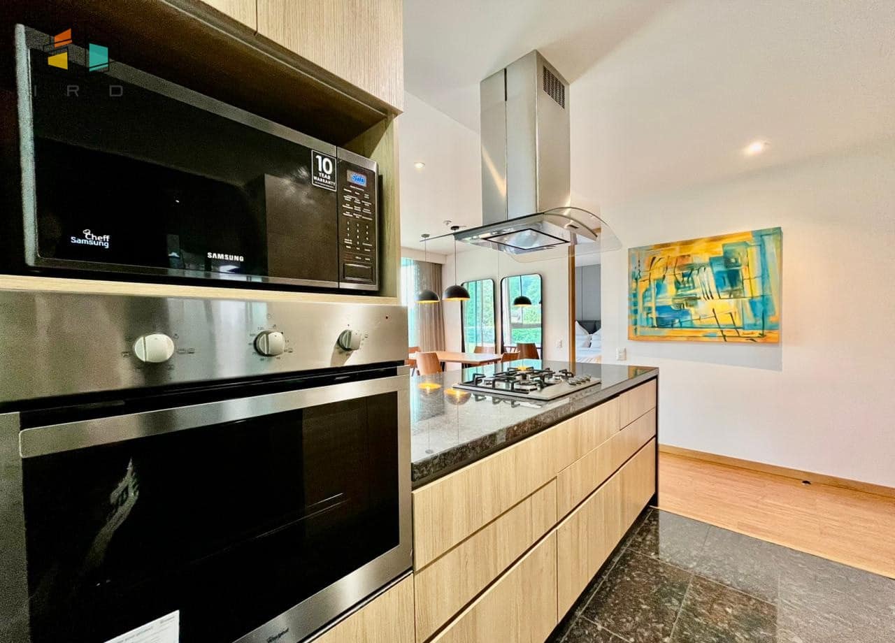 * Cocina integral de concepto abierto, que incluye gabinetes tanto superiores como inferiores, campana extractora, estufa de cuatro puestos a gas y horno. Además, cuenta con una barra americana que se conecta a la zona social, totalmente equipada para tu comodidad.