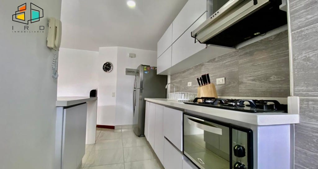 La cocina integral, completamente remodelada, es el sueño de todo chef. Equipada con horno, campana extractora y un fogón de 4 puestos a gas, cuenta con muebles en madera de alta calidad y una práctica barra americana que se integra armoniosamente con la zona social, ideal para el entretenimiento. Además, se entrega dotada con los utensilios básicos de cocina. La zona de ropas incluye lavadora y calentador de agua para su conveniencia. Los pisos en cerámica aportan un toque de elegancia y facilidad de mantenimiento.
