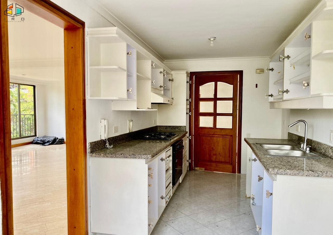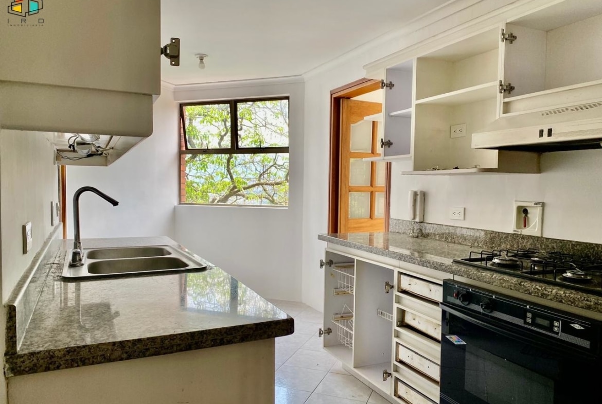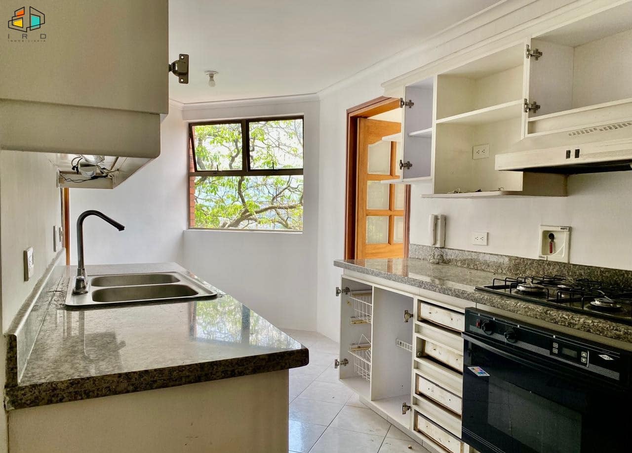 El salón comedor es amplio e iluminado, con pisos en cerámica que aportan calidez y elegancia. El balcón, con puerta ventana de piso a techo, te invita a disfrutar de un entorno rodeado de naturaleza y aire puro, un verdadero oasis urbano. La cocina integral, de concepto independiente, está completamente equipada con horno, campana extractora y modernos muebles de madera, tanto superiores como inferiores, ofreciendo funcionalidad y estilo. La zona de ropas cuenta con calentador de agua.