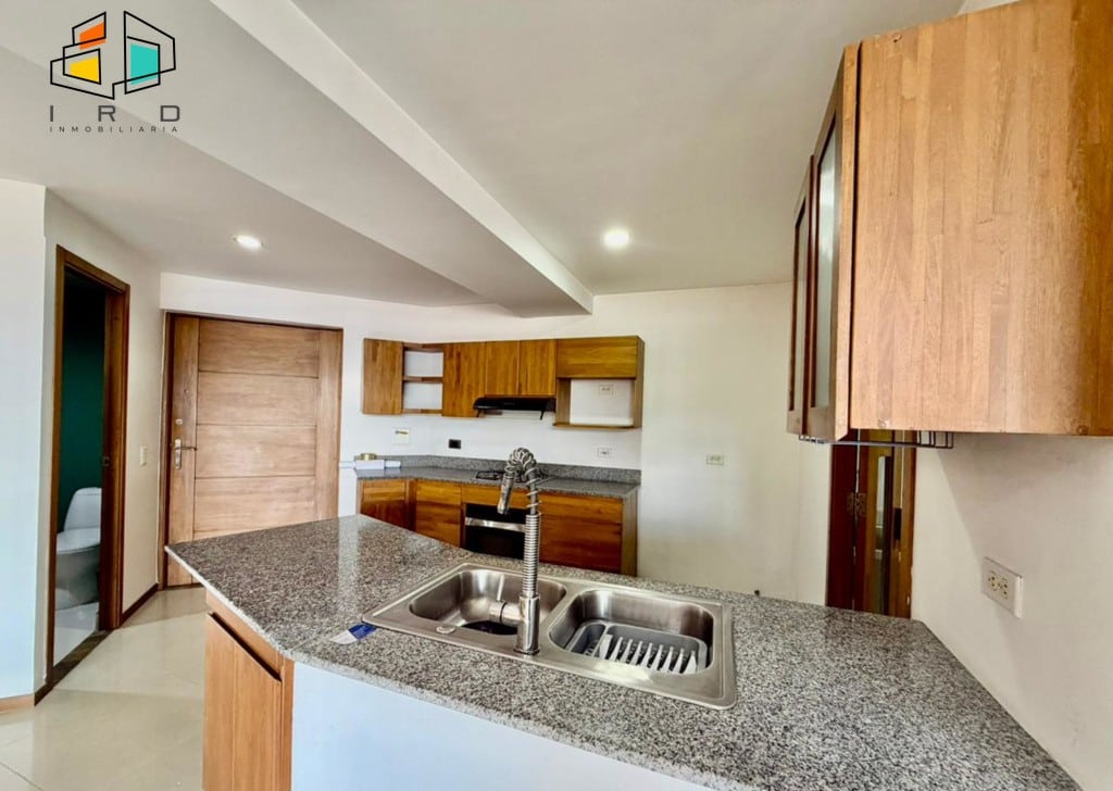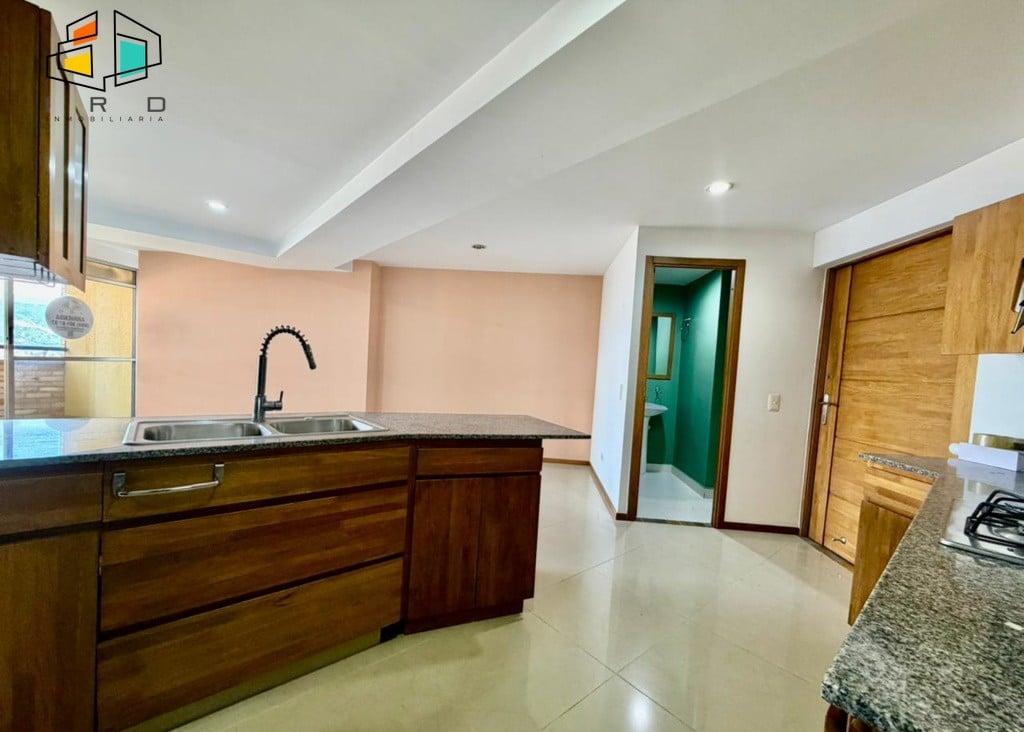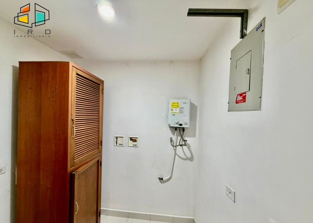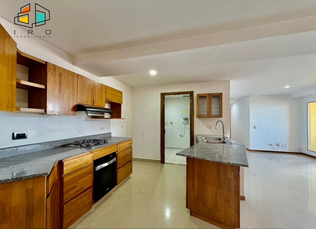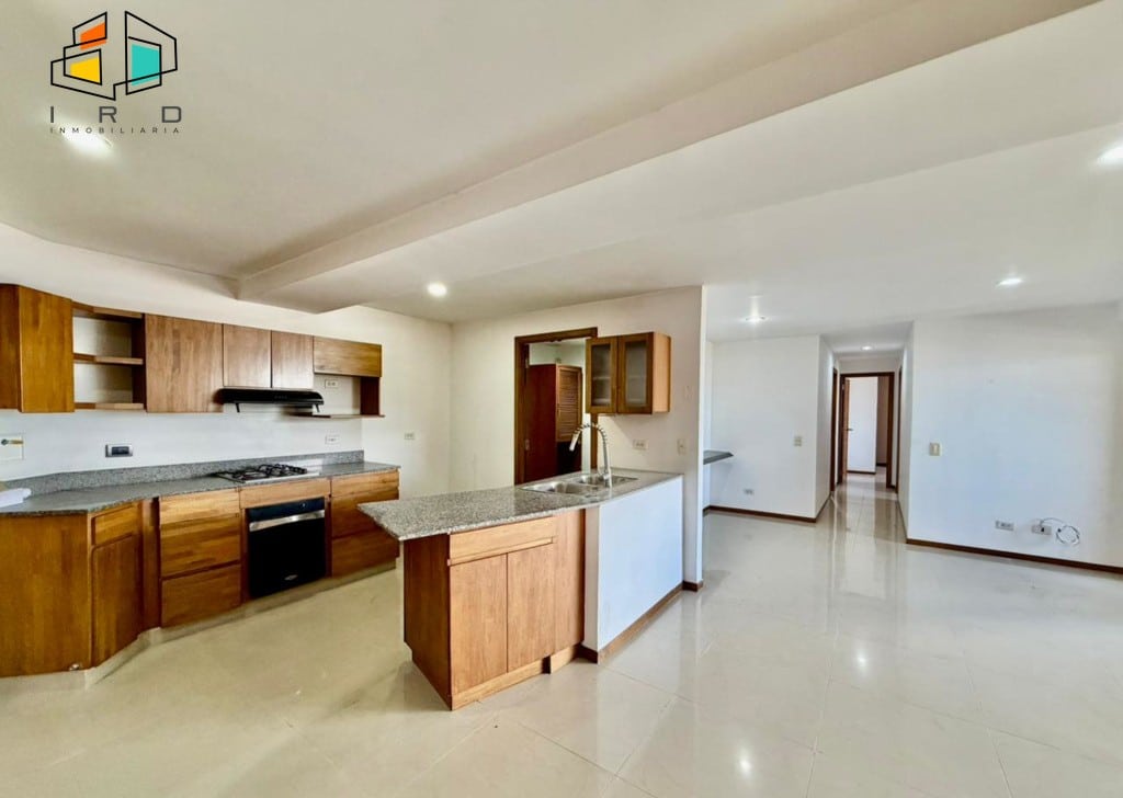 La cocina integral de concepto abierto es el corazón del hogar, equipada con muebles superiores e inferiores en acabados de madera, horno, campana extractora, cubierta de cuatro puestos a gas y una barra americana que conecta armoniosamente con el área social, perfecta para el entretenimiento. La zona de ropas es independiente y cuenta con calentador de agua.