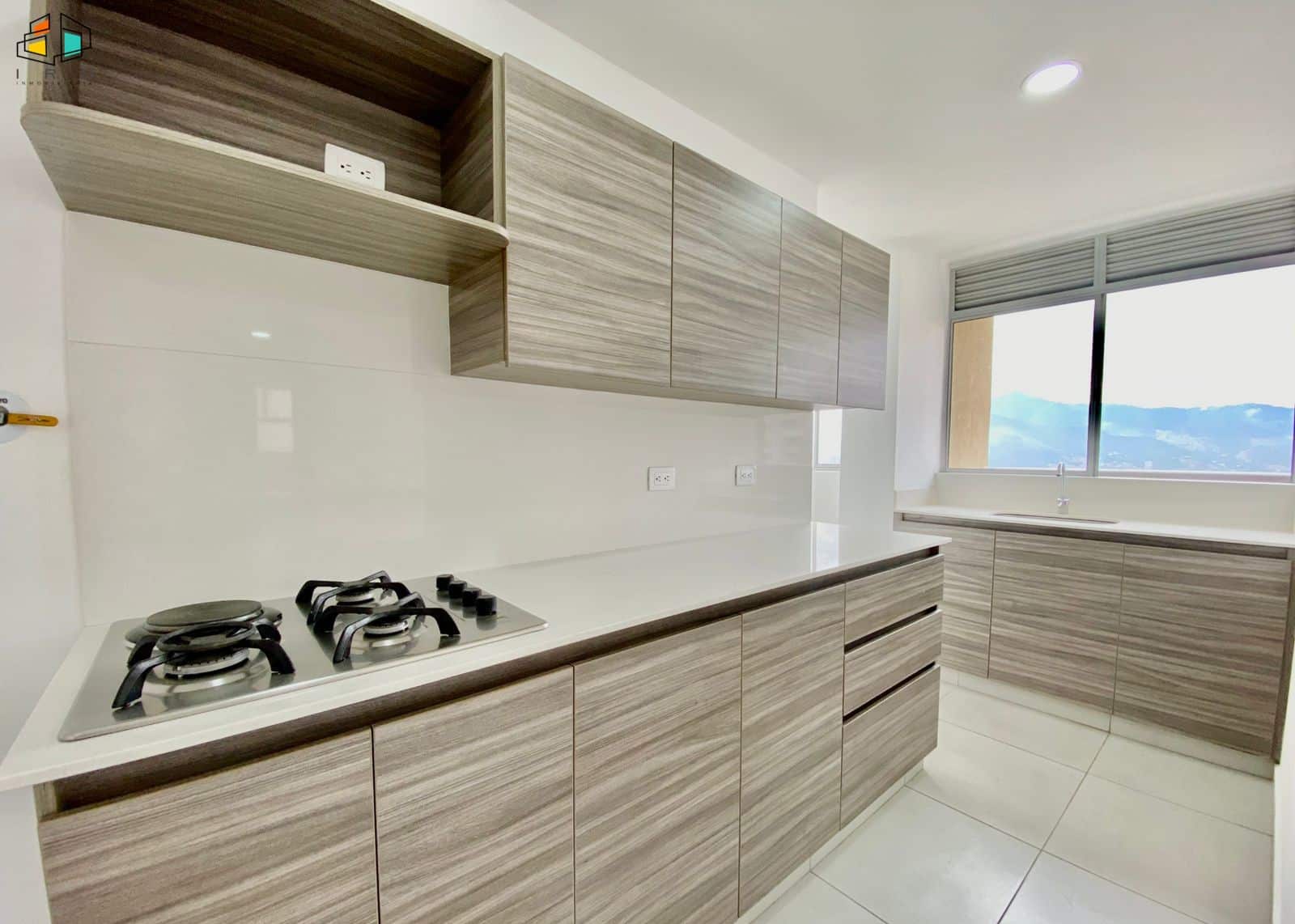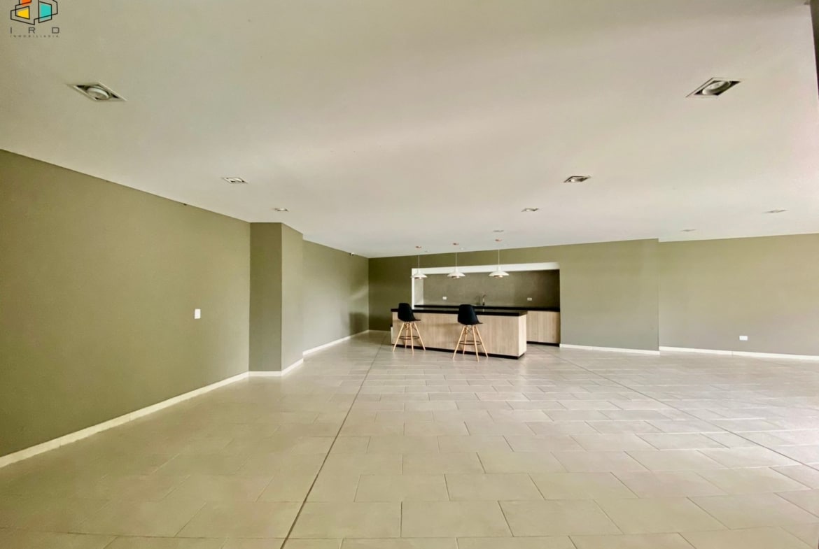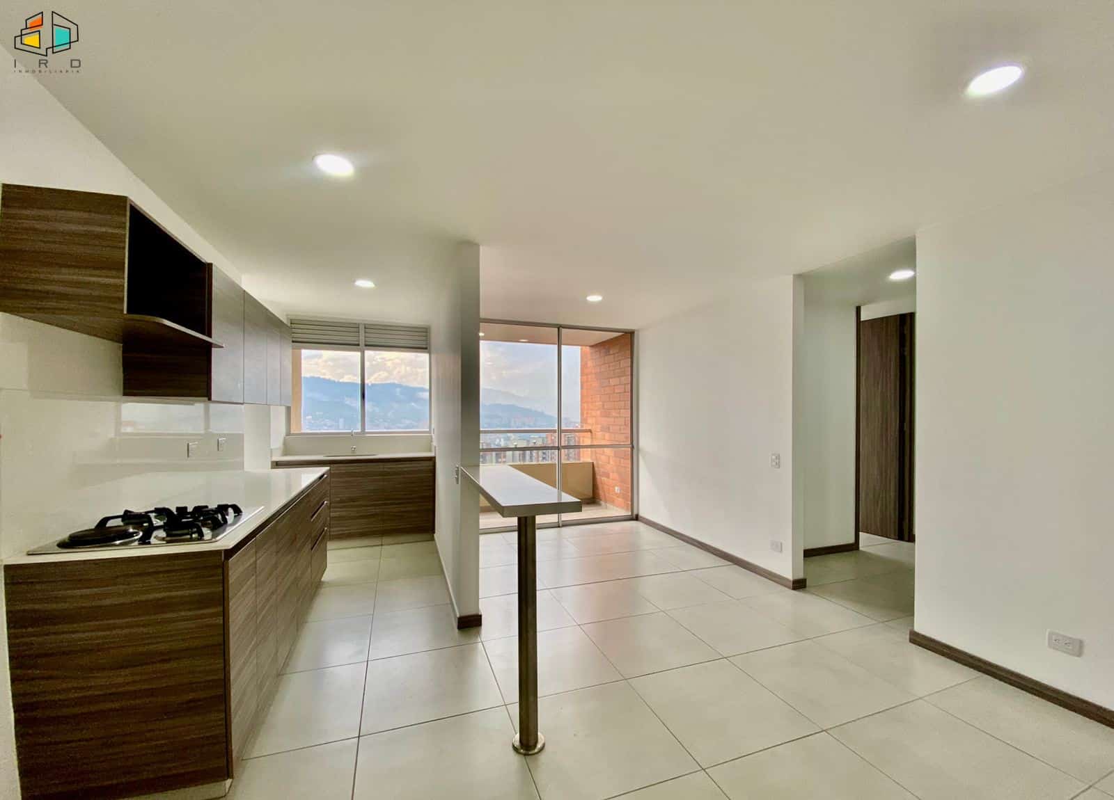 El salón comedor, amplio e iluminado, se realza con elegantes pisos de madera laminada, creando un ambiente cálido y acogedor. Un balcón invita a disfrutar de las vistas y el aire fresco. La cocina integral de concepto abierto, con una moderna barra americana, conecta fluidamente con el área social, ideal para compartir momentos inolvidables. Equipada con muebles superiores e inferiores de madera y acabados contemporáneos, incluye una estufa a gas de cuatro puestos. La zona de ropas independiente cuenta con calentador de agua.
