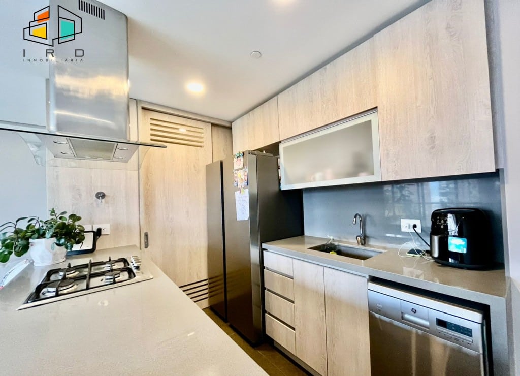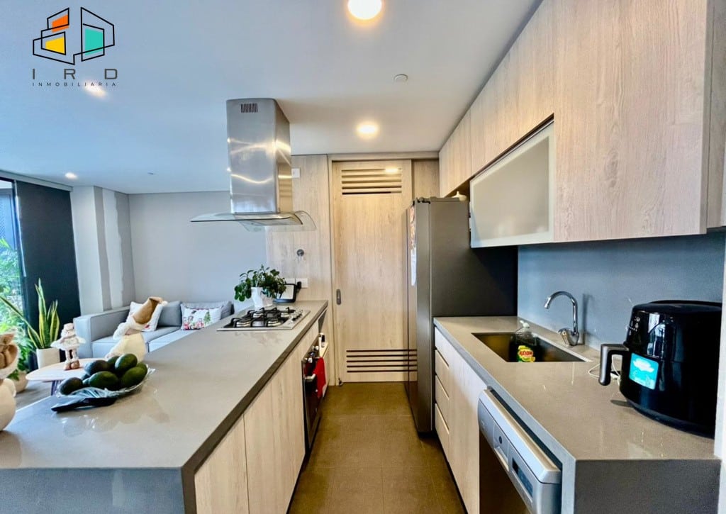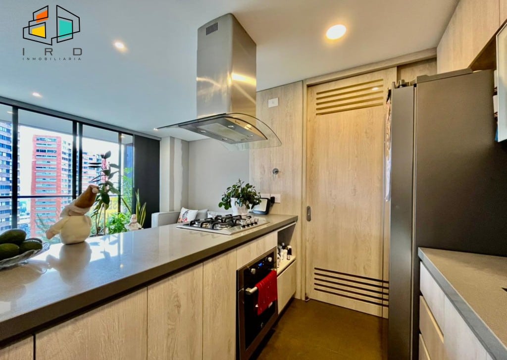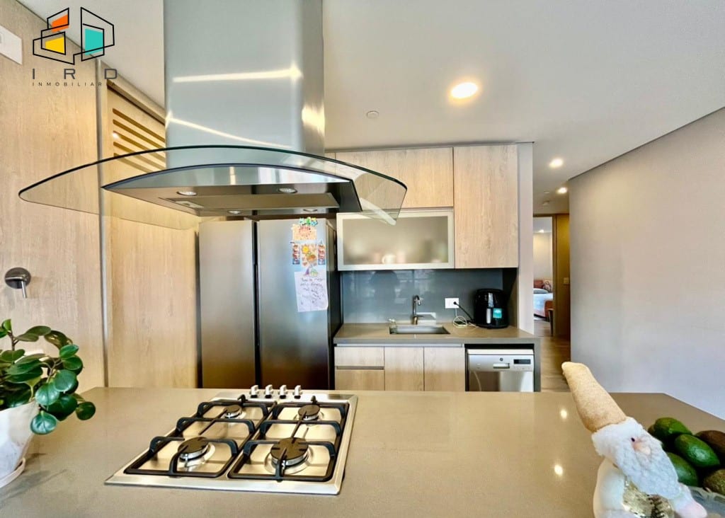 El salón comedor, un espacio generoso y luminoso con pisos de madera e iluminación LED, se integra armoniosamente con un amplio balcón que ofrece una vista panorámica impresionante de la ciudad, ideal para el entretenimiento o la relajación. La cocina integral, de concepto abierto y diseño moderno, destaca por sus acabados en madera, lavaplatos eléctrico, horno, campana extractora, cubierta de 4 puestos a gas y una elegante barra americana que conecta con el área social, creando un ambiente fluido y contemporáneo. La zona de ropas es independiente e incluye calentador de agua.