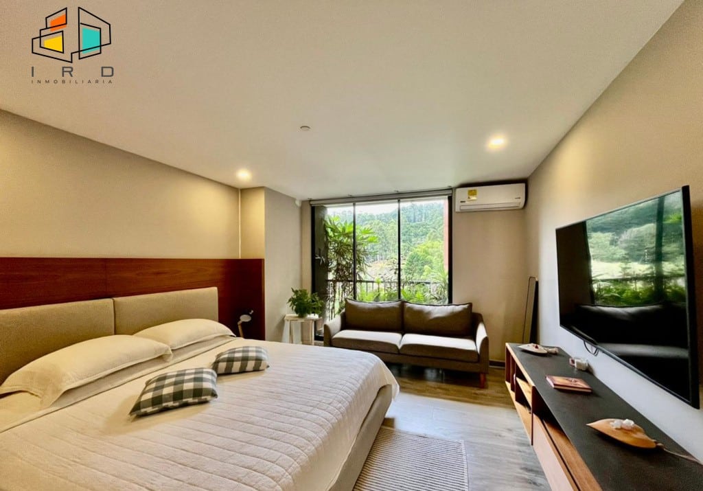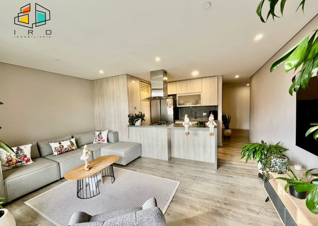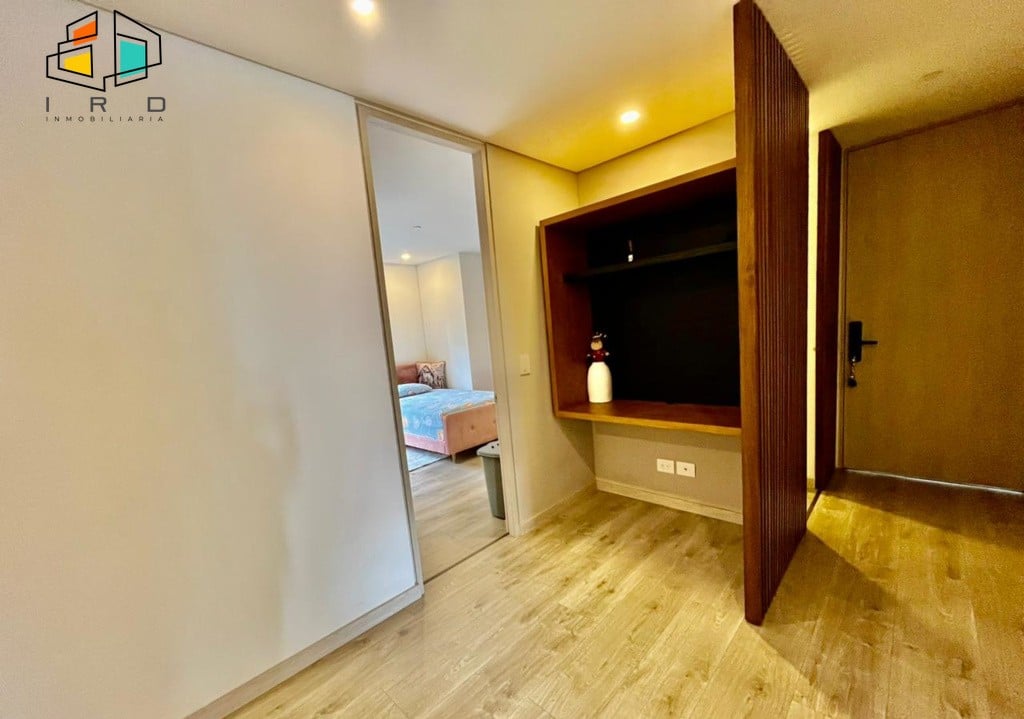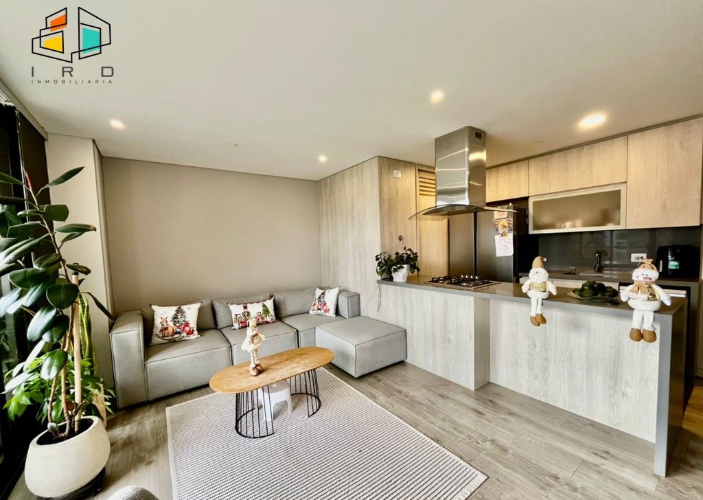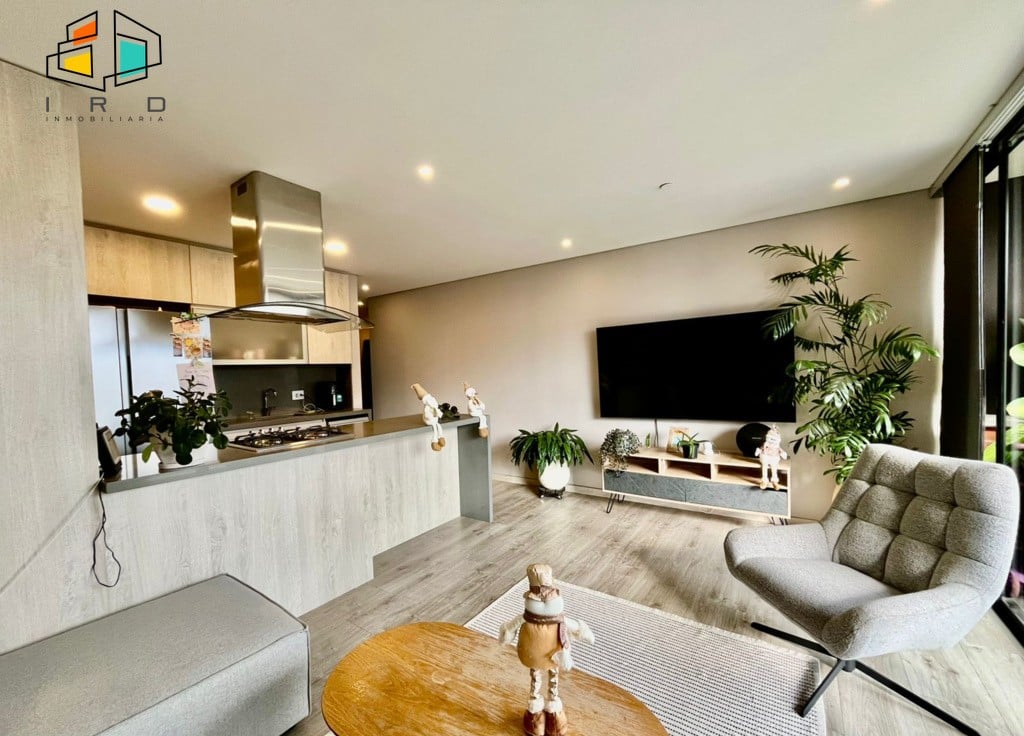 El salón comedor, un espacio generoso y luminoso con pisos de madera e iluminación LED, se integra armoniosamente con un amplio balcón que ofrece una vista panorámica impresionante de la ciudad, ideal para el entretenimiento o la relajación. La cocina integral, de concepto abierto y diseño moderno, destaca por sus acabados en madera, lavaplatos eléctrico, horno, campana extractora, cubierta de 4 puestos a gas y una elegante barra americana que conecta con el área social, creando un ambiente fluido y contemporáneo. La zona de ropas es independiente e incluye calentador de agua.