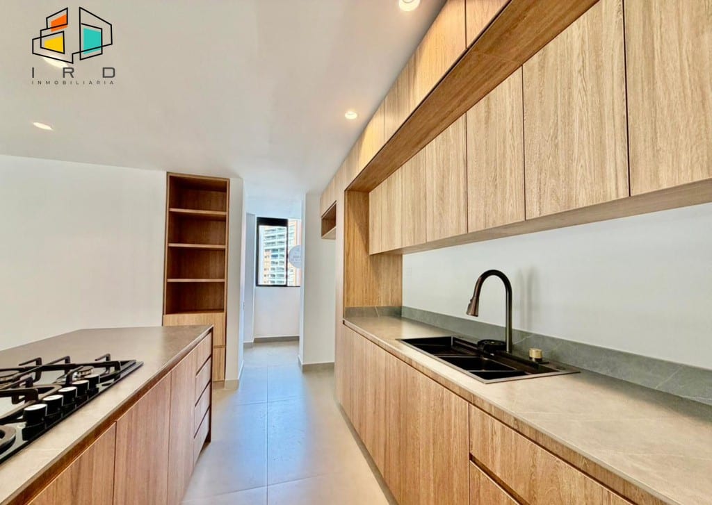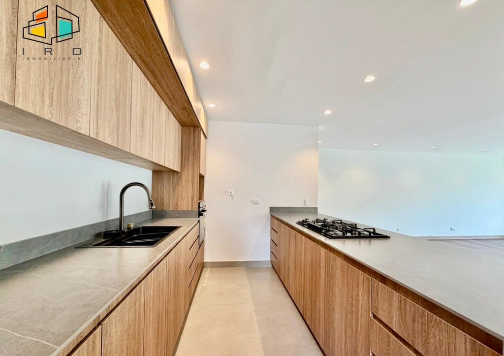 – Diseño de concepto abierto, completamente terminada con gabinetes superiores e inferiores en aglomerado color madera, horno, lavaplatos empotrado en mesón de mármol y cubierta de cinco puestos a gas. Barra americana tipo isla que conecta con el área social.