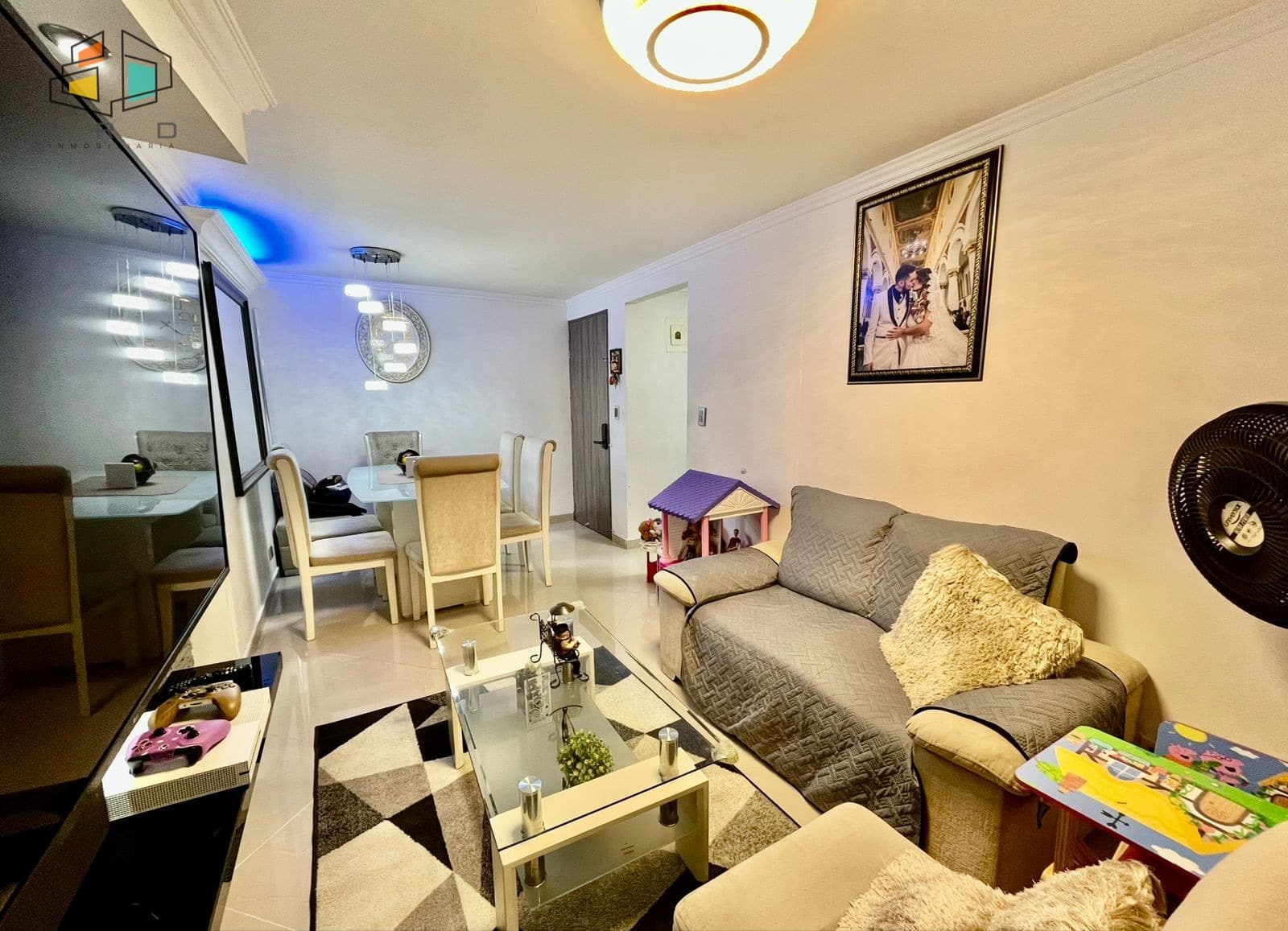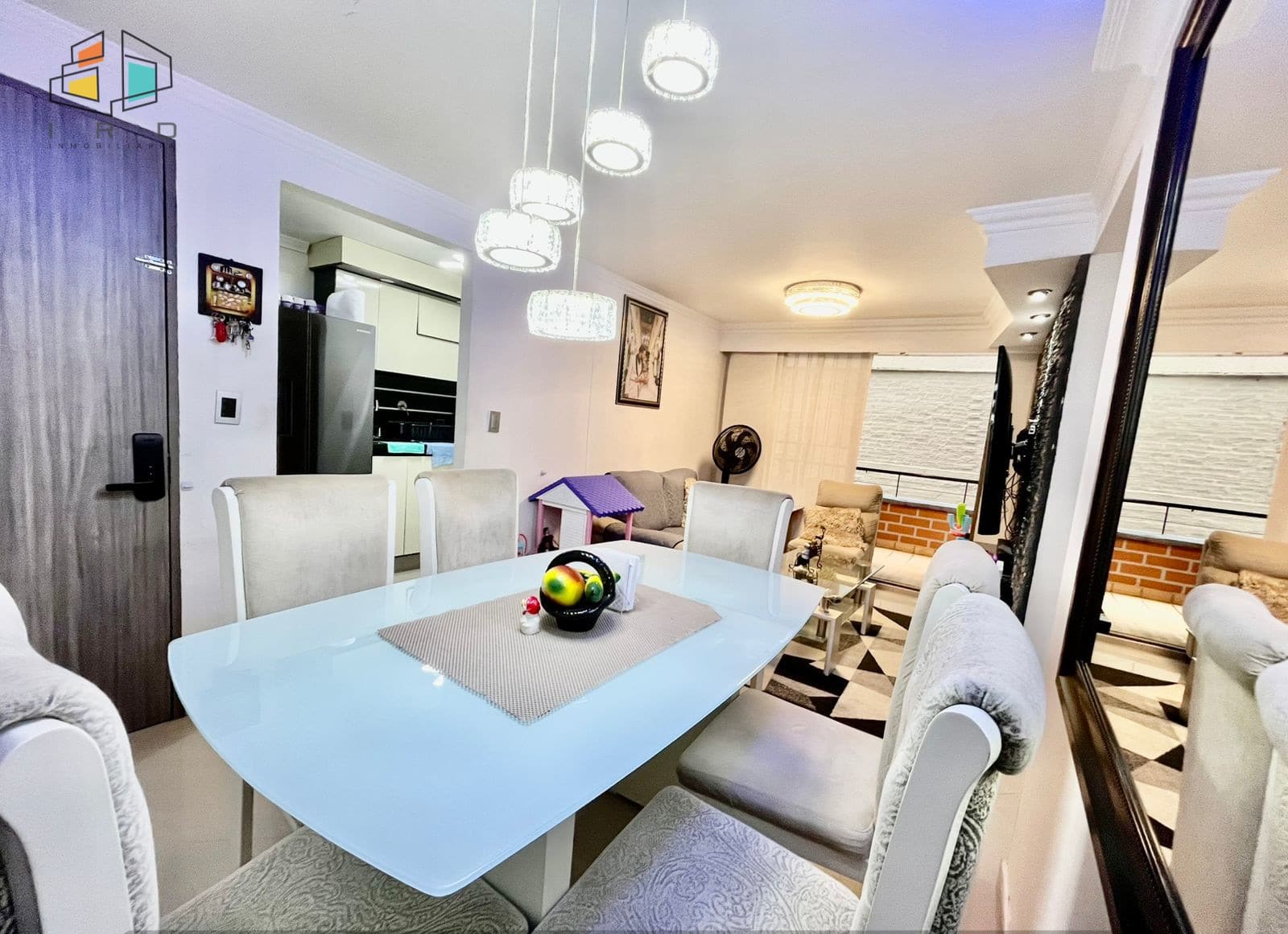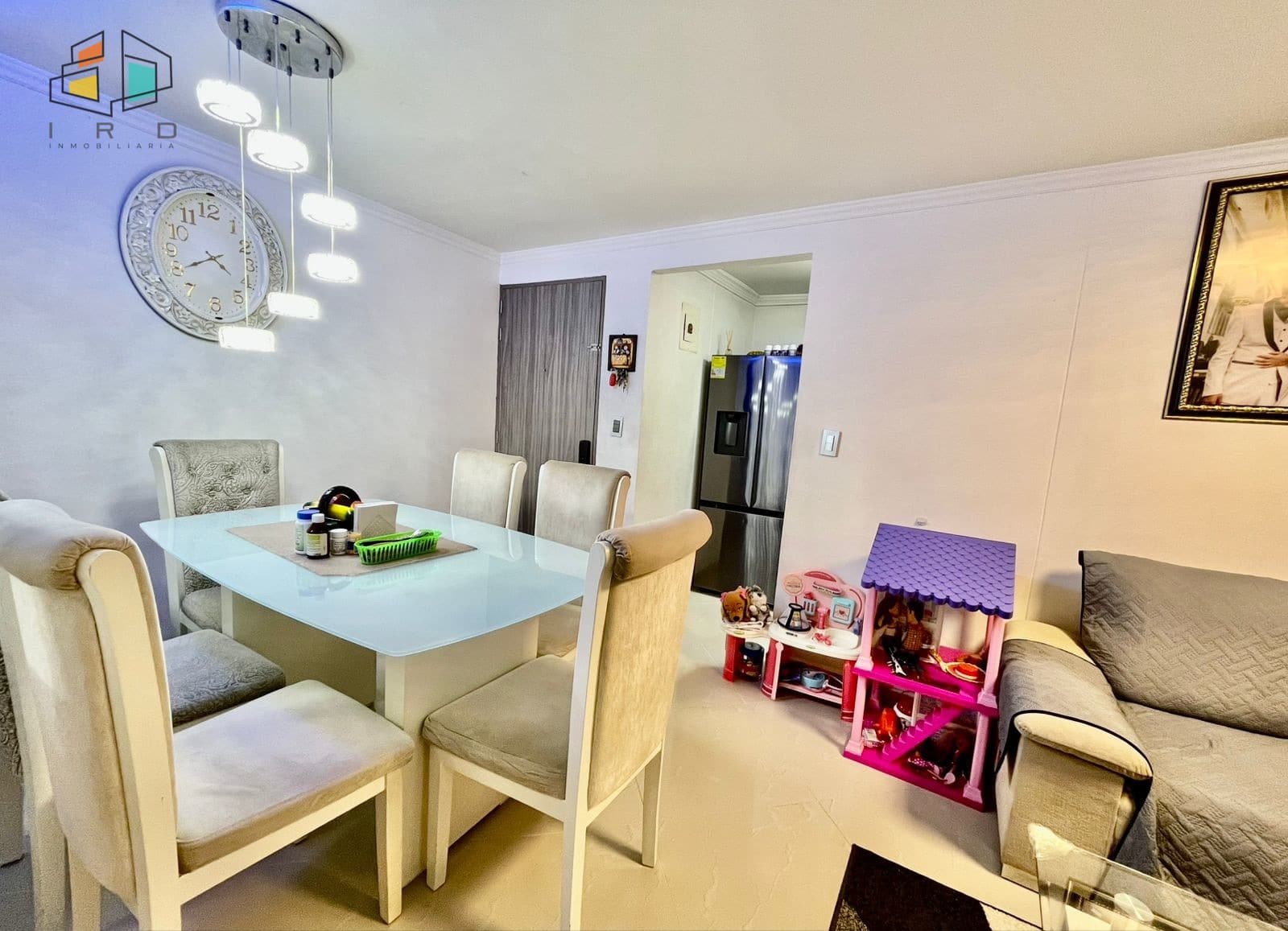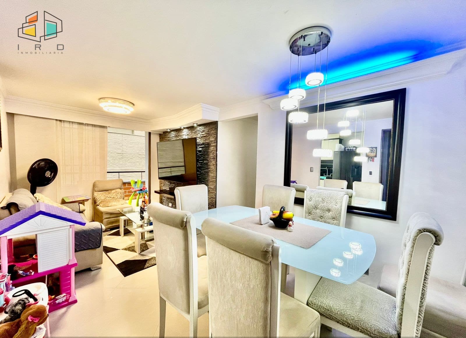 Sala Comedor: Amplia sala comedor con pisos en cerámica e iluminación LED que brindan un ambiente moderno y acogedor.