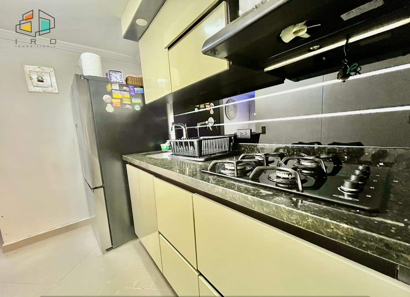 Cocina Integral: Cocina moderna completamente equipada con gabinetes superiores e inferiores de mármol y madera, campana extractora y cubierta de 4 puestos a gas, diseñada para tu comodidad.