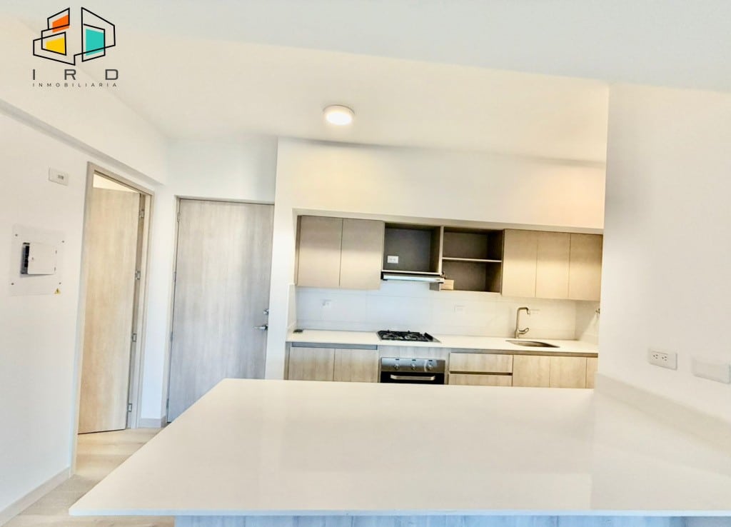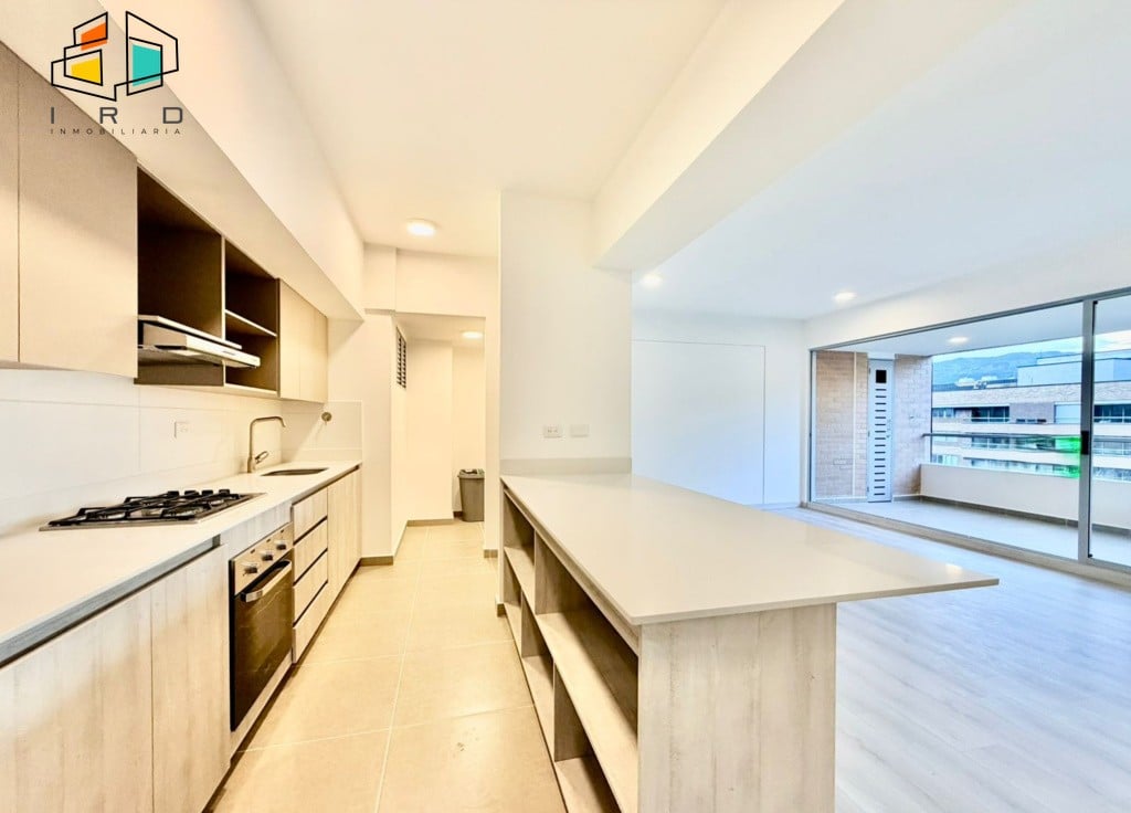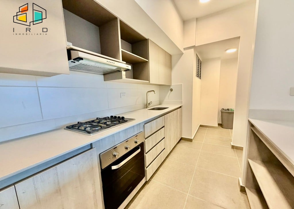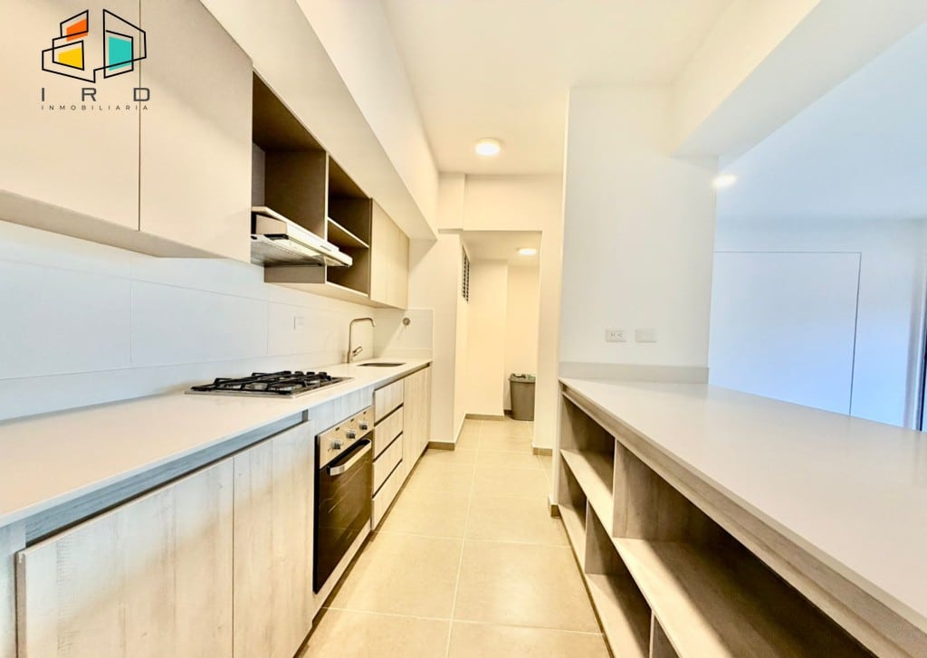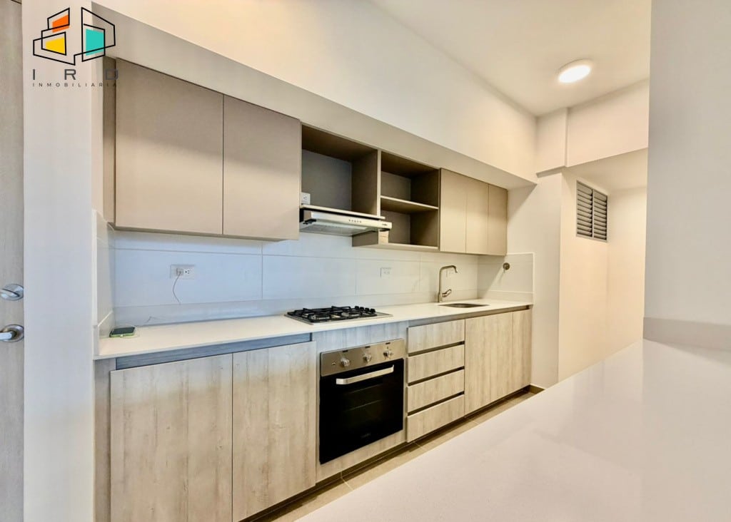 La cocina integral de concepto abierto es una obra maestra de diseño moderno, equipada con gabinetes superiores e inferiores en acabados de madera, horno, campana extractora y una cubierta de cuatro puestos a gas. Su barra americana integra armoniosamente con el área social, perfecta para el entretenimiento. La zona de ropas incluye un calentador de agua para mayor conveniencia.