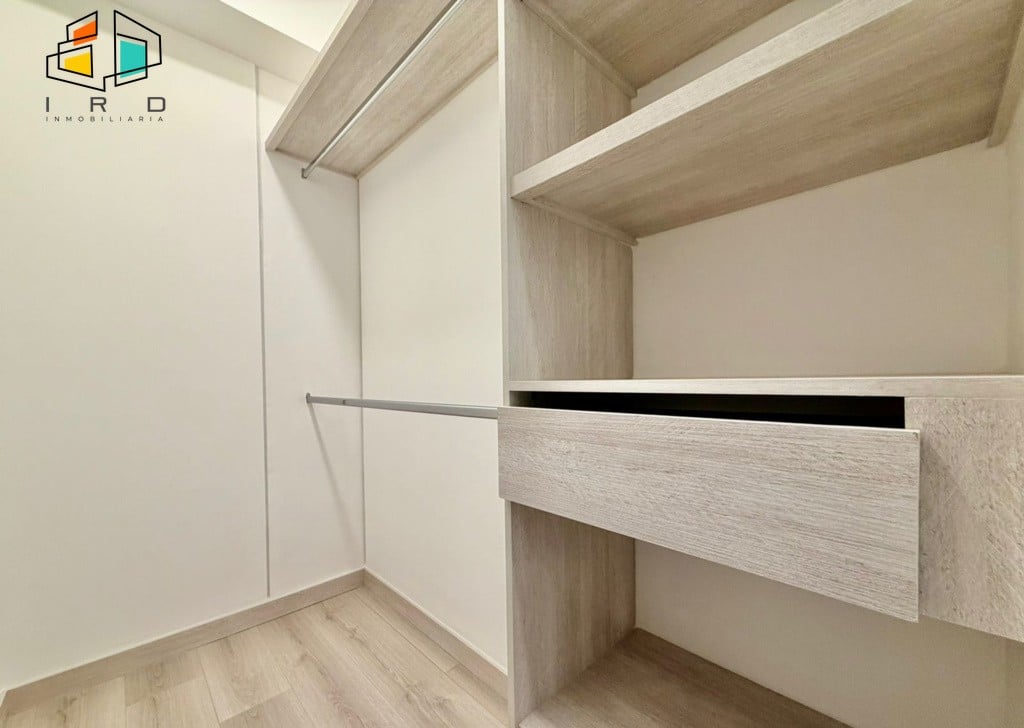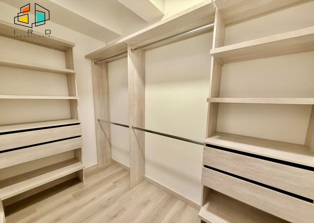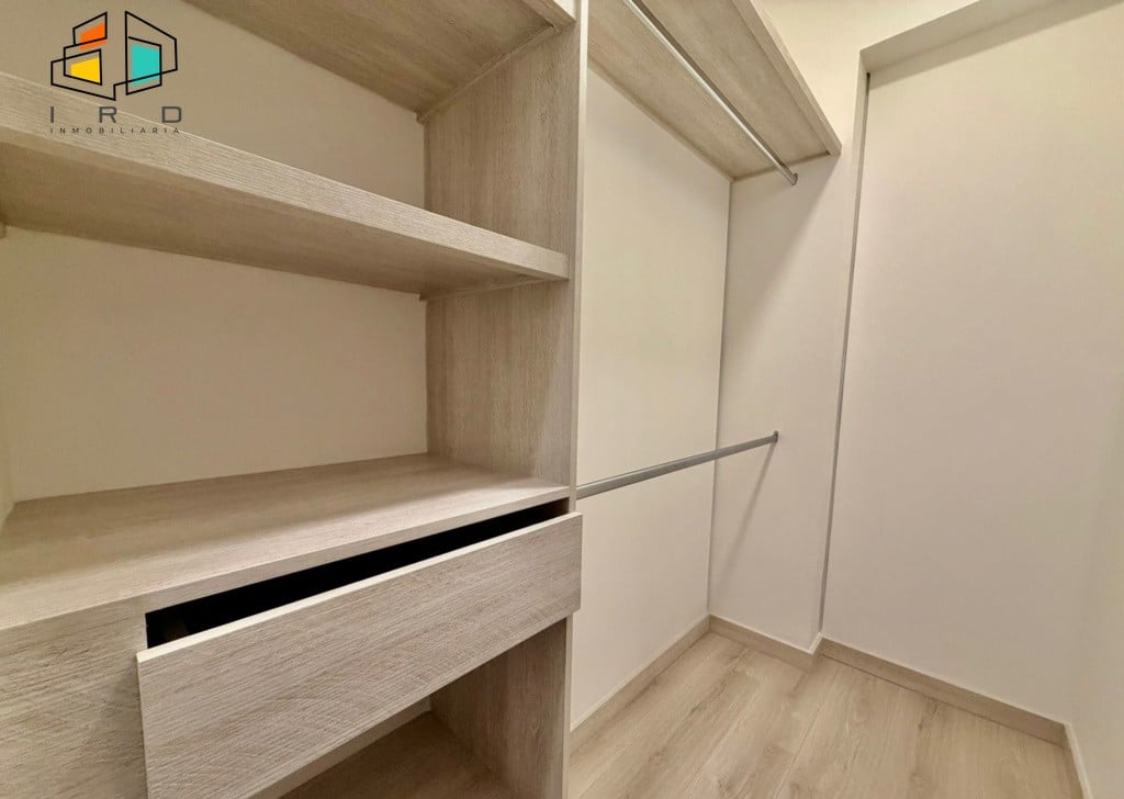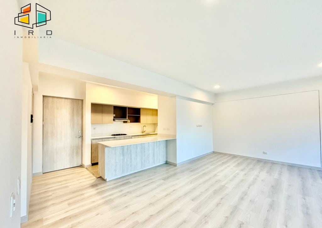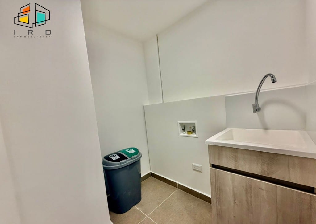 La cocina integral de concepto abierto es una obra maestra de diseño moderno, equipada con gabinetes superiores e inferiores en acabados de madera, horno, campana extractora y una cubierta de cuatro puestos a gas. Su barra americana integra armoniosamente con el área social, perfecta para el entretenimiento. La zona de ropas incluye un calentador de agua para mayor conveniencia.