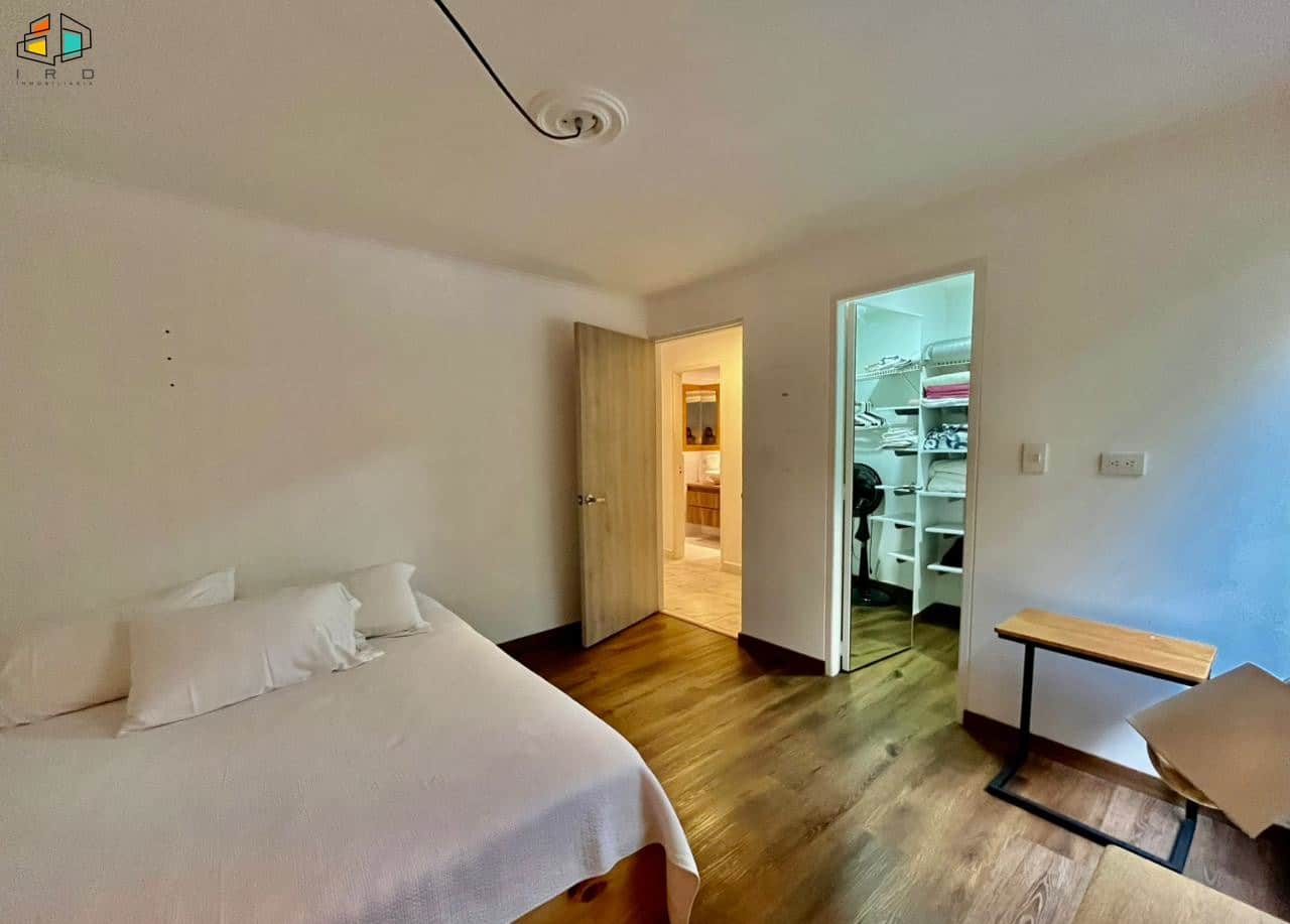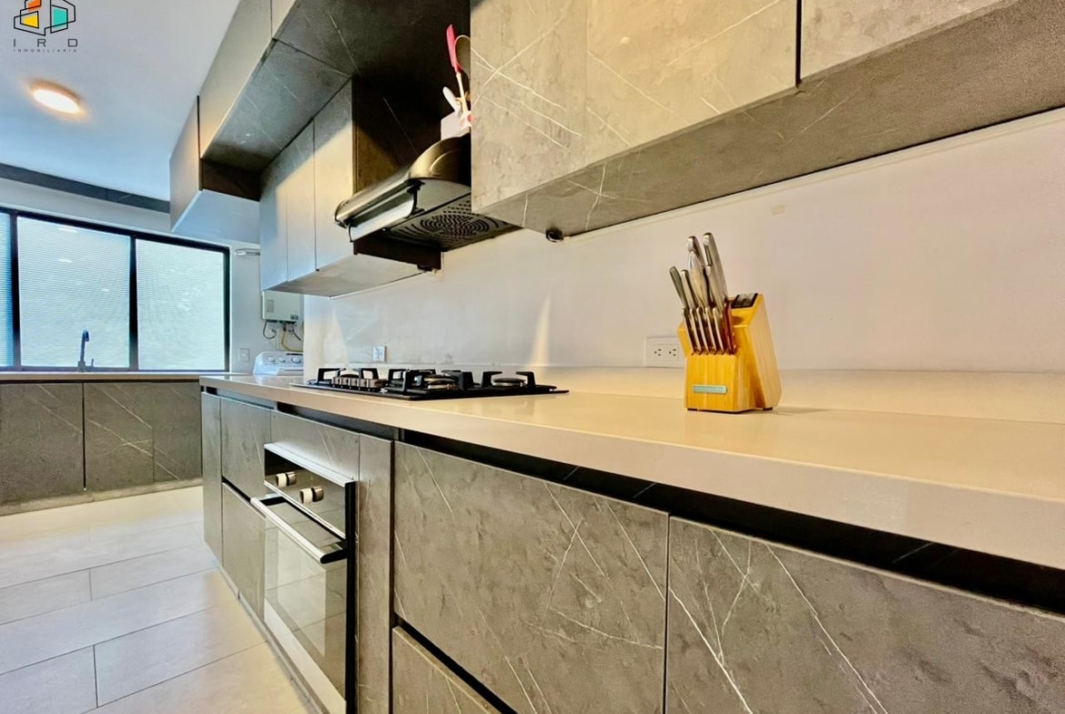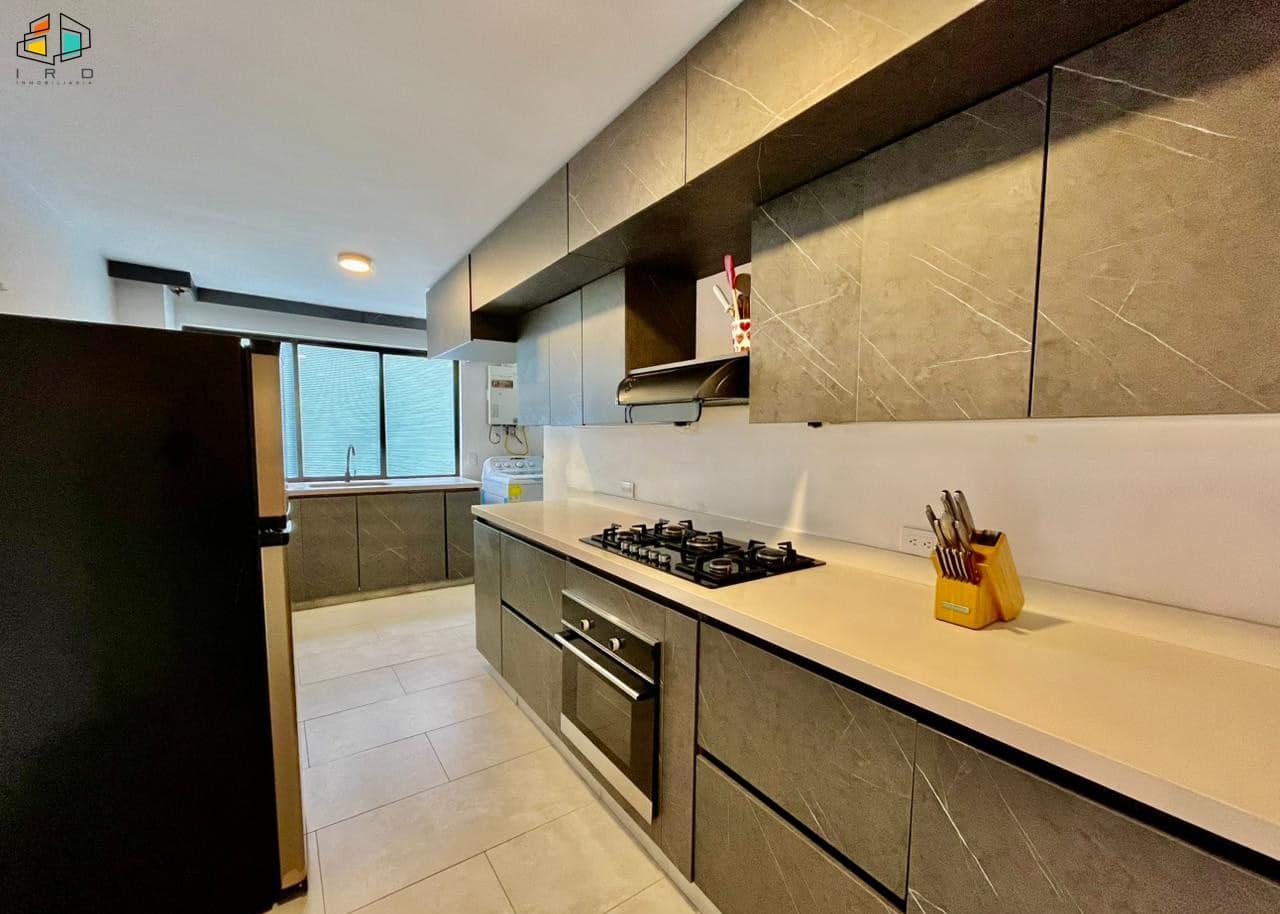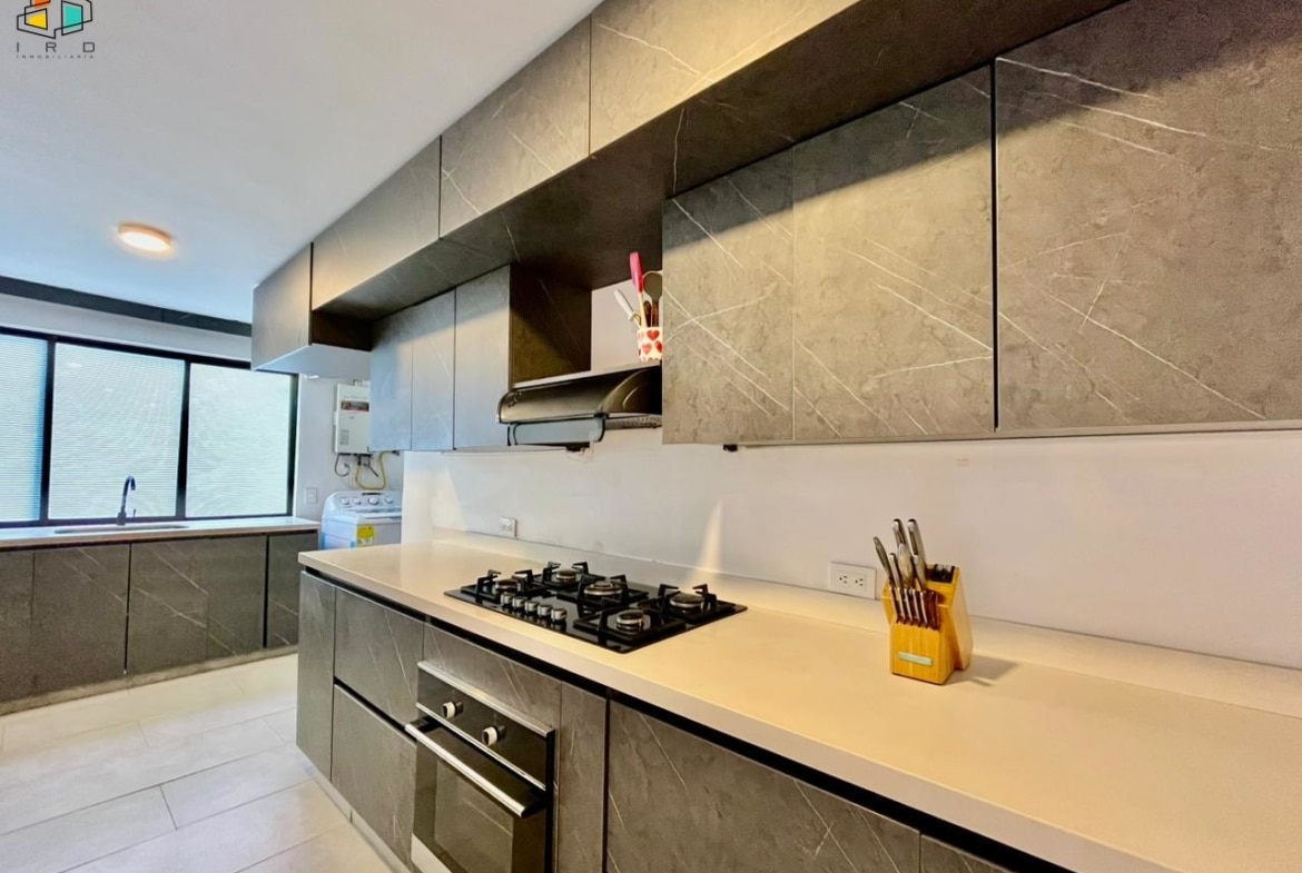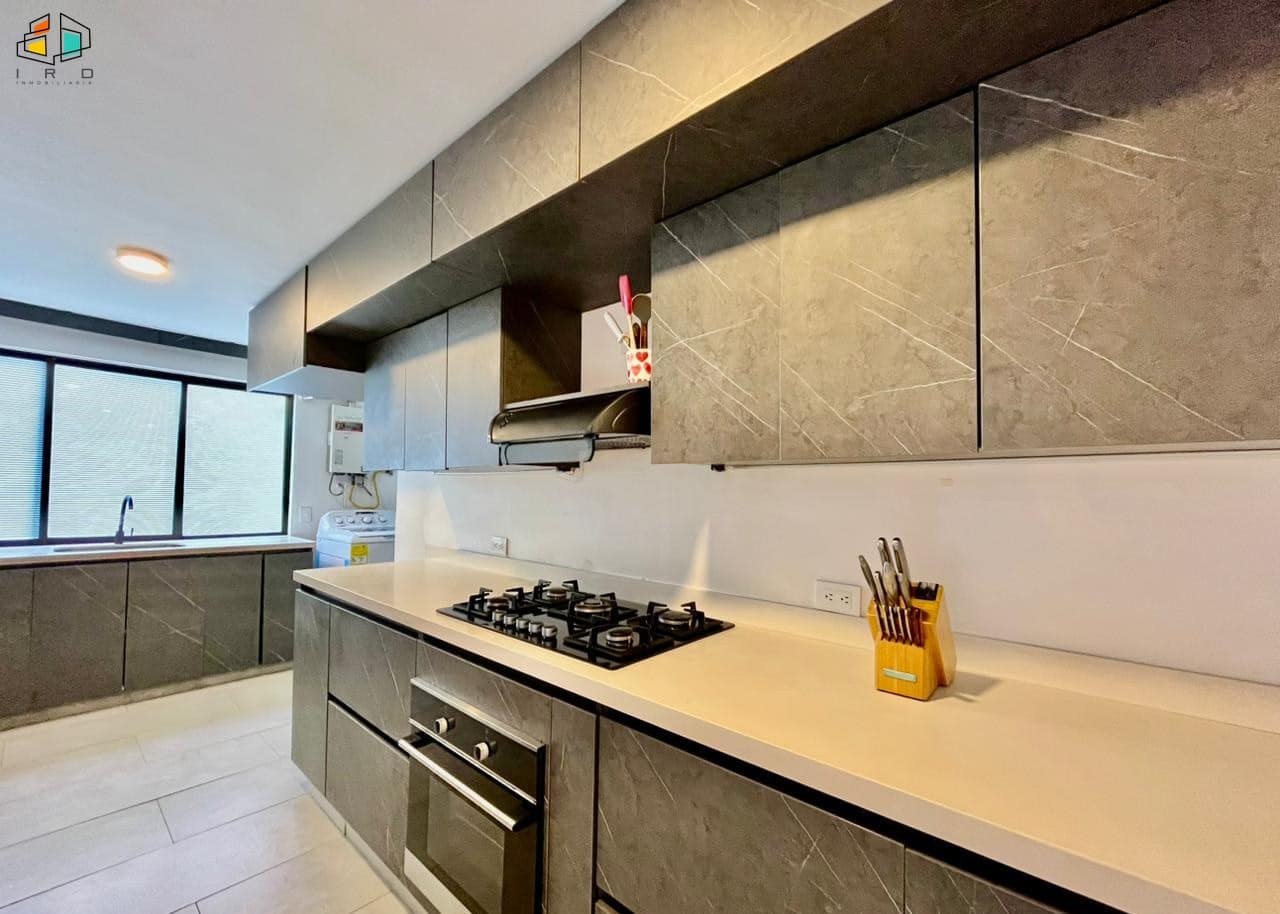 Características del apartamento: – 3 habitaciones: la principal con baño privado y vestier; una auxiliar con vestier y otra con clóset. Todas cuentan con persianas Sheer Elegance. – 2 baños en total, incluyendo el social. – Sala–comedor con pisos de cerámica e iluminación LED y natural, creando un ambiente acogedor. – Cocina integral de concepto abierto, equipada con gabinetes superiores e inferiores, horno, campana extractora y cubierta a gas de 4 puestos. Diseño moderno y totalmente terminada. – Zona de ropas independiente, equipada con calentador de agua. Adicionales: – Hall de alcobas. 2 parqueaderos lineales. 2 cuartos útiles.