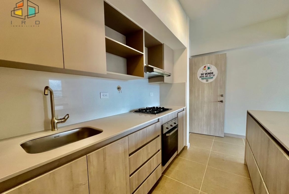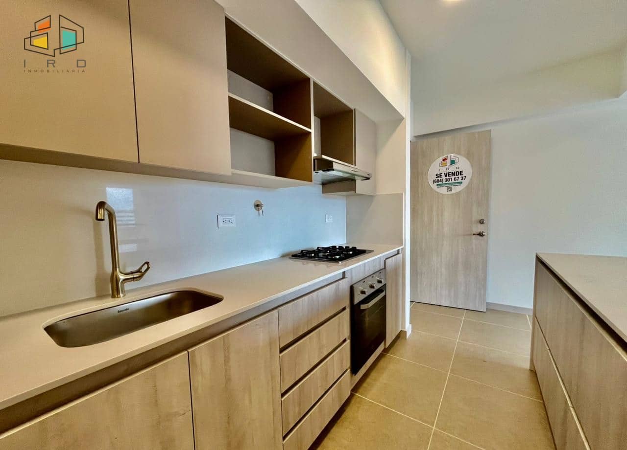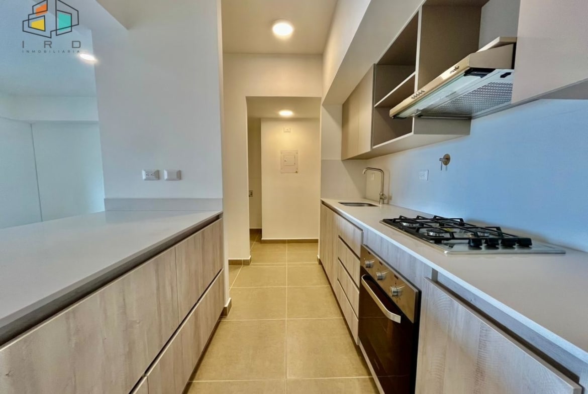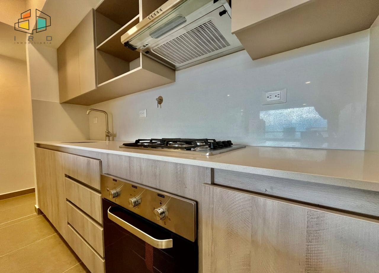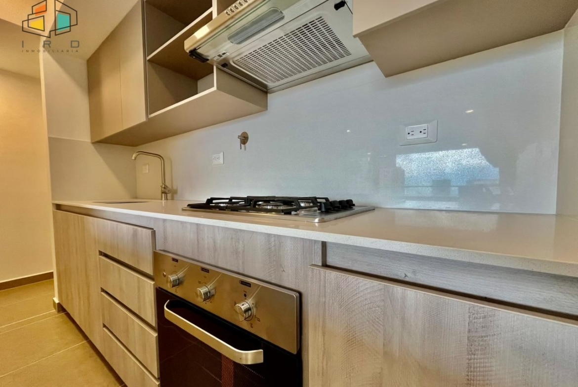 * La cocina es integral y de concepto abierto, equipada con gabinetes tanto superiores como inferiores, horno, campana extractora y una estufa de gas de 4 puestos. La barra americana se integra con el área social.